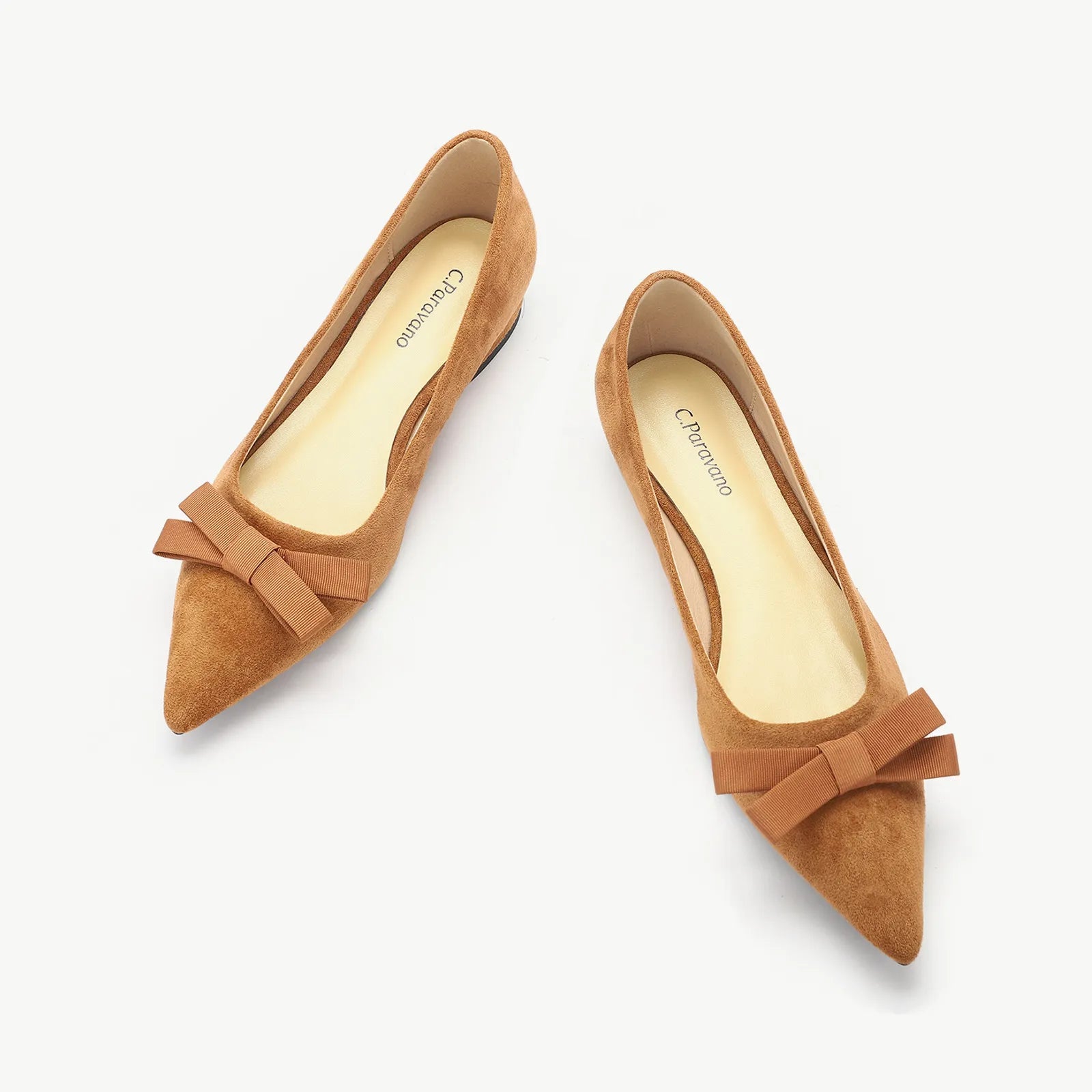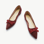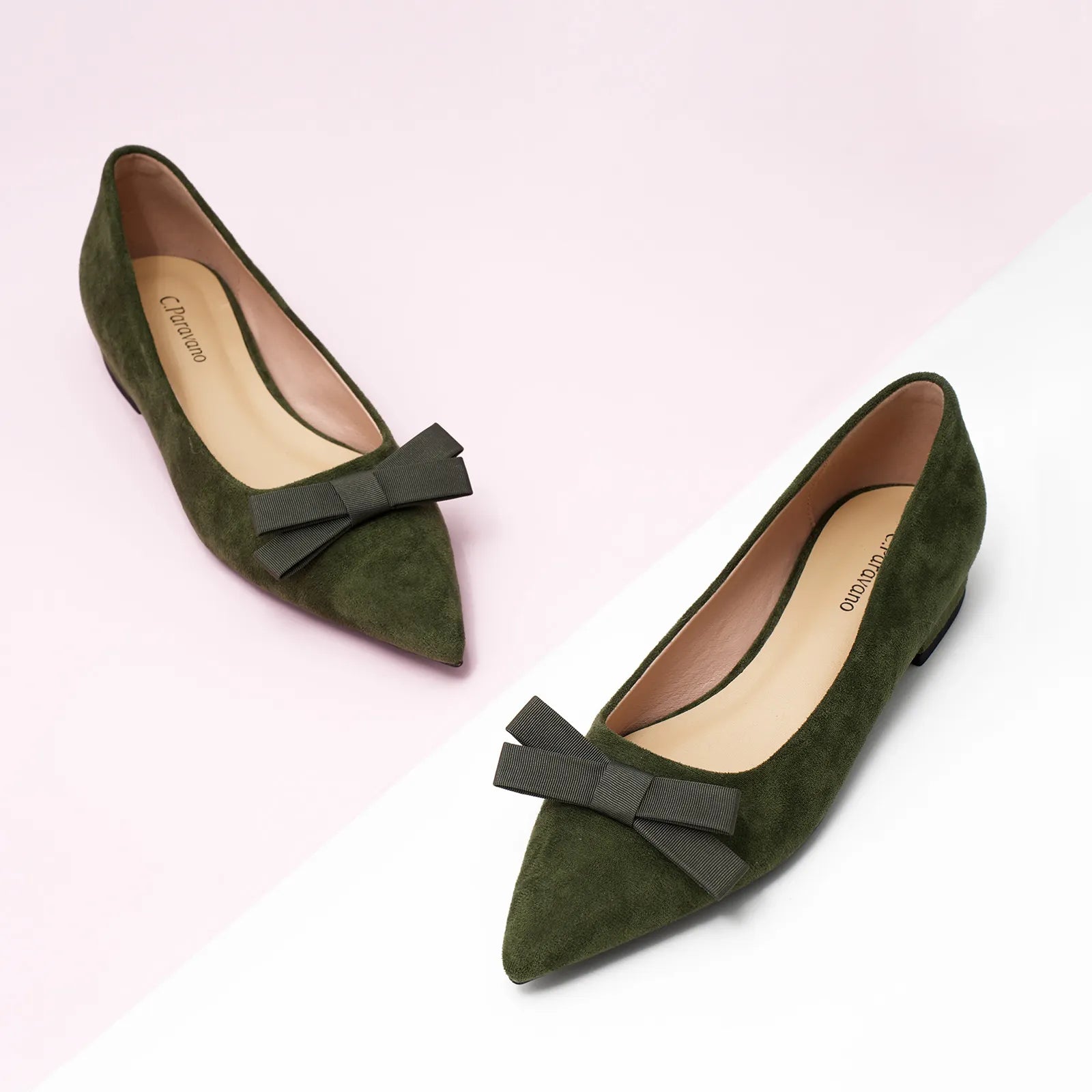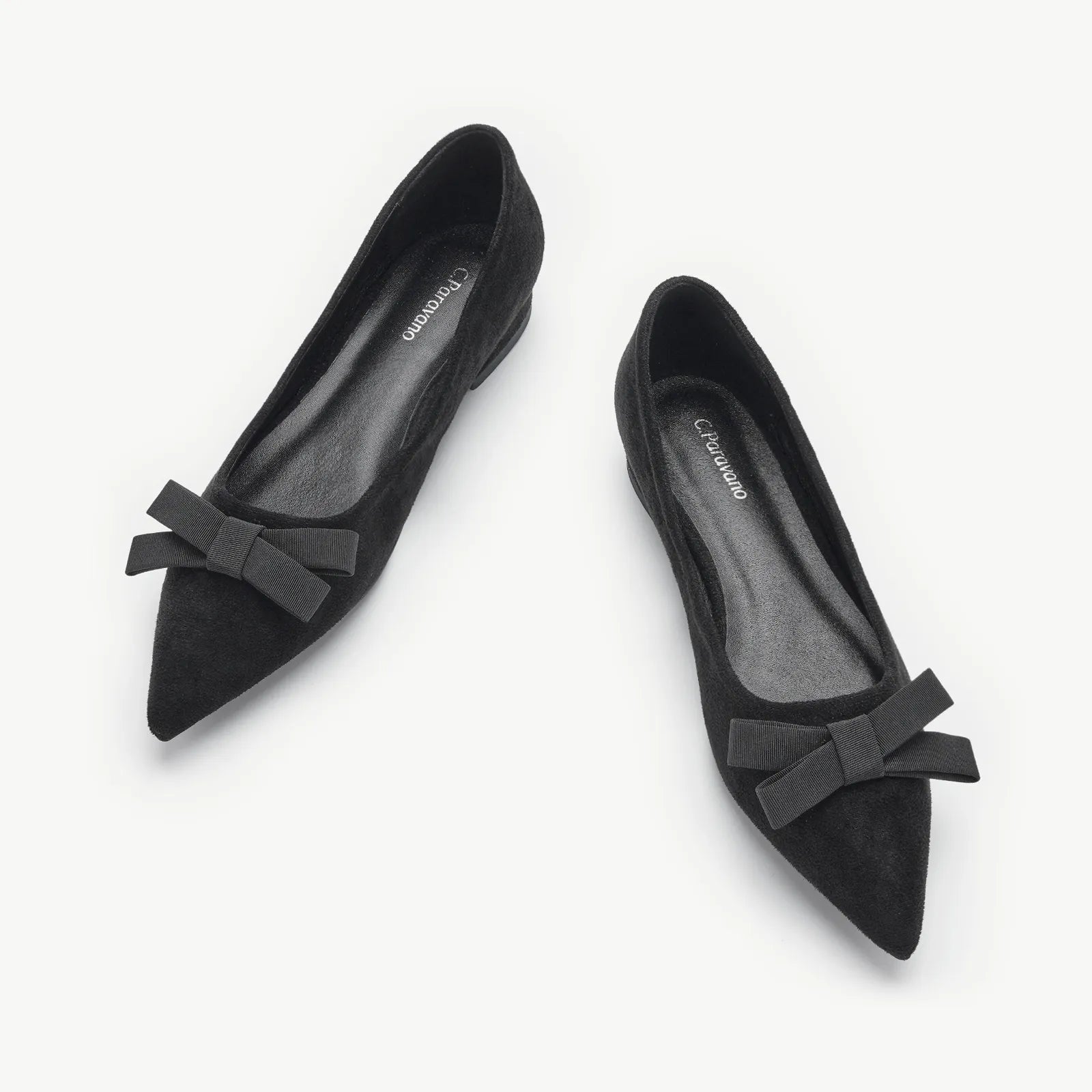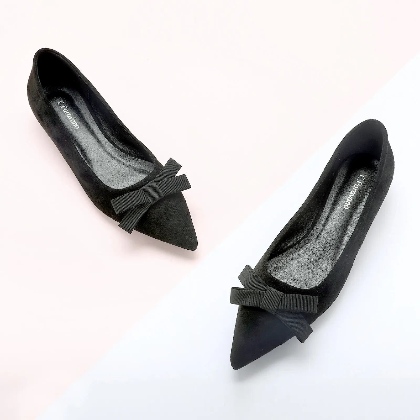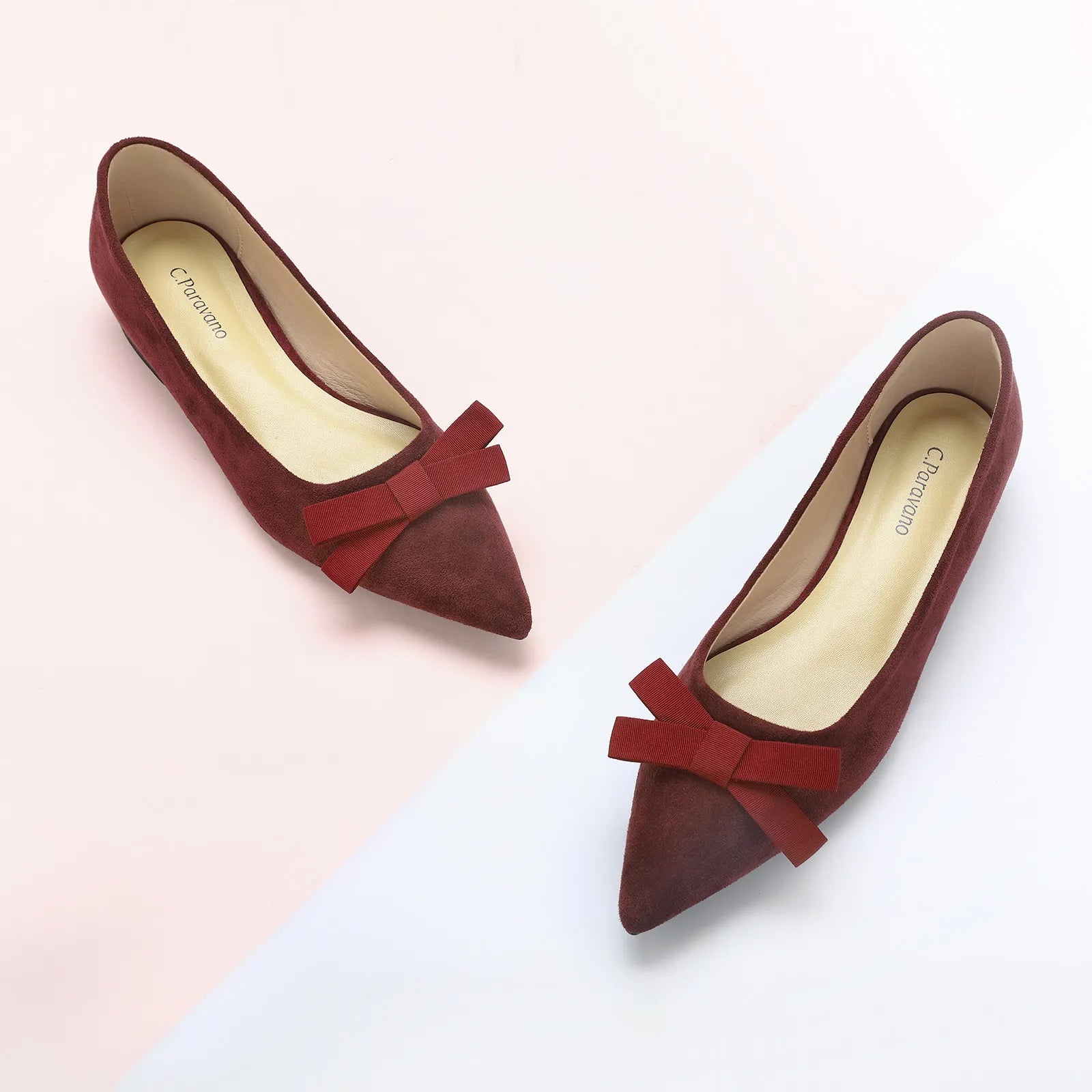 If you find the leather style overly ubiquitous, here is a superior option: these suede flats. They can infuse your ensemble with a refined elegance, boasting a chic pointed-toe silhouette that has a flattering leg-lengthening effect. With a dainty bow at the vamp and a grippy sole adorned with iconic prints, they add a timeless touch of charm.