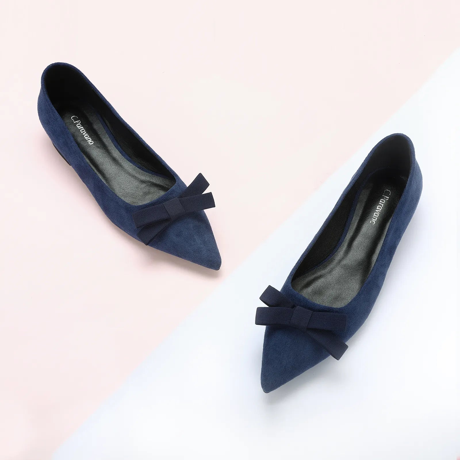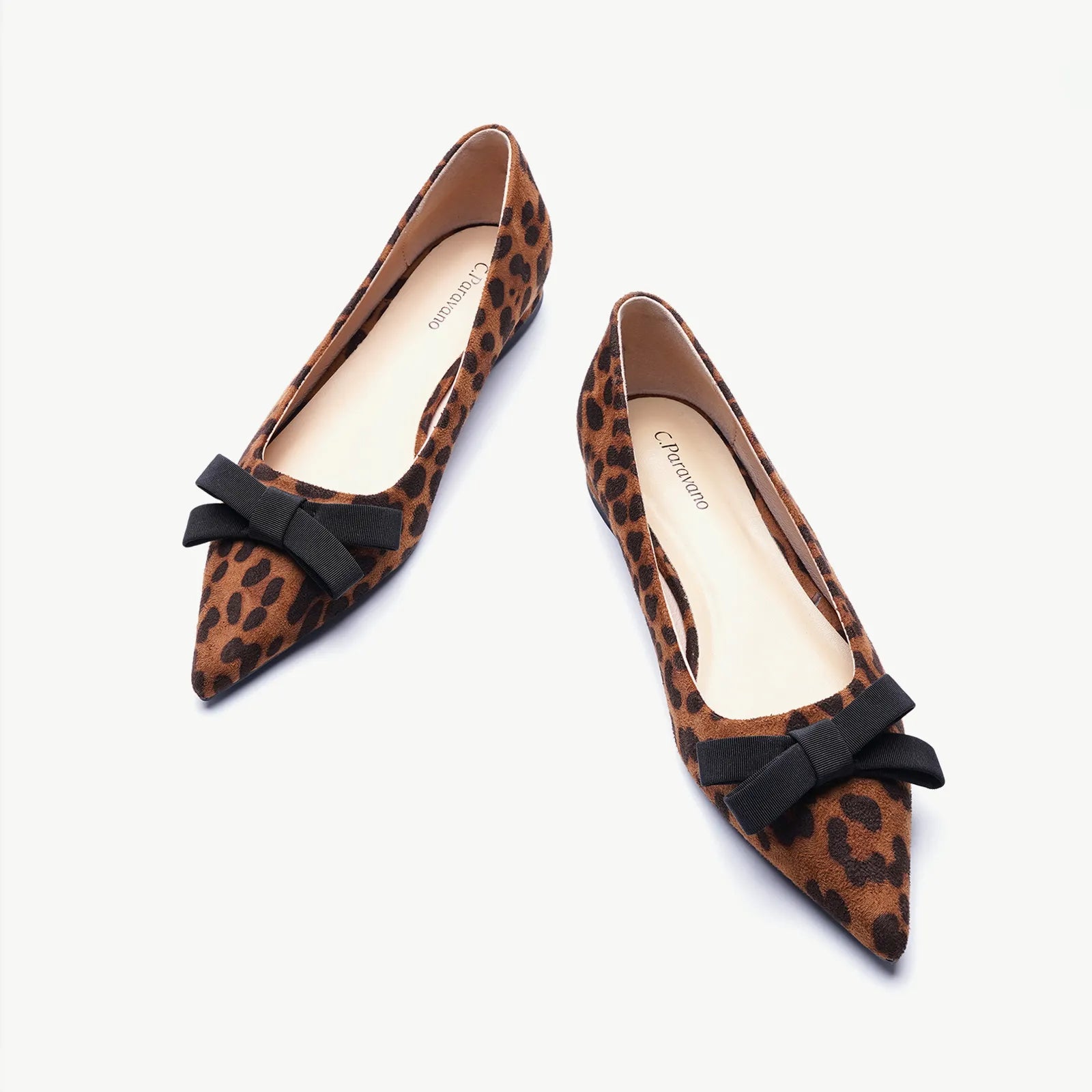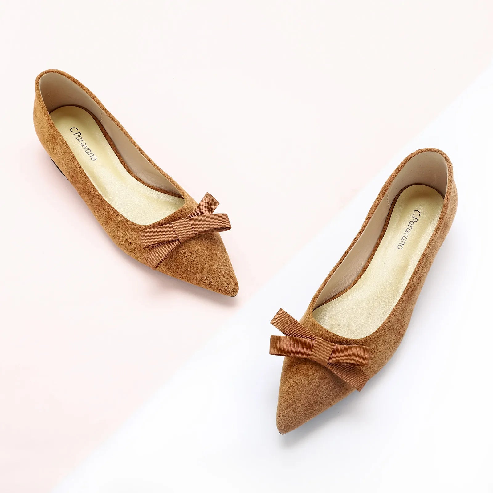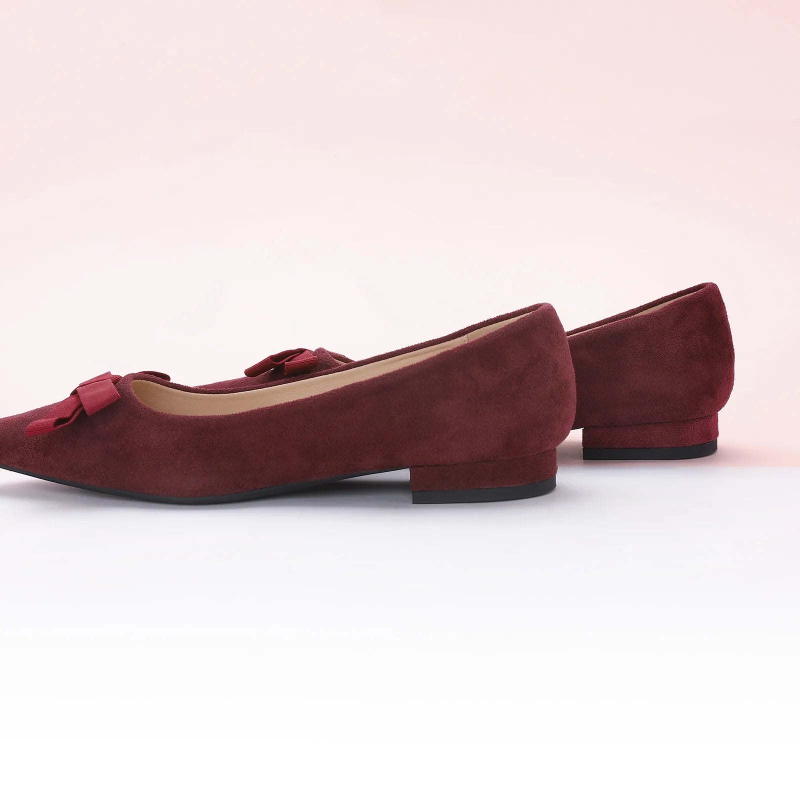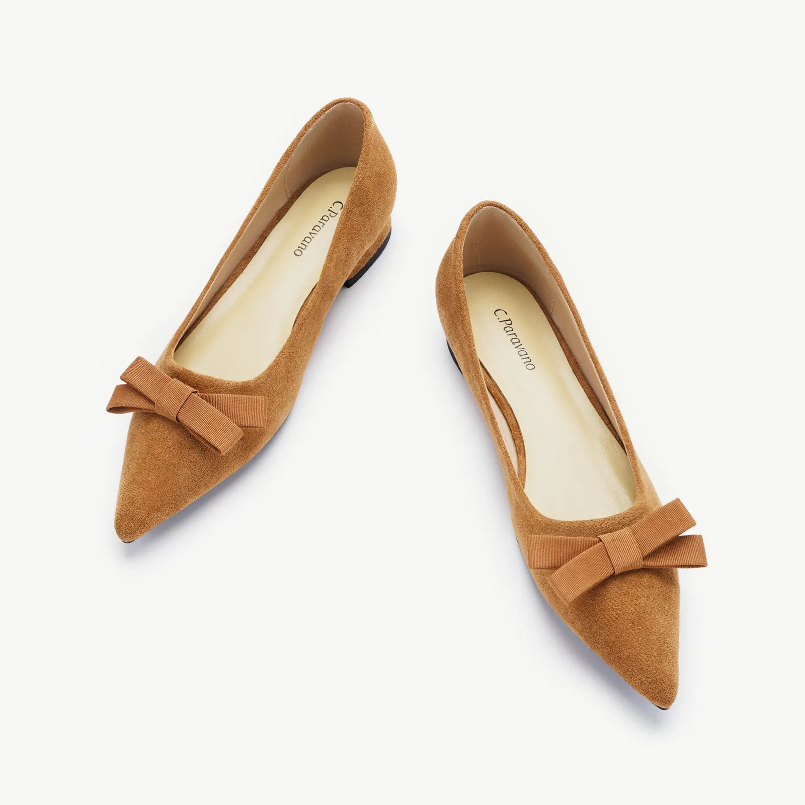 If you find the leather style overly ubiquitous, here is a superior option: these suede flats. They can infuse your ensemble with a refined elegance, boasting a chic pointed-toe silhouette that has a flattering leg-lengthening effect. With a dainty bow at the vamp and a grippy sole adorned with iconic prints, they add a timeless touch of charm.