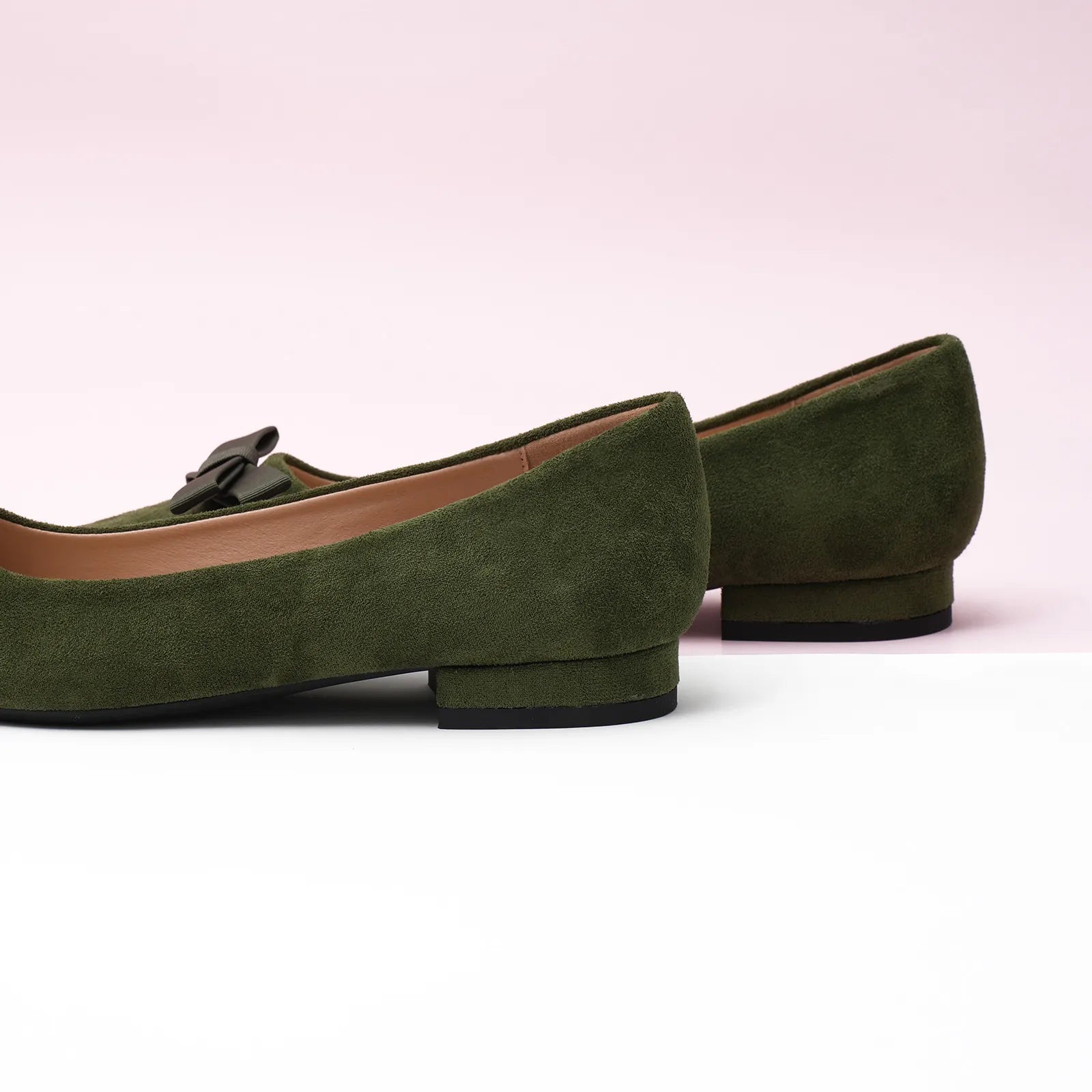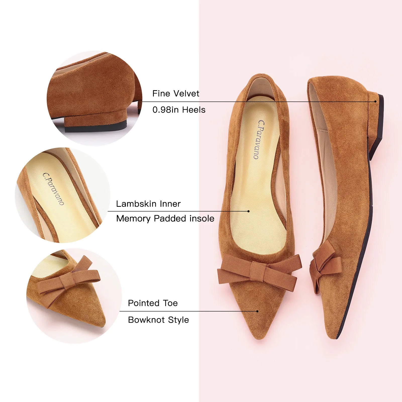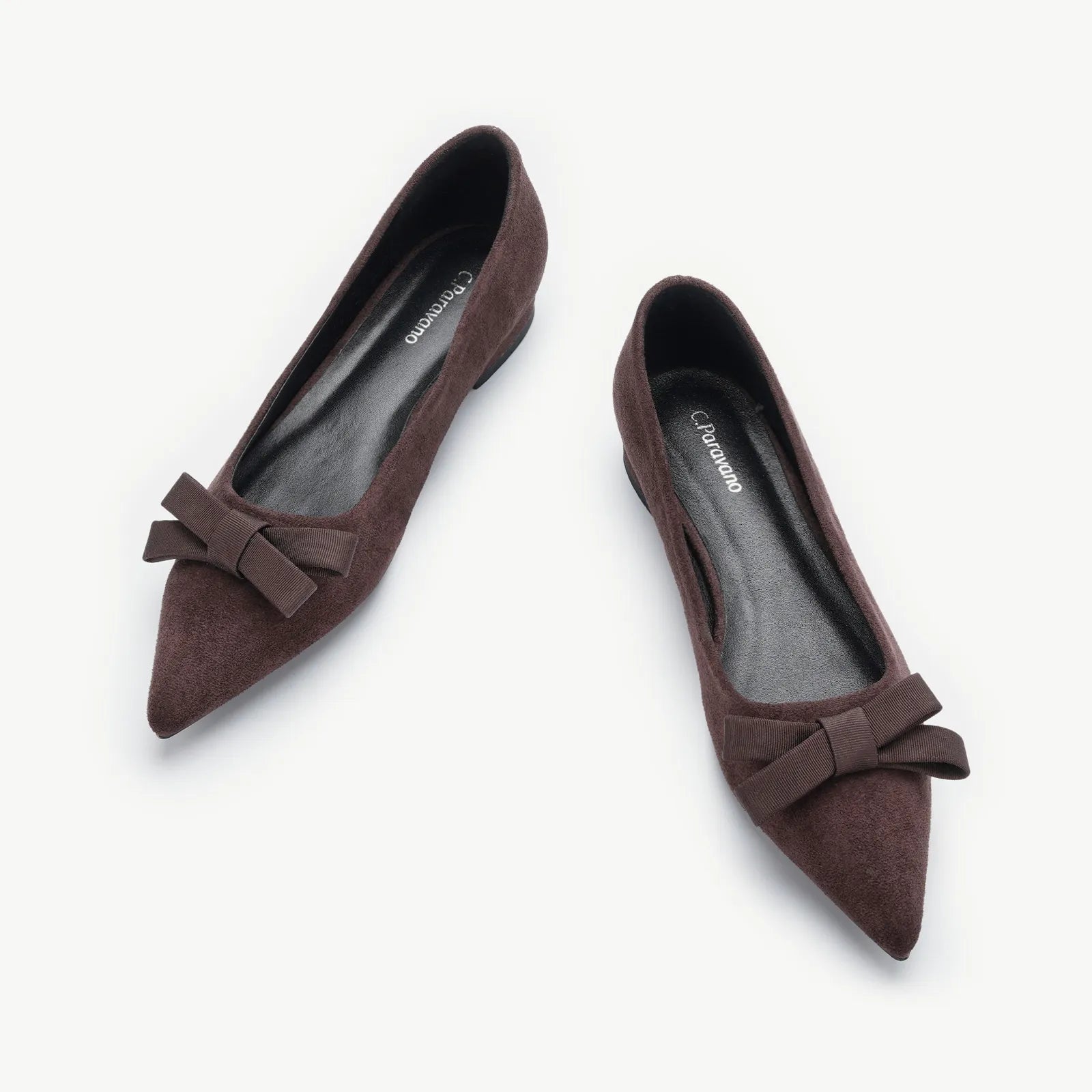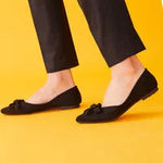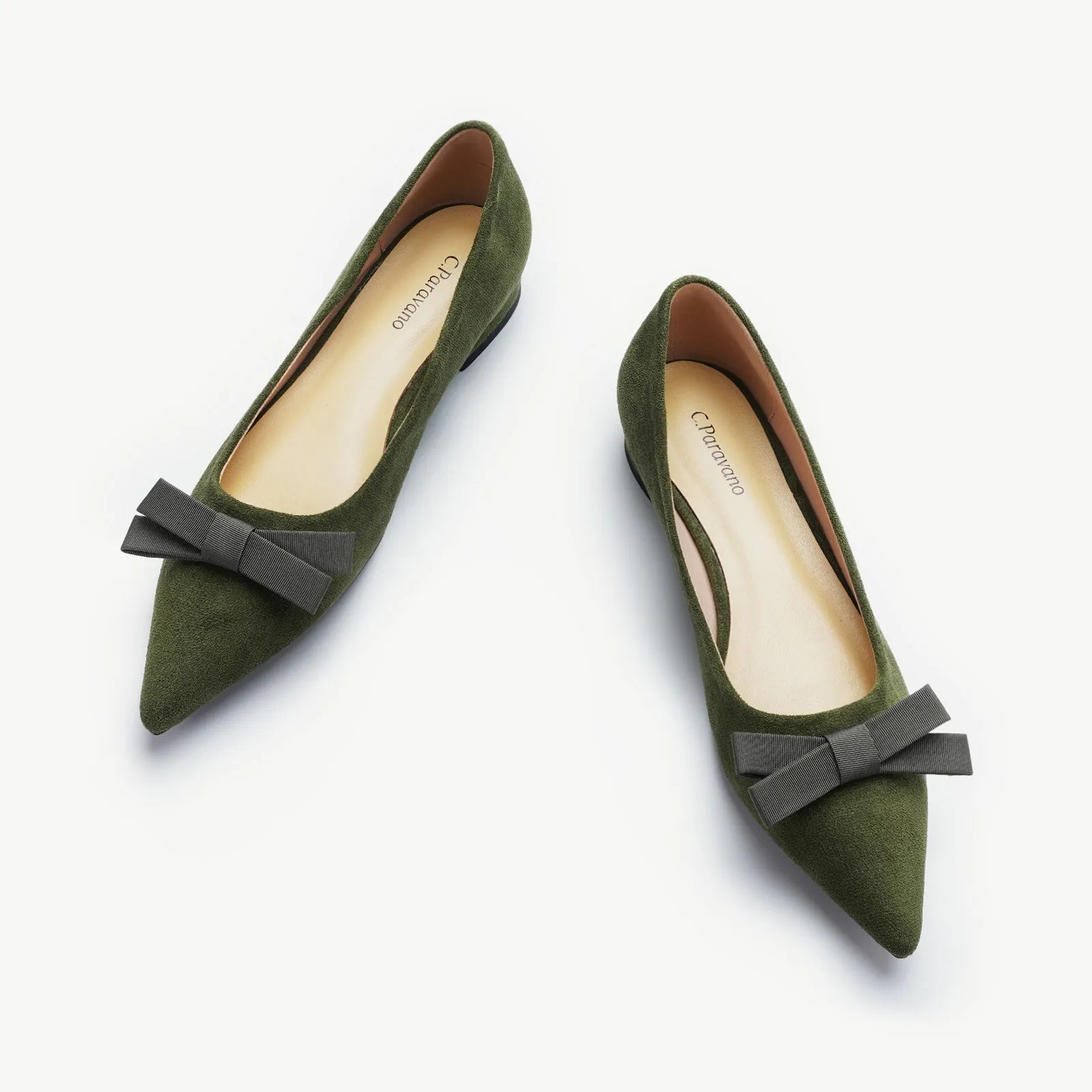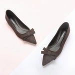 If you find the leather style overly ubiquitous, here is a superior option: these suede flats. They can infuse your ensemble with a refined elegance, boasting a chic pointed-toe silhouette that has a flattering leg-lengthening effect. With a dainty bow at the vamp and a grippy sole adorned with iconic prints, they add a timeless touch of charm.