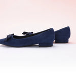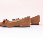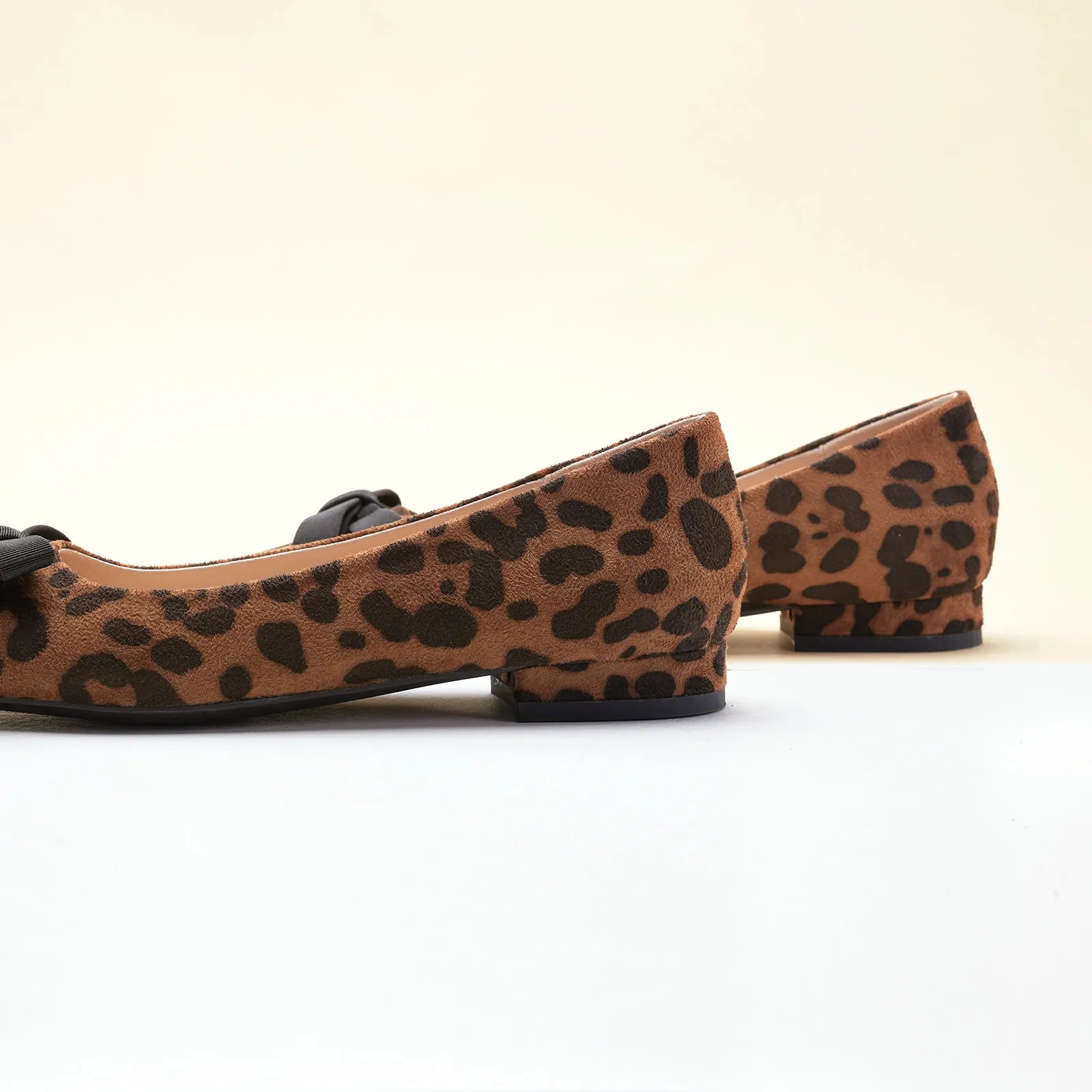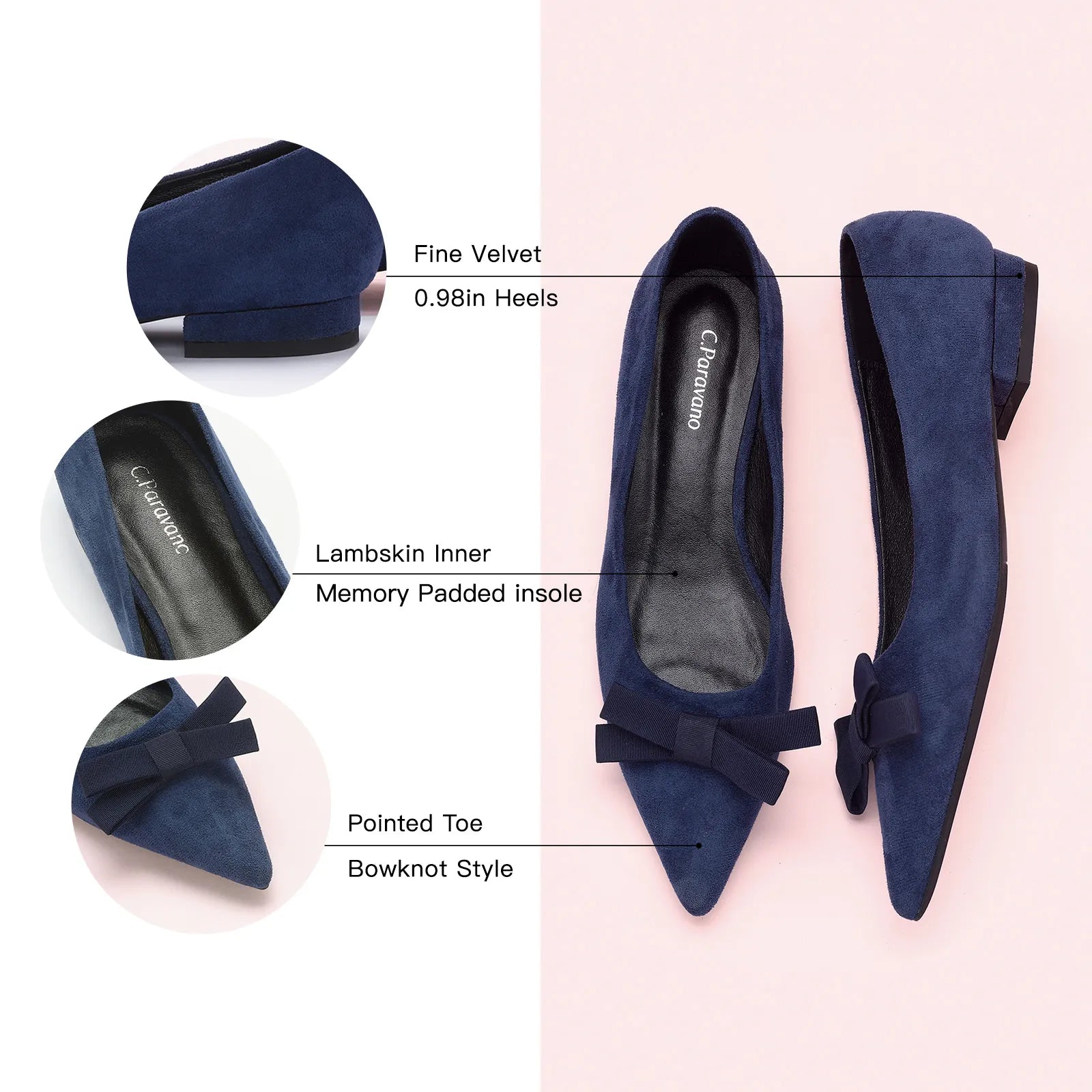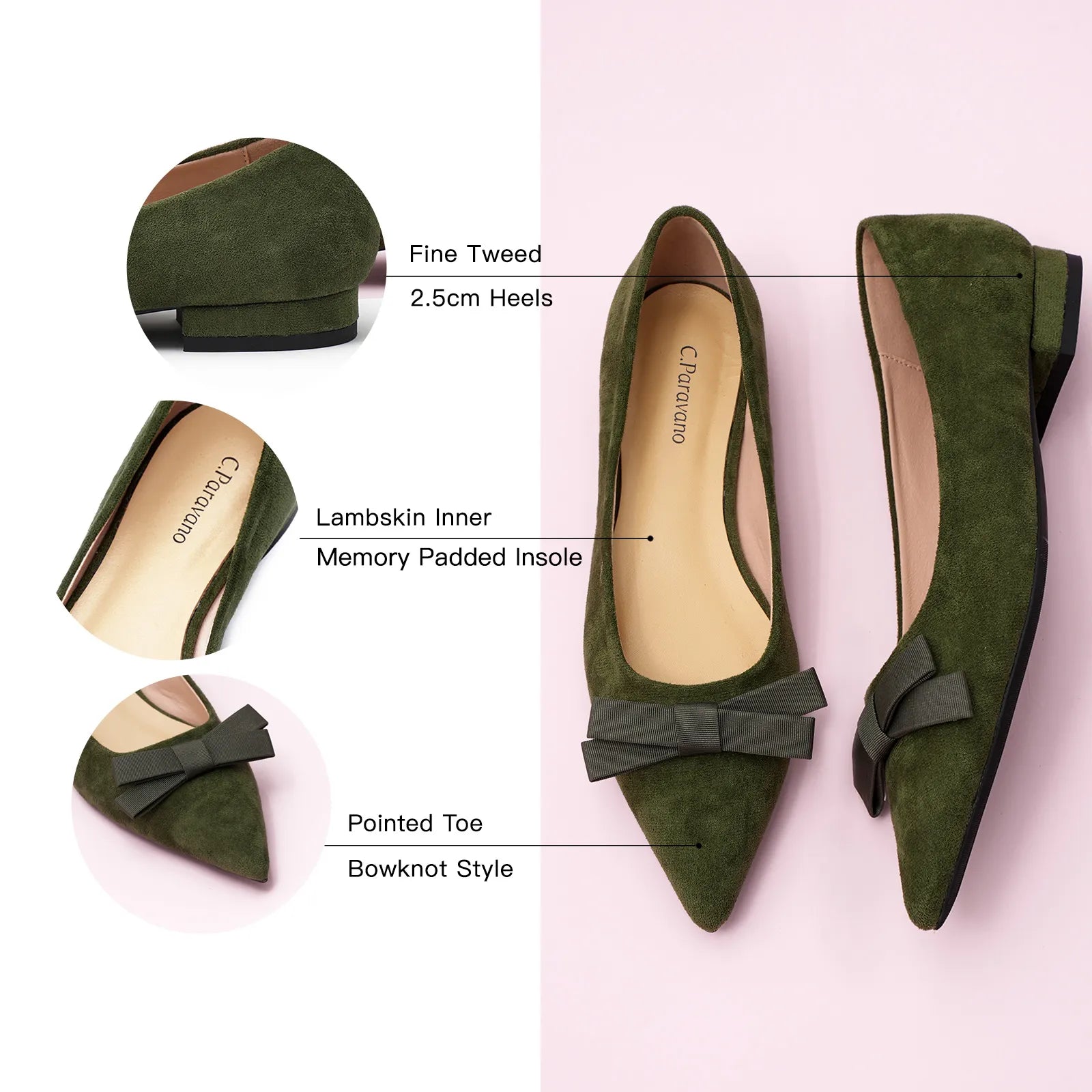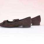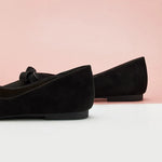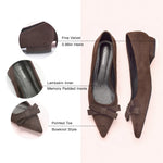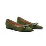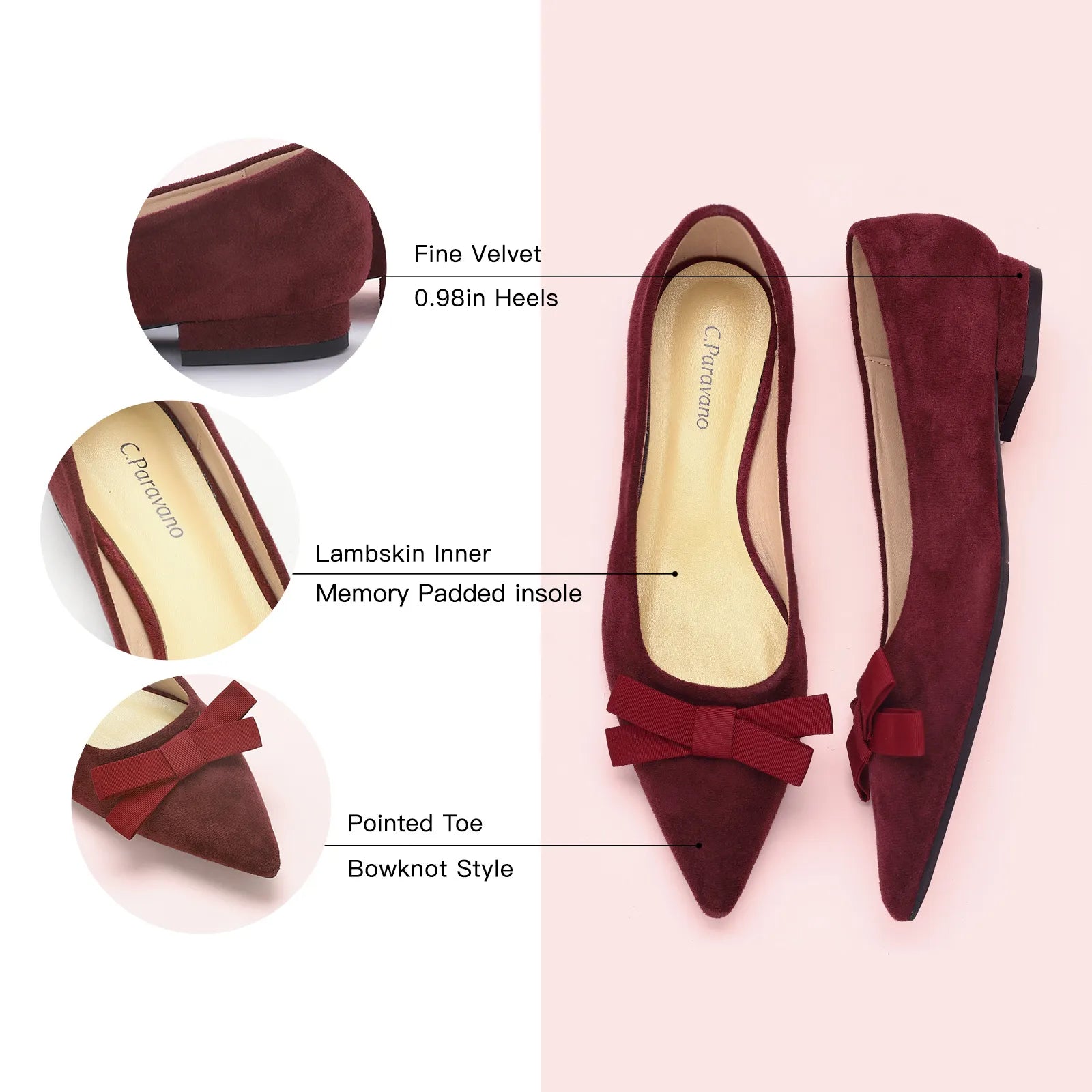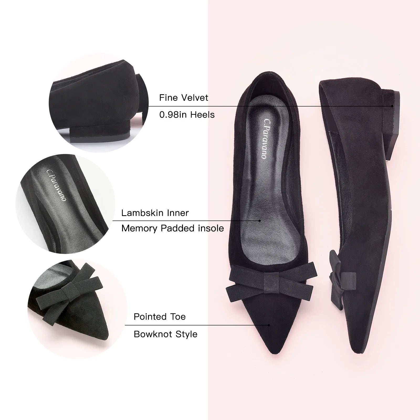 If you find the leather style overly ubiquitous, here is a superior option: these suede flats. They can infuse your ensemble with a refined elegance, boasting a chic pointed-toe silhouette that has a flattering leg-lengthening effect. With a dainty bow at the vamp and a grippy sole adorned with iconic prints, they add a timeless touch of charm.