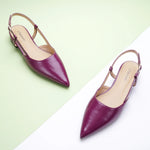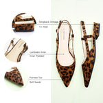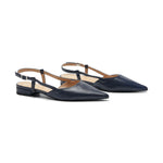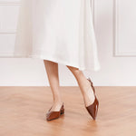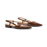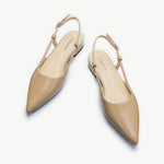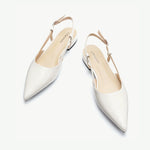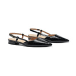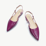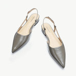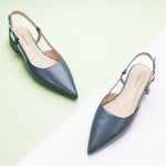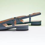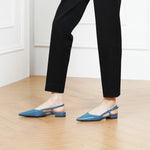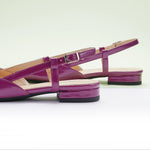 - Crafted from soft leather, this pair is a flat pointed-toe slingback with a 25mm block heel. The shiny leather/luxe print makes the shoes look very textured. The adjustable strap and buckle allows for a wider fit.
