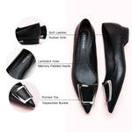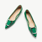 - Embellished with large trapezoidal metal buckles, these simple flats are ideal for daily wear and work. Featuring a pointed-toe design and a vegan leather finish, these elegant flats boast a timeless appeal. With a breathable lambskin lining and a grippy sole adorned with iconic prints, they fit comfortably and are built to last.