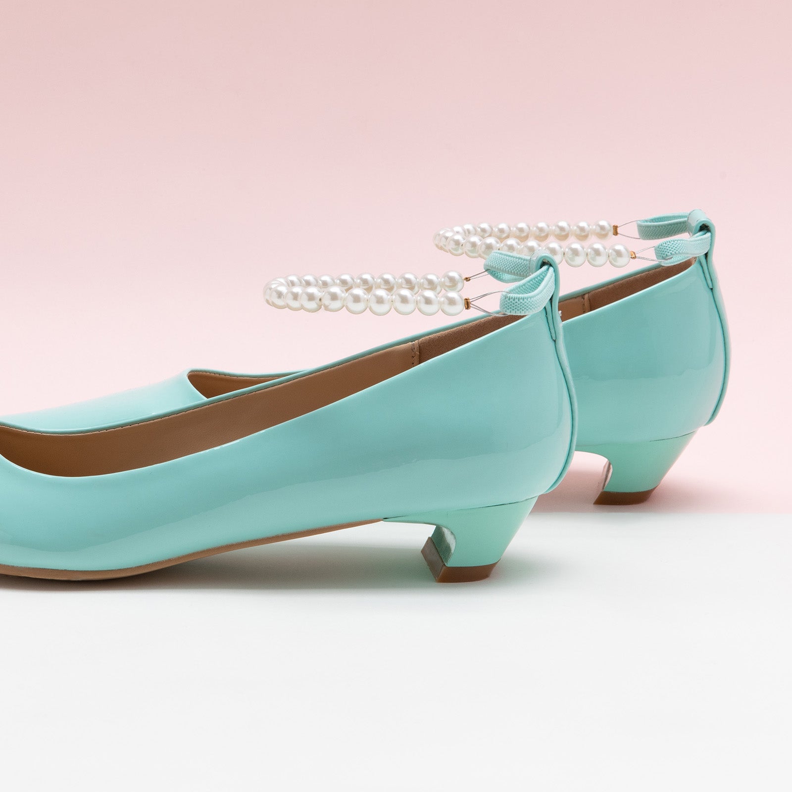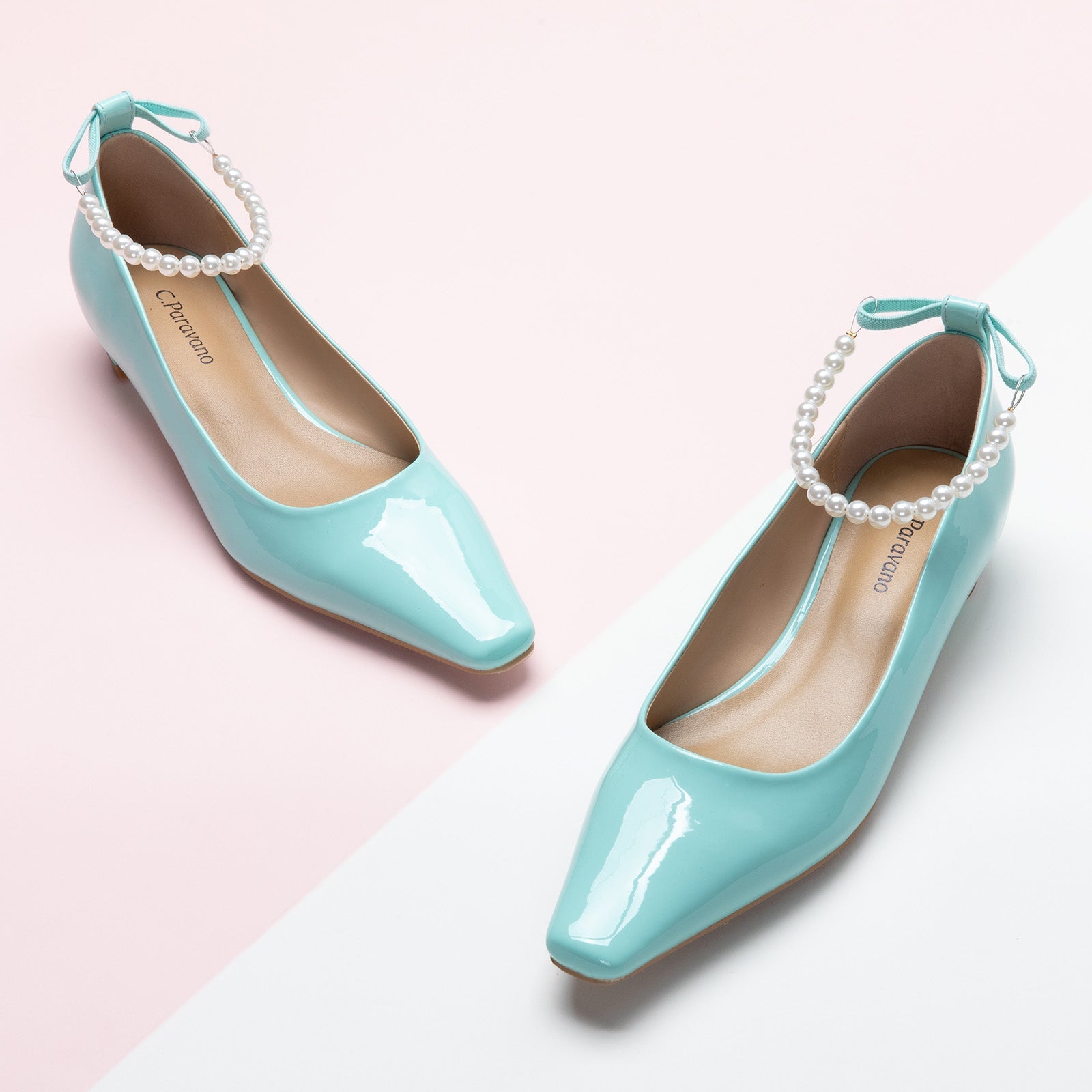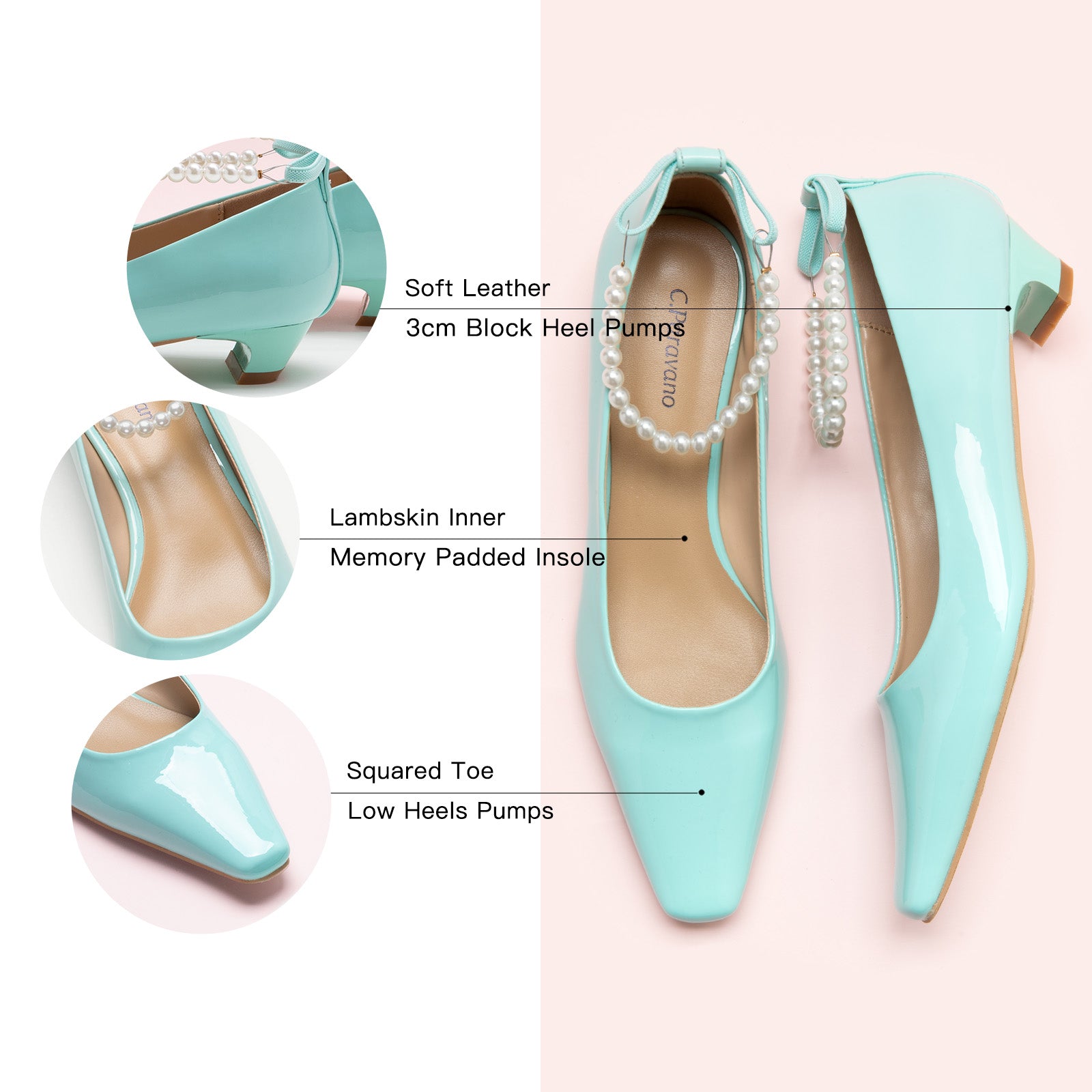 - Made from soft micro fiber leather, the pumps feature squared toes, kitten heels, and embellished with pearl straps at the ankle that instantly catch the eye. Providing comfort while also adding a certain fashion element.