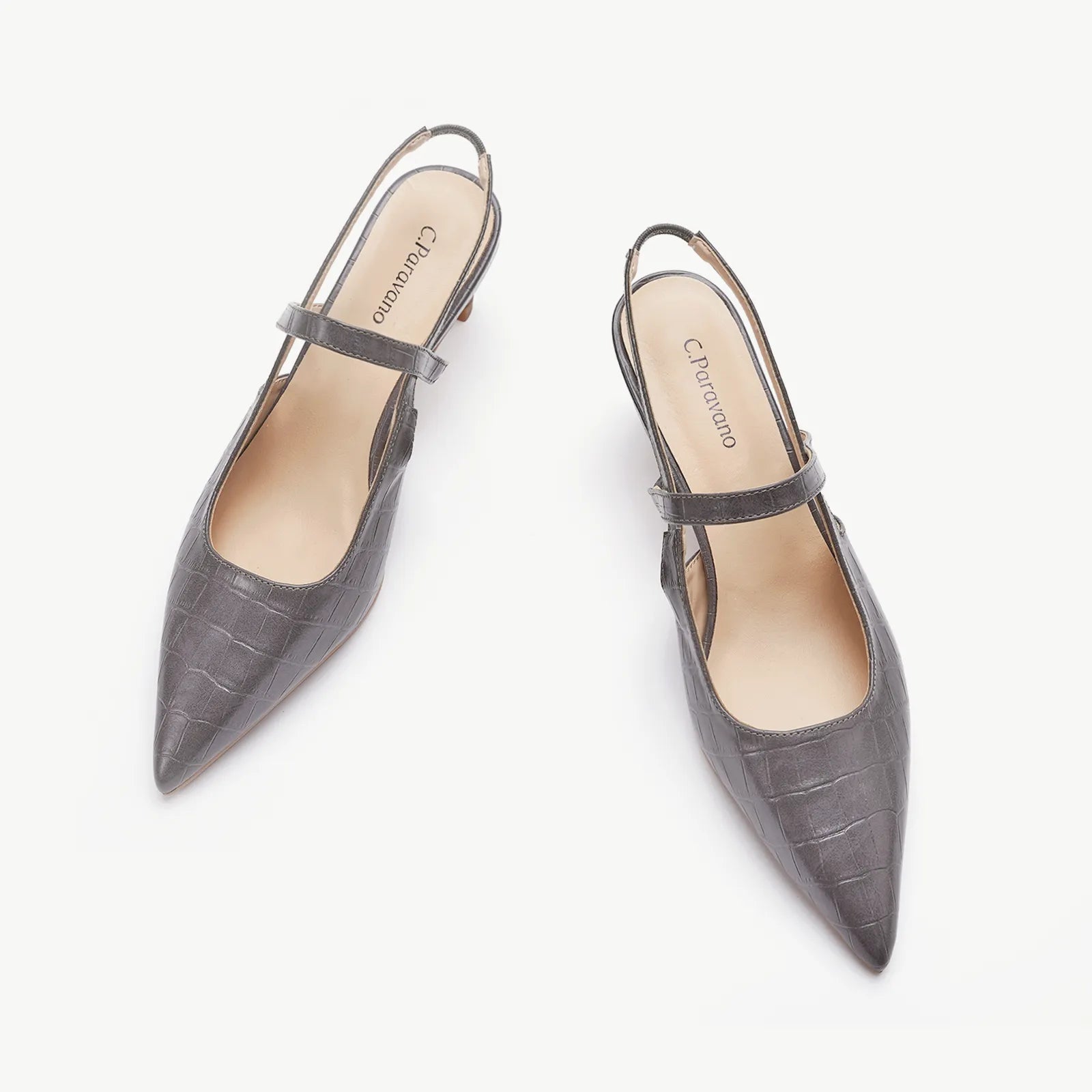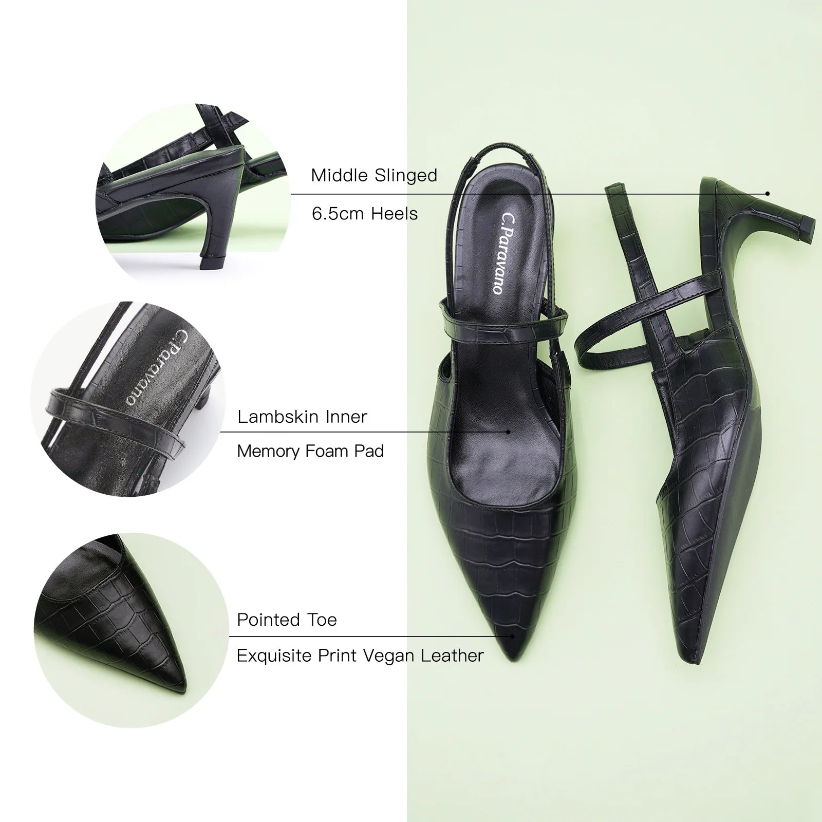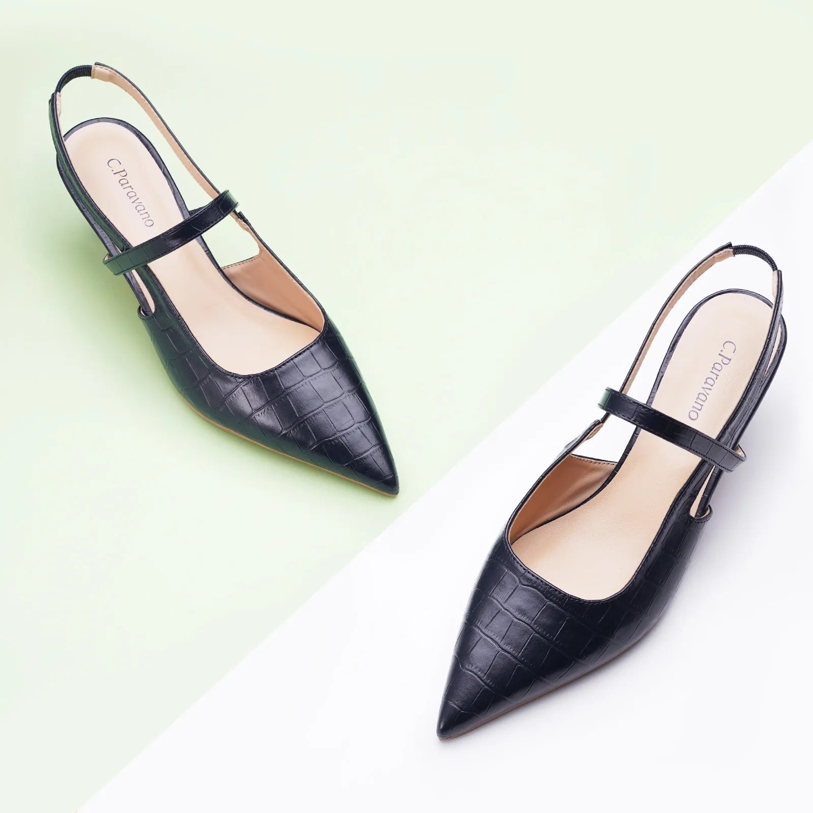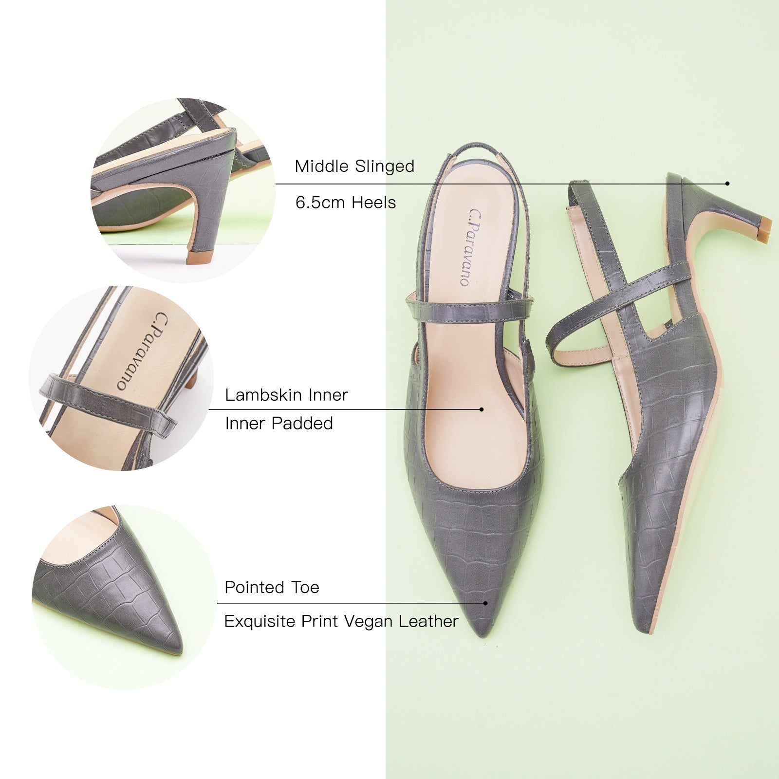 - Based on our classic Slingback, in addition to the pointed toe, stiletto heel and elastic strap, we have added exquisite croco print, making you look more feminine and luxurious from the details. The instep strap ensures a snug fit, preventing heel slippage.