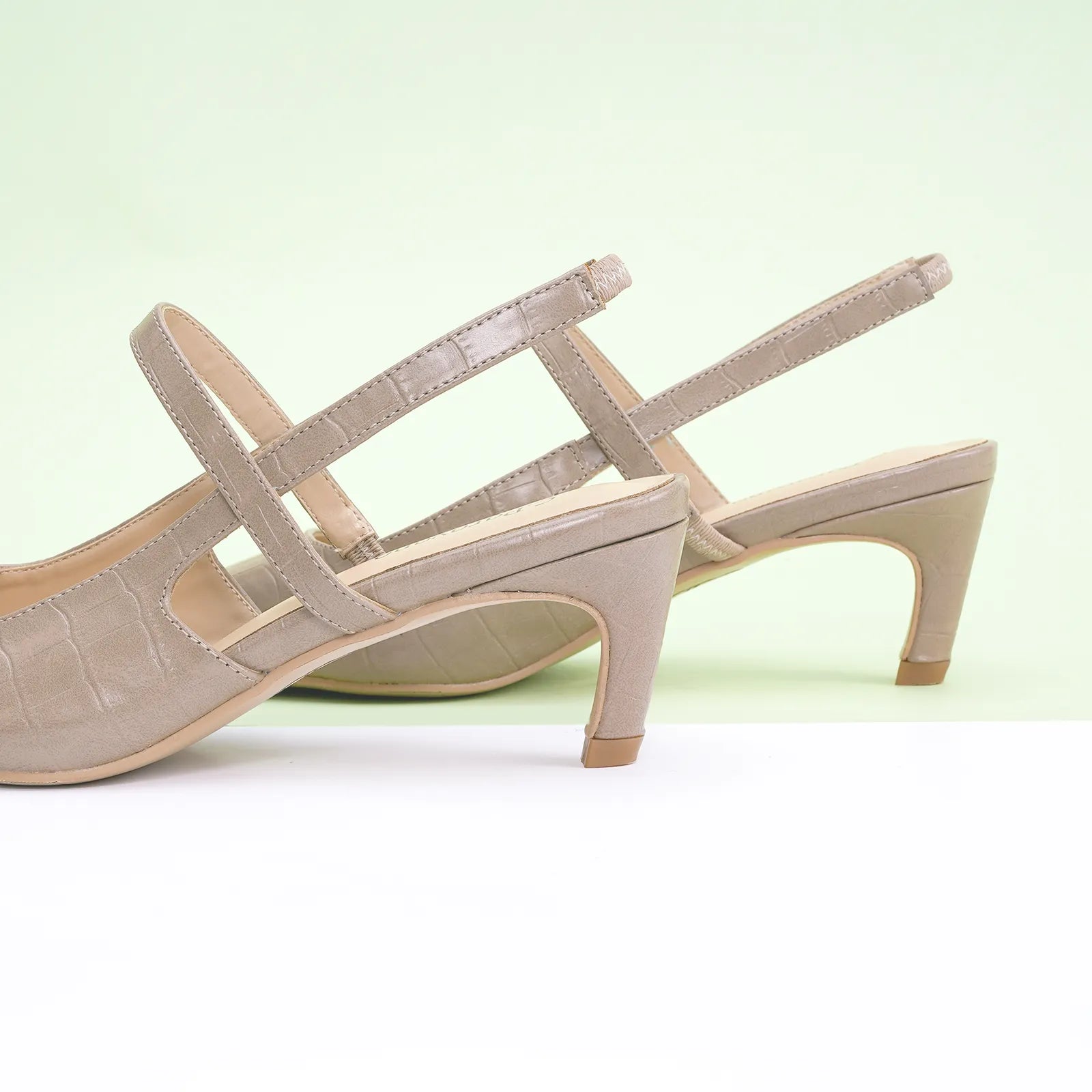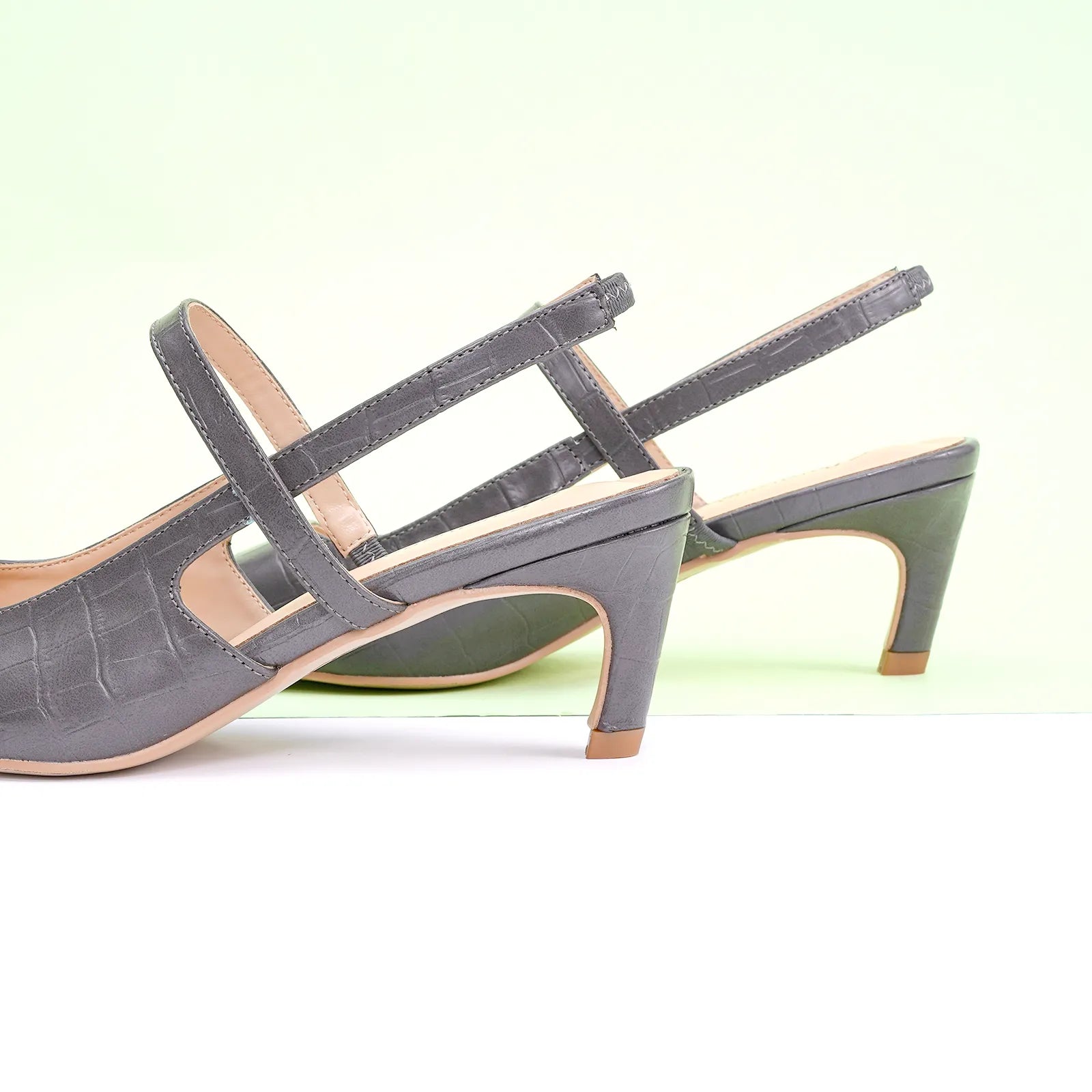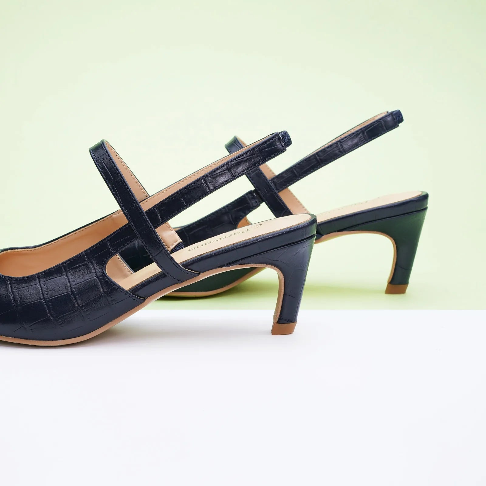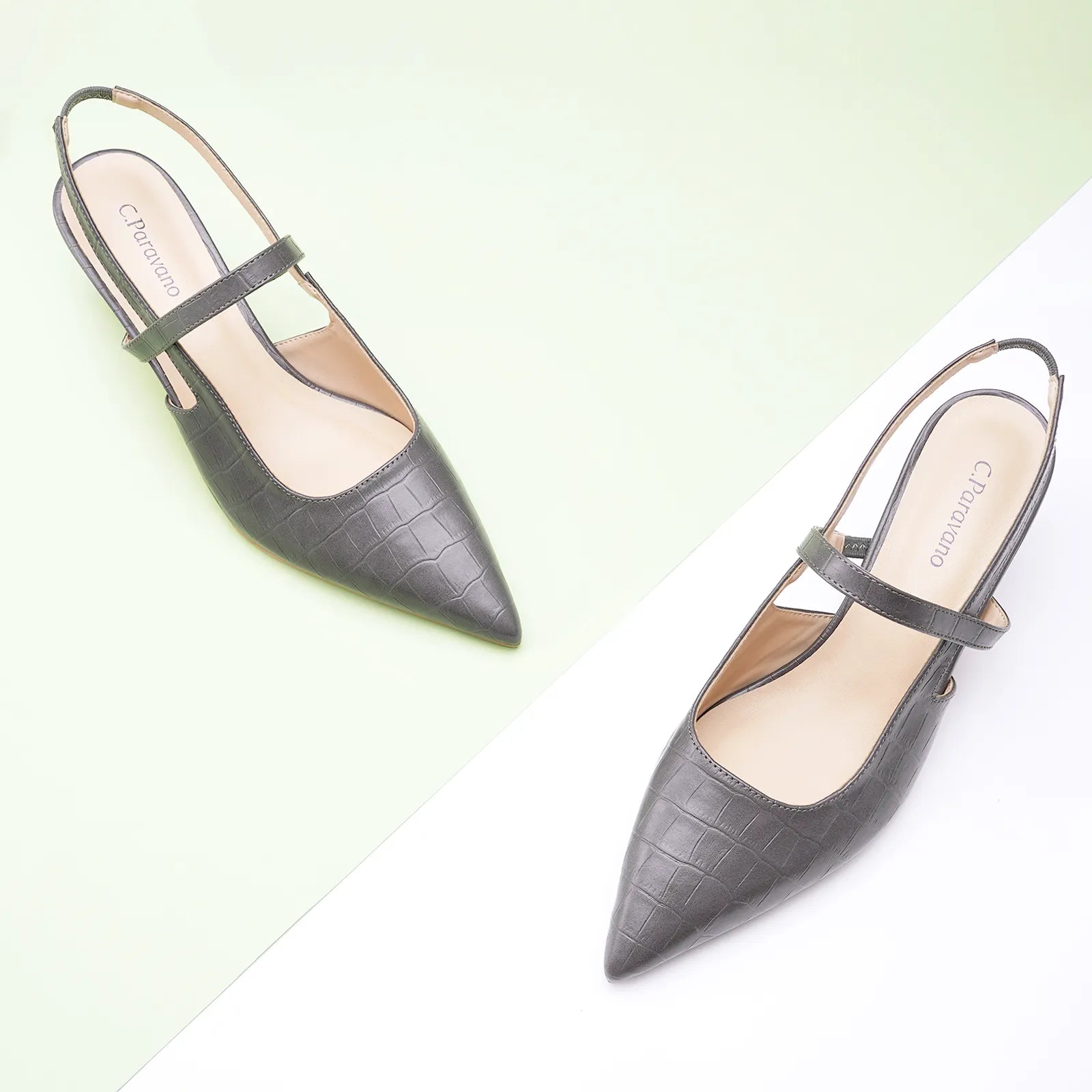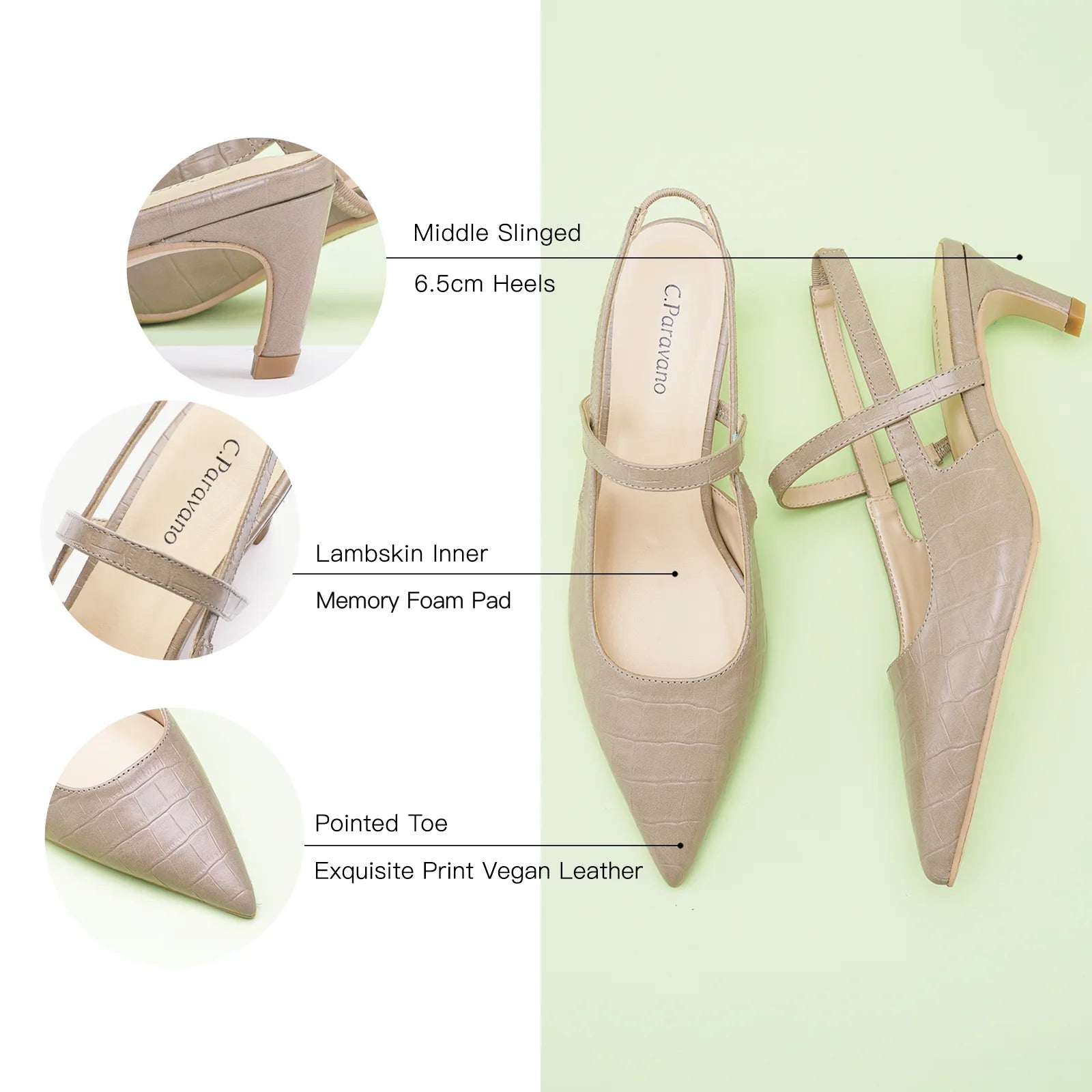 - Based on our classic Slingback, in addition to the pointed toe, stiletto heel and elastic strap, we have added exquisite croco print, making you look more feminine and luxurious from the details. The instep strap ensures a snug fit, preventing heel slippage.