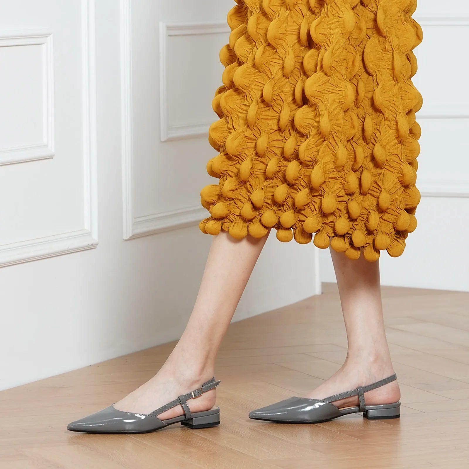 - Crafted from soft leather, this pair is a flat pointed-toe slingback with a 25mm block heel. The shiny leather makes the shoes look very textured. The adjustable strap and buckle allows for a wider fit.