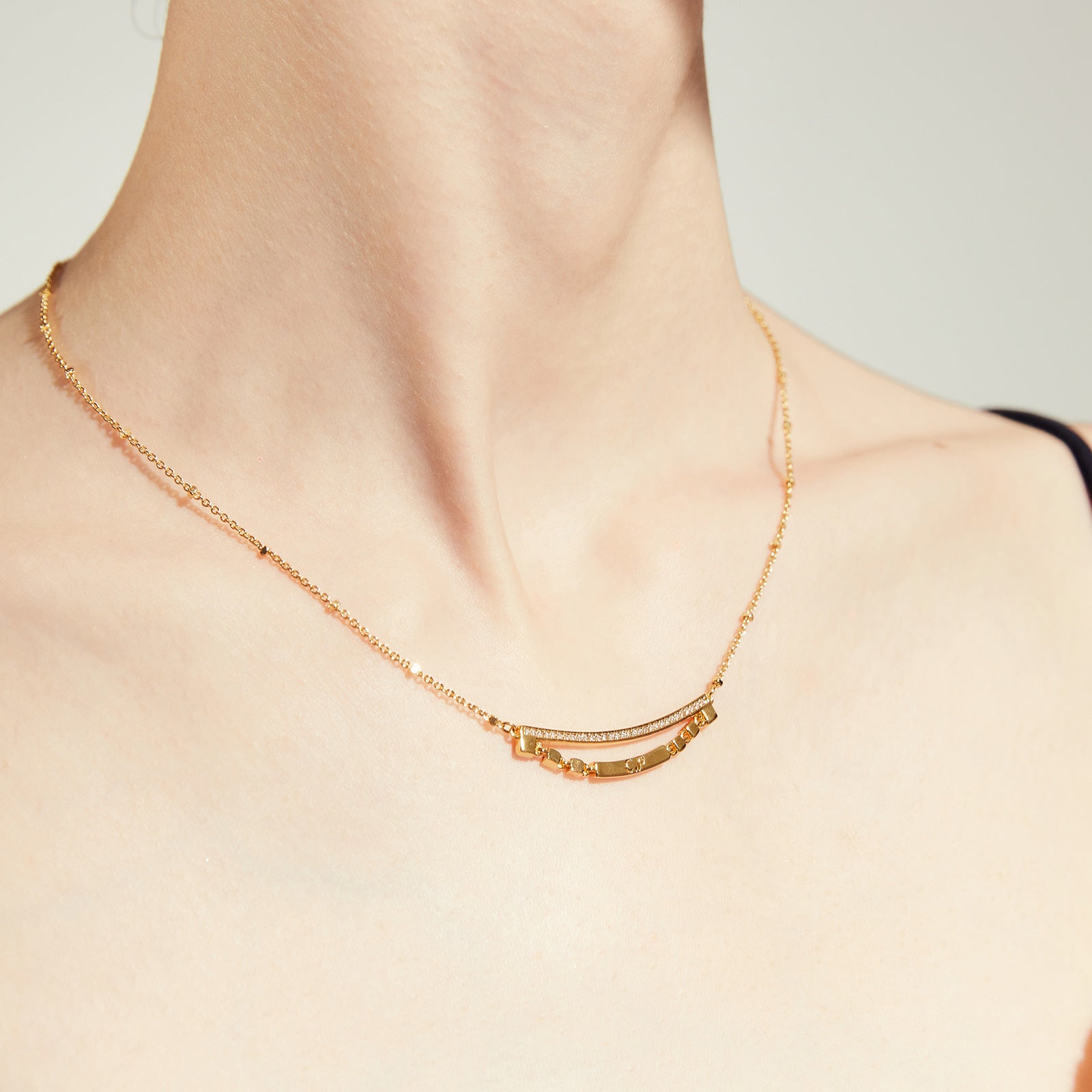 - Elevate your elegance with the enchanting allure of our Sparkling Curve Necklace. This curated collection is a testament to timeless beauty, featuring a gracefully arched design adorned with radiant gemstones that captivate with every movement.