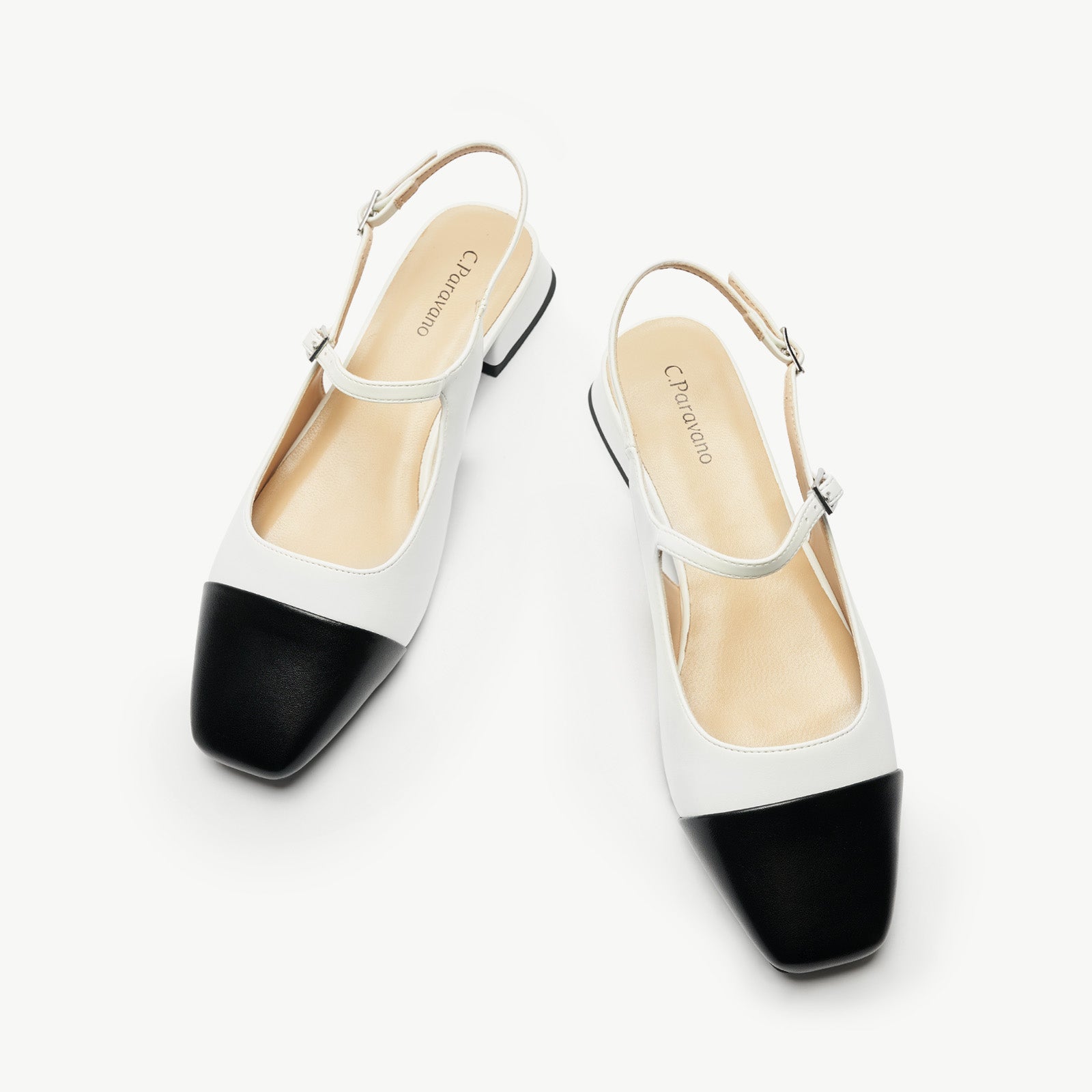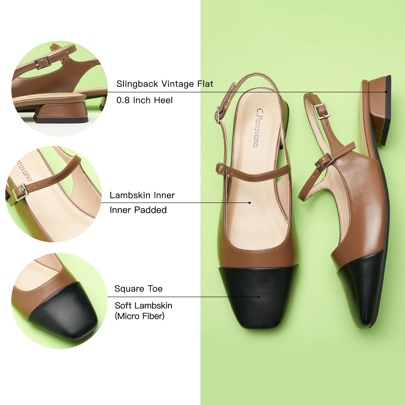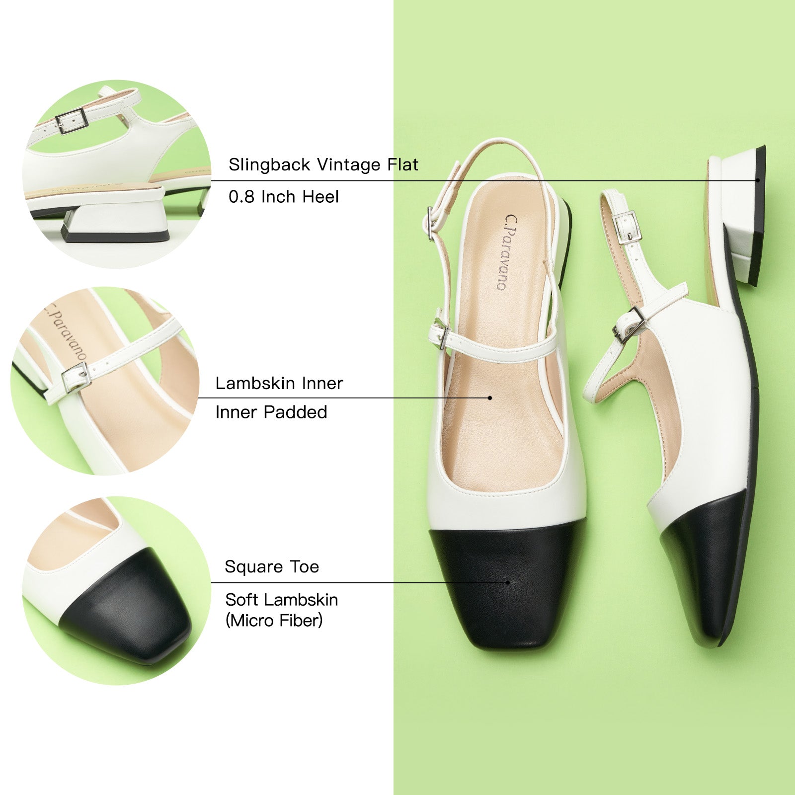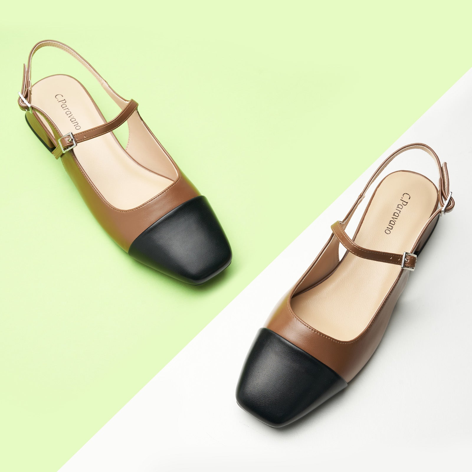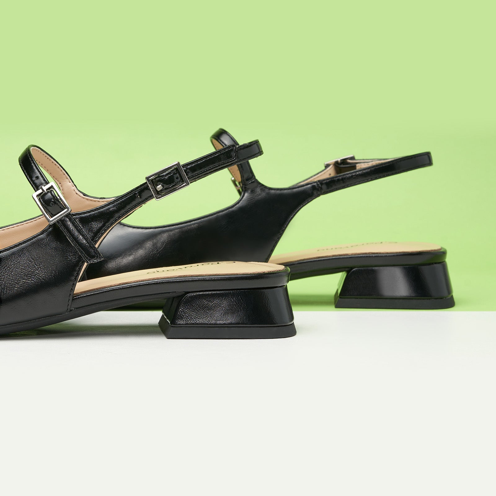 - These slingbacks adopt a square toe design, which is more accommodating to different foot shapes. The splicing design of the toe and the shoe body presents a structuralist aesthetic. The adjustable strap and buckle allows for a wider fit.
