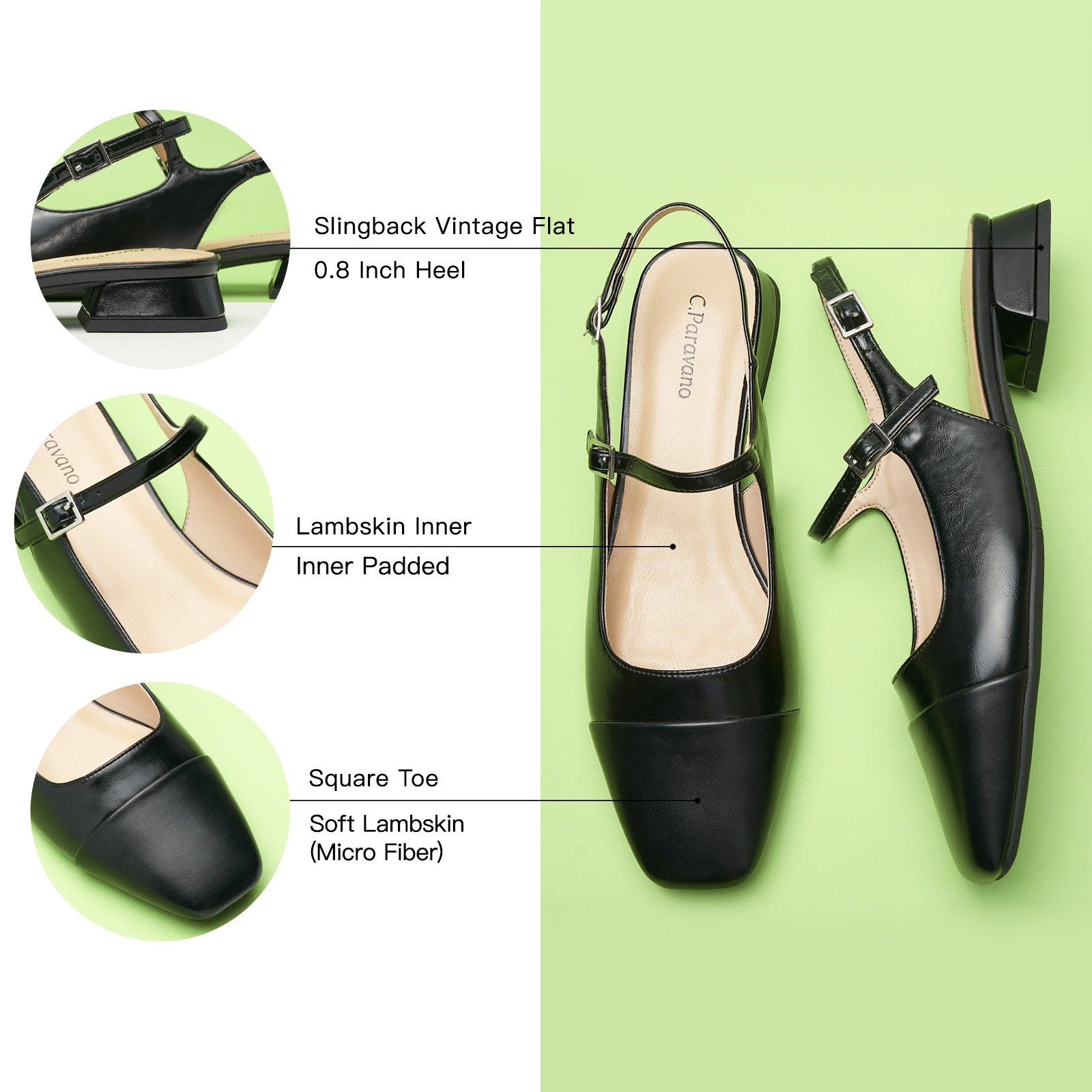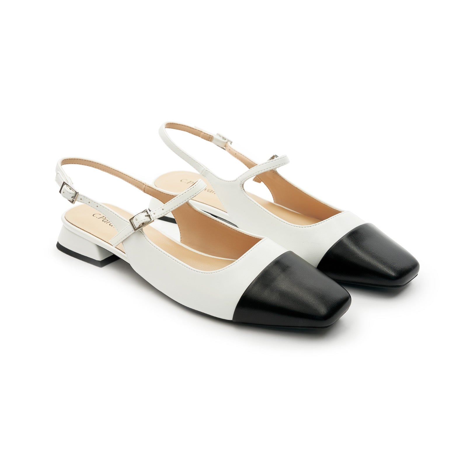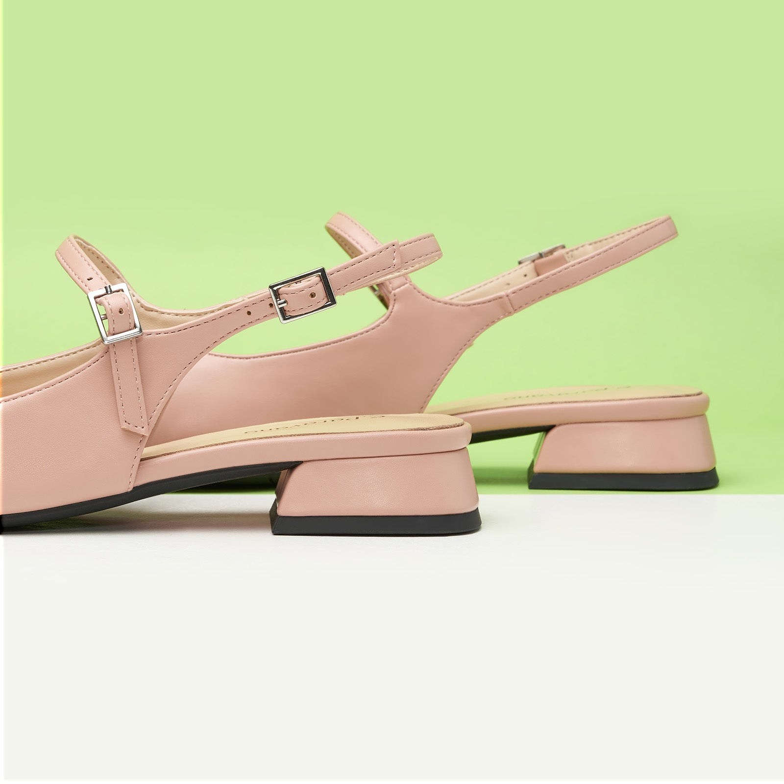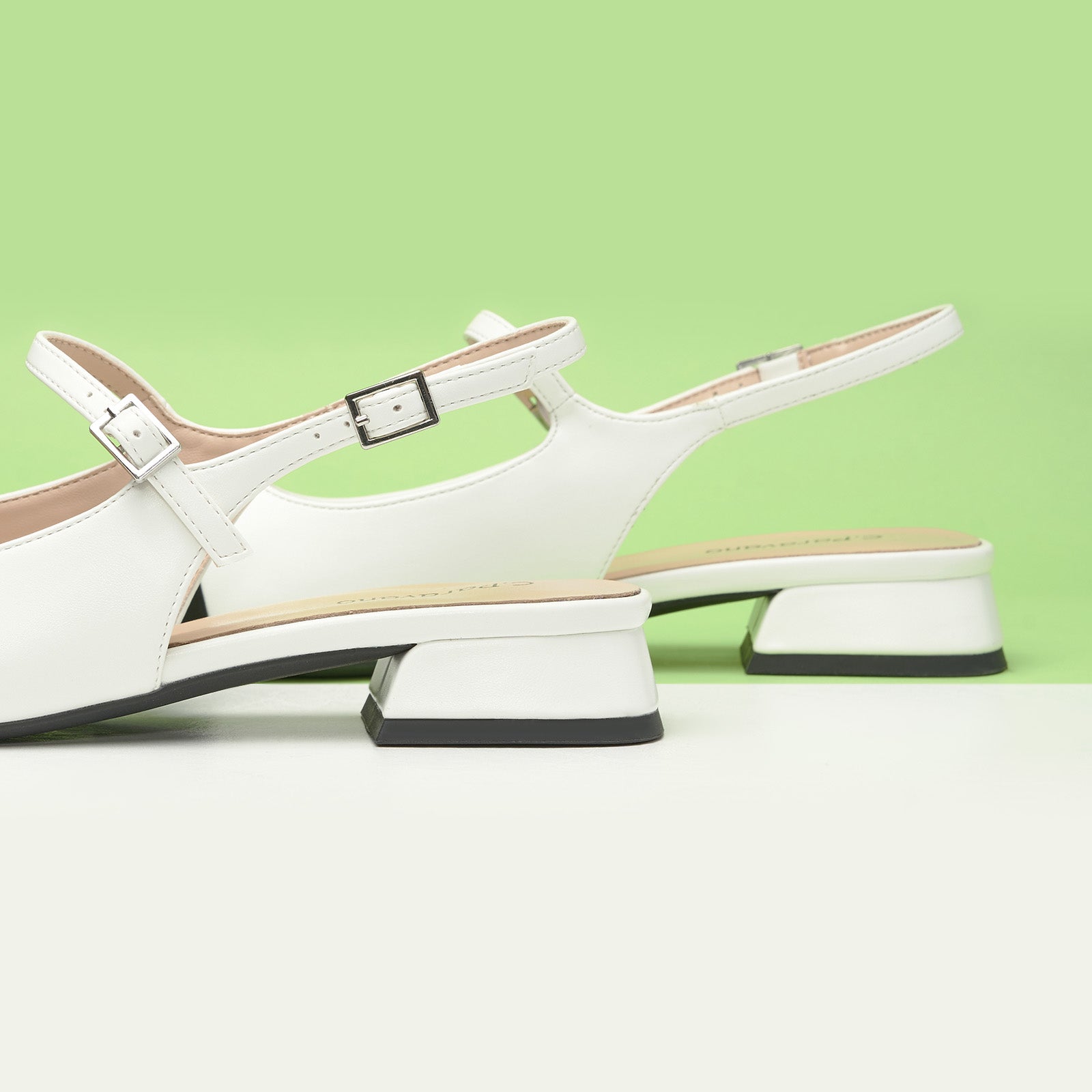 - These slingbacks adopt a square toe design, which is more accommodating to different foot shapes. The splicing design of the toe and the shoe body presents a structuralist aesthetic. The adjustable strap and buckle allows for a wider fit.