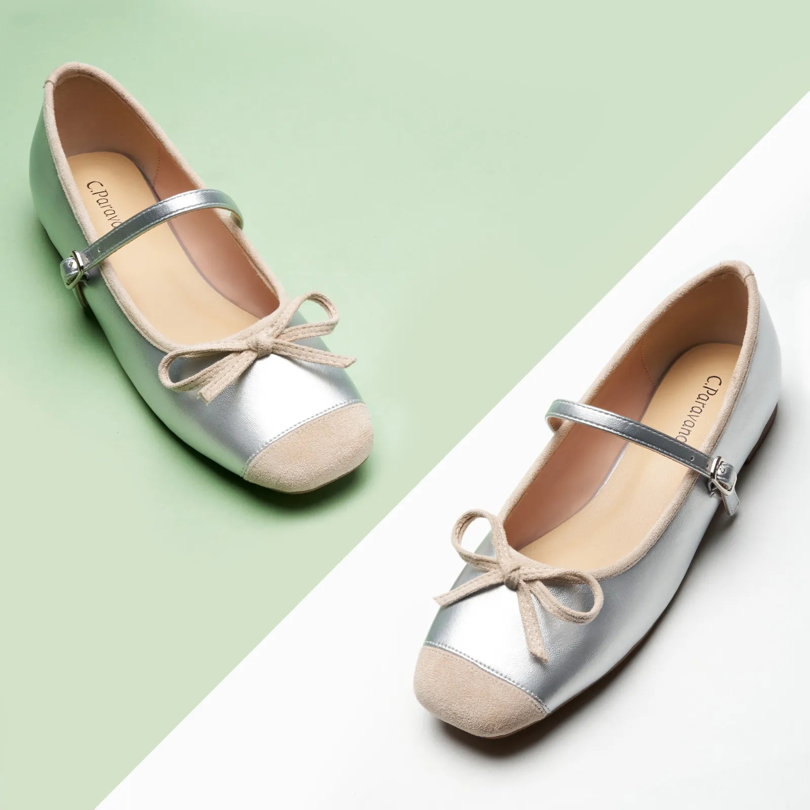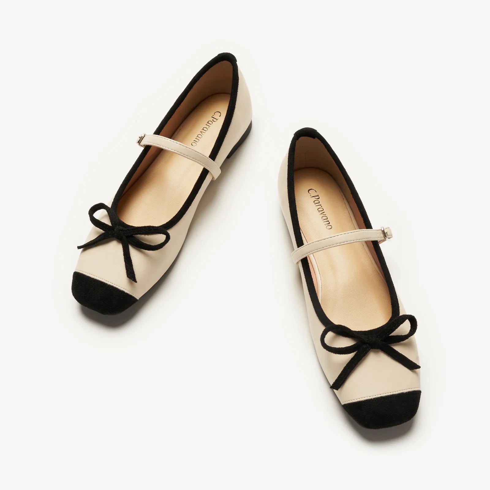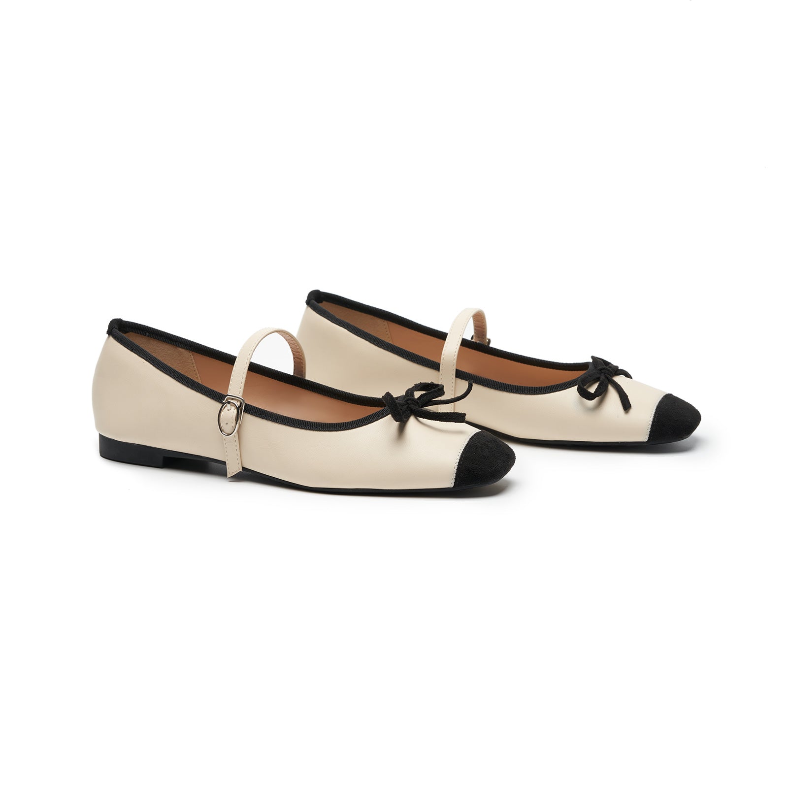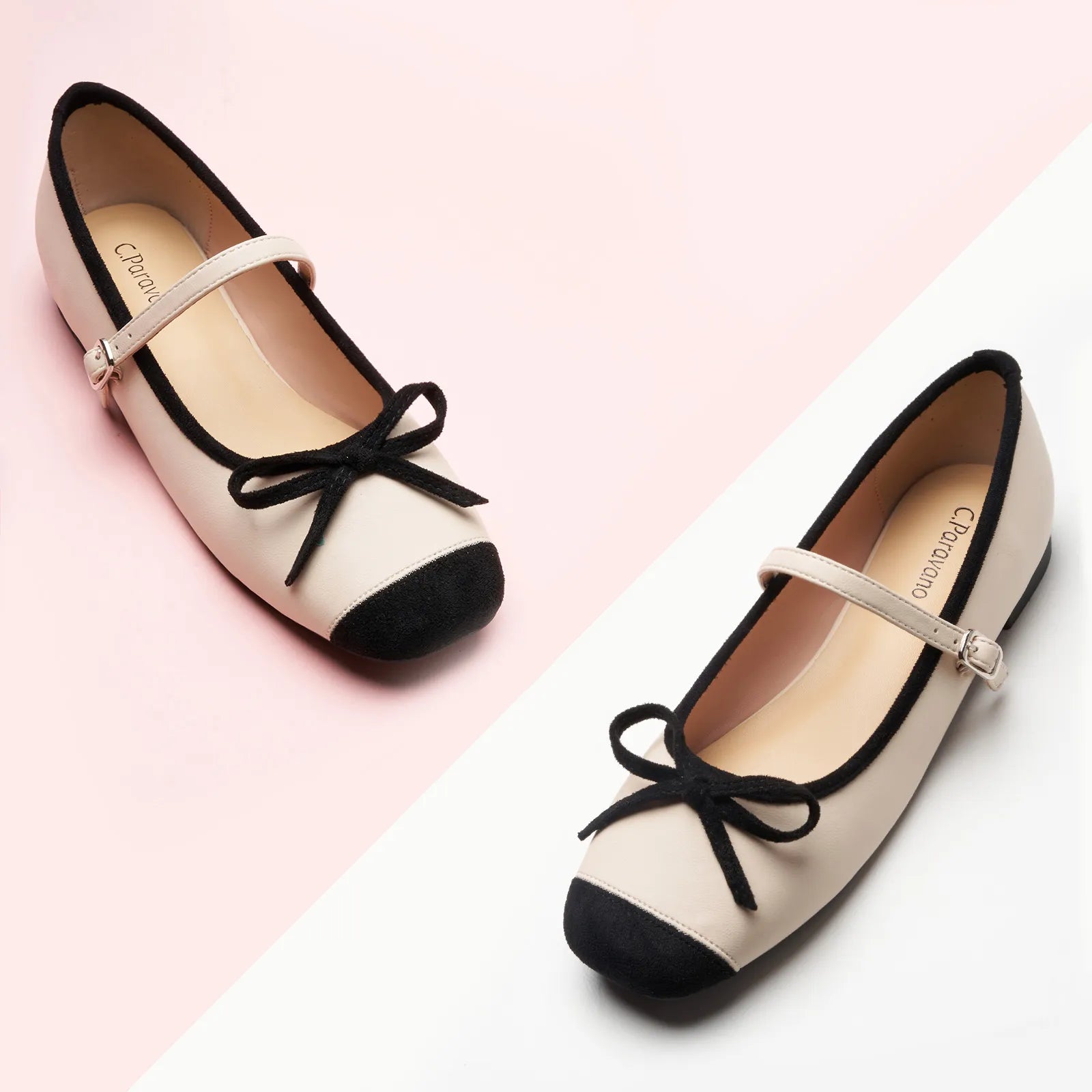 Inspired by classic ballet shoes and mary janes, these mary jane flats showcase a timeless round-toe design and retro two-tone finish, reminiscent of a poised ballerina. They feature a delicate bow embellishment, as well as an adjustable strap, ensuring a secure fit while adding a touch of feminine refinement.