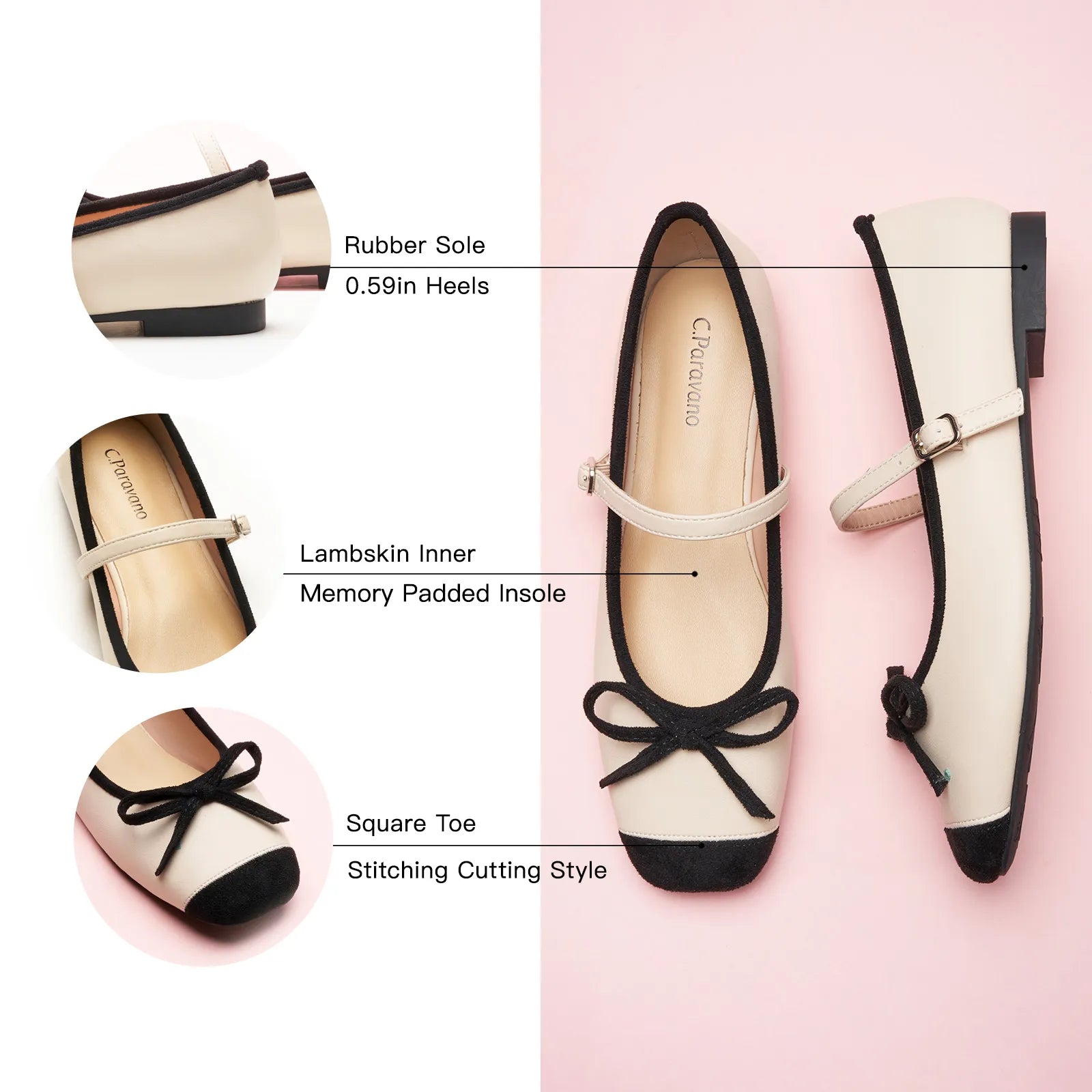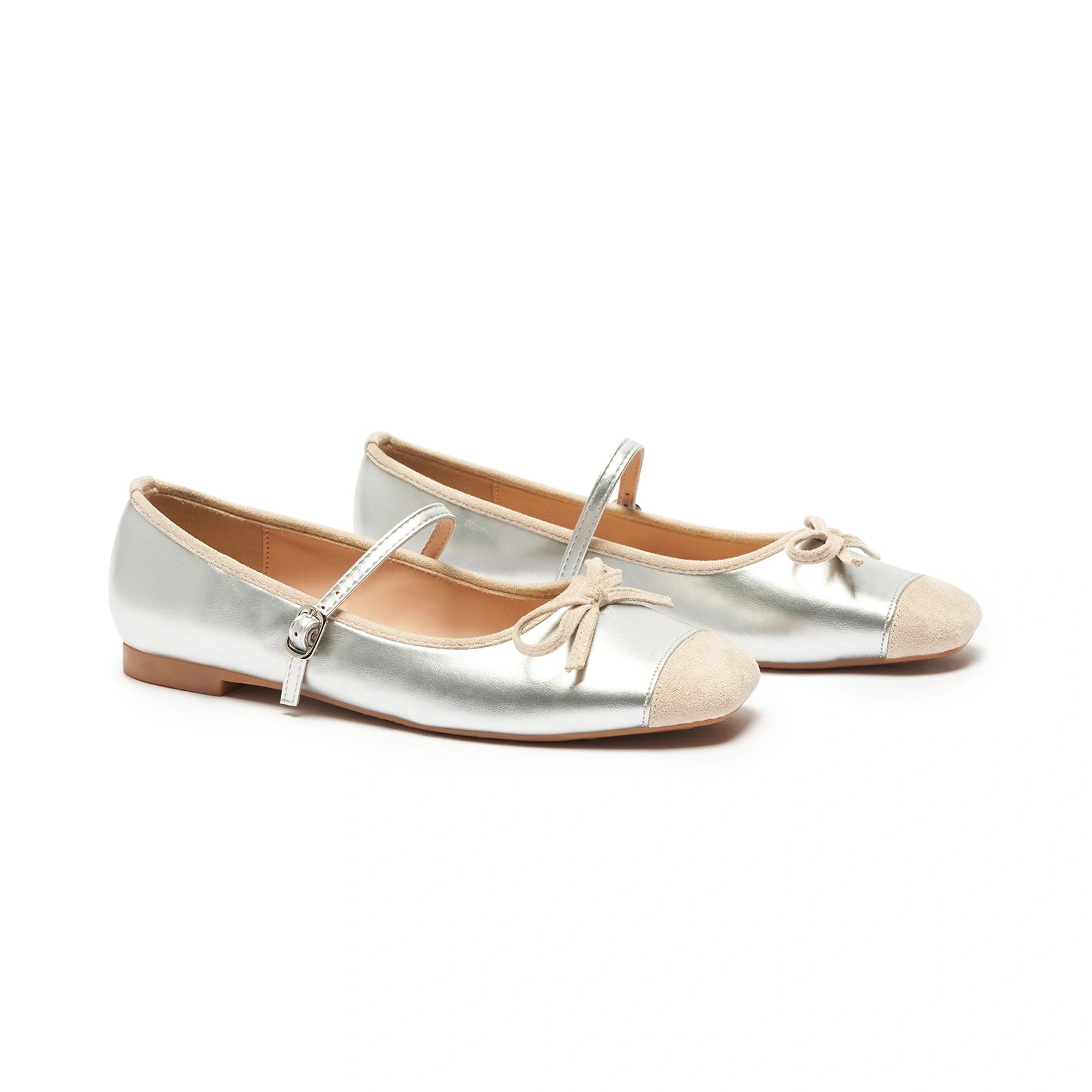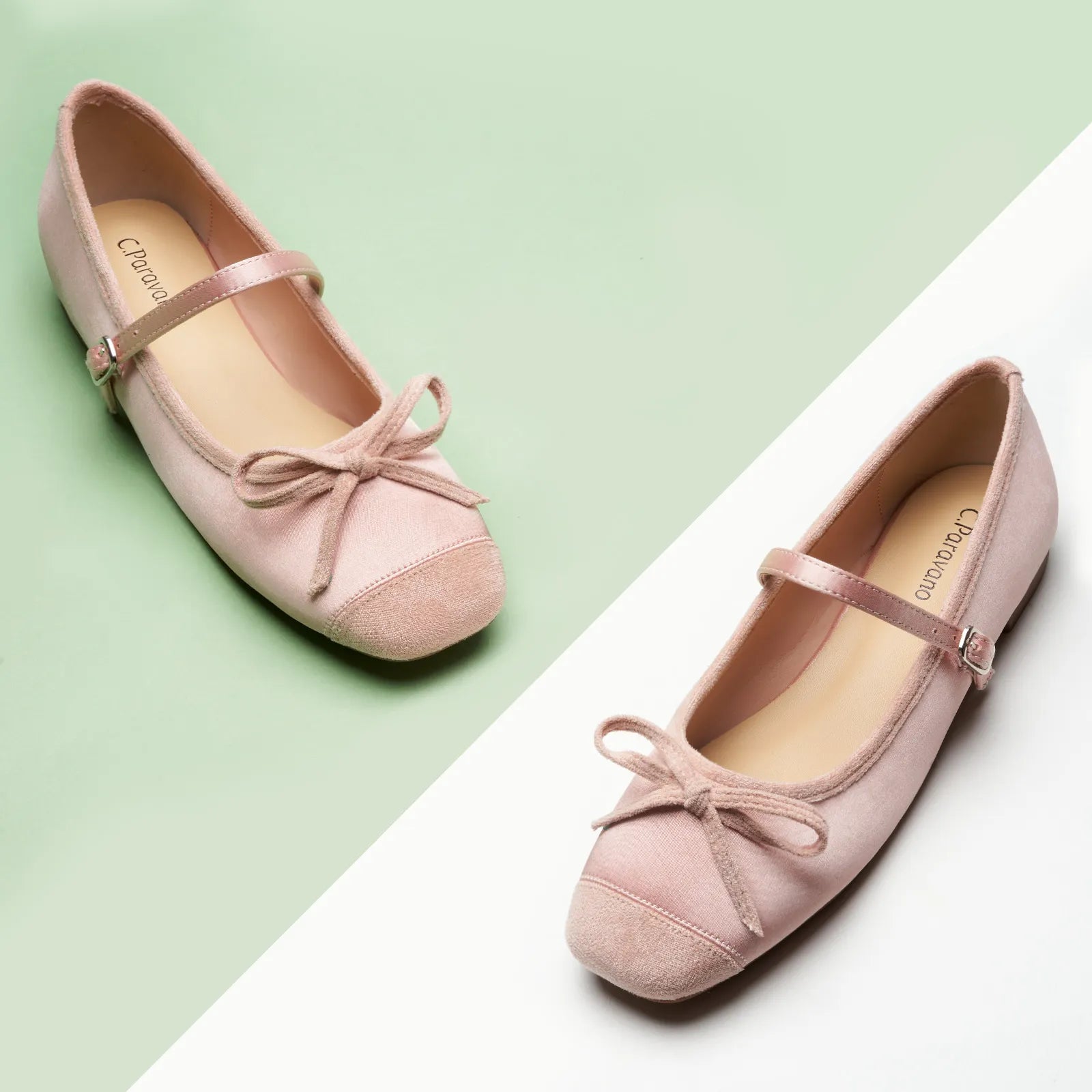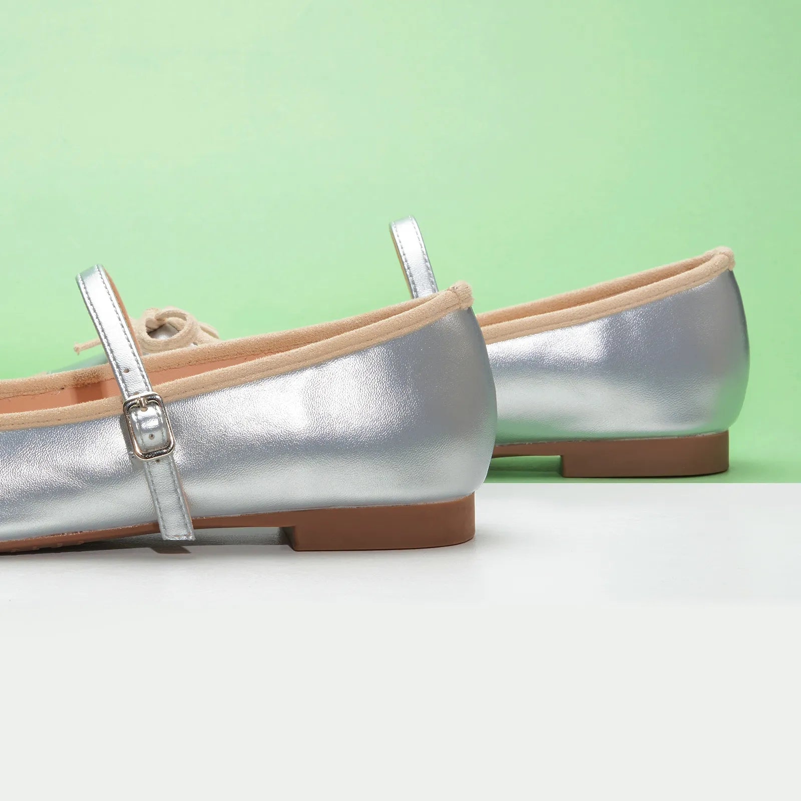 Inspired by classic ballet shoes and mary janes, these mary jane flats showcase a timeless round-toe design and retro two-tone finish, reminiscent of a poised ballerina. They feature a delicate bow embellishment, as well as an adjustable strap, ensuring a secure fit while adding a touch of feminine refinement.