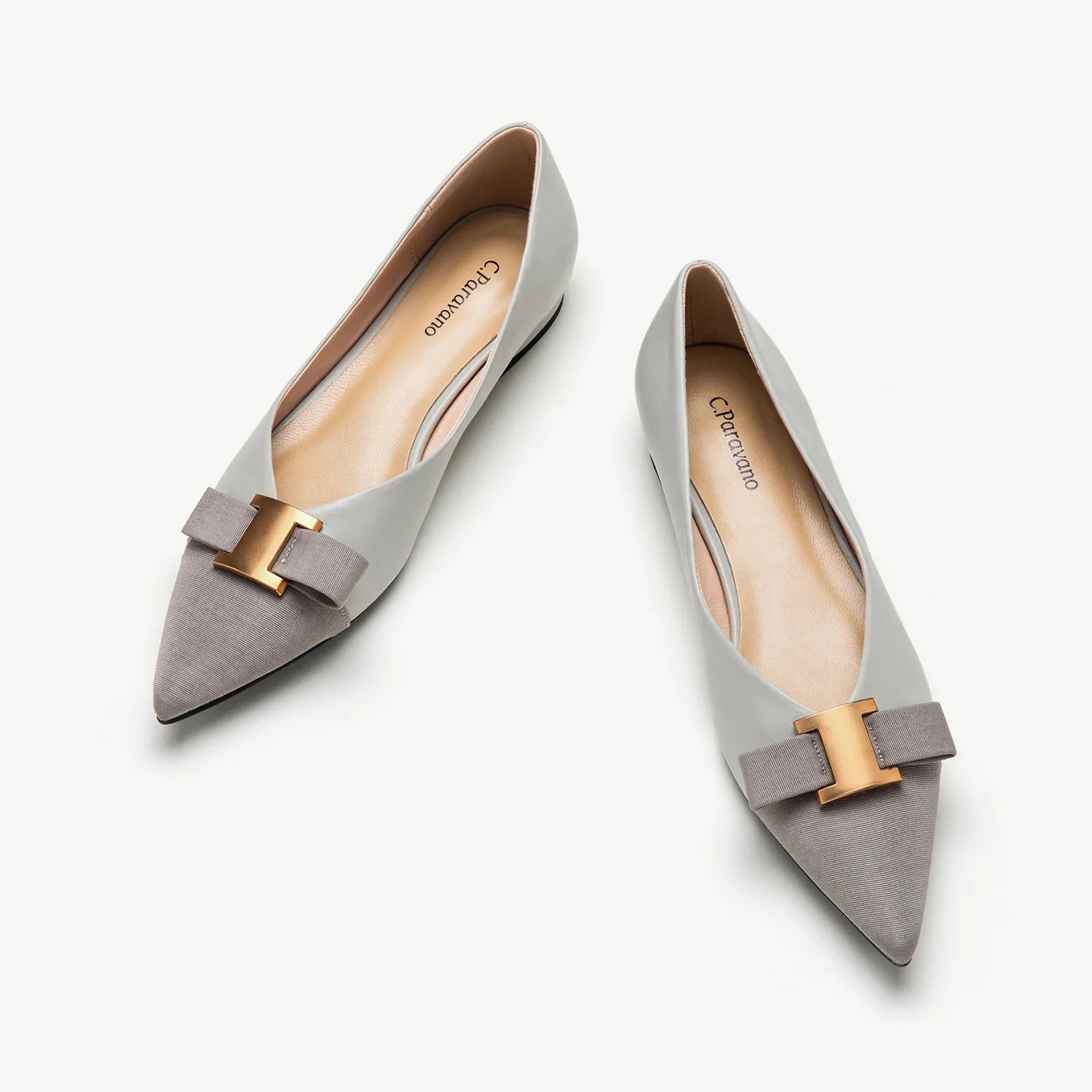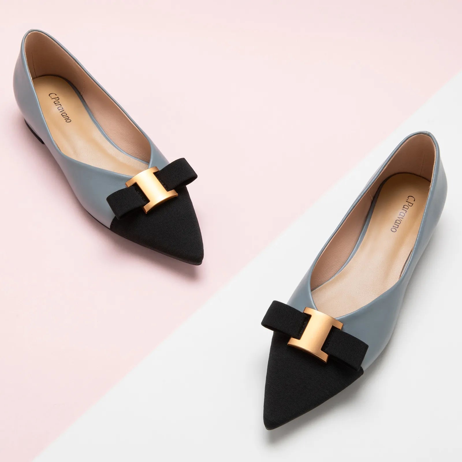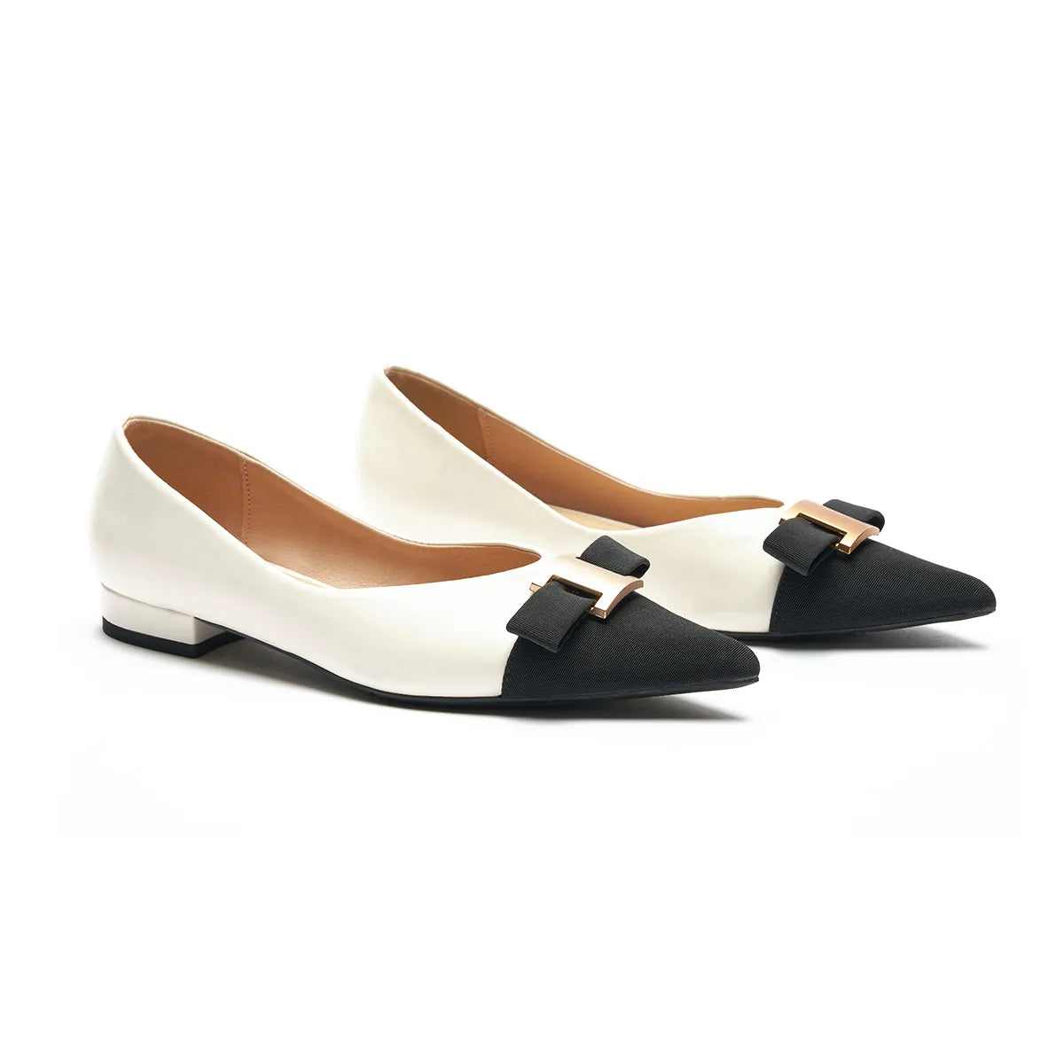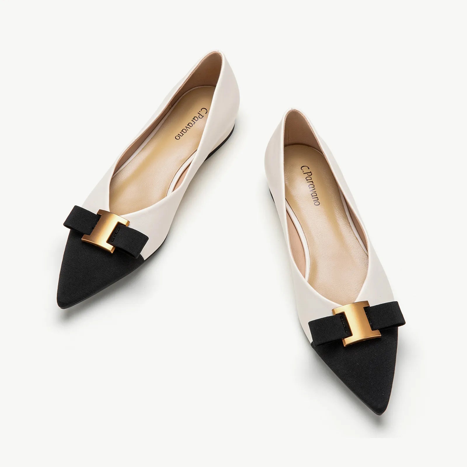Boasting a unique dual-color, dual-material splicing design, these flats seamlessly blend two distinct hues and textures for a captivating visual impact. The bow with metal trim and a grippy sole adorned with iconic prints, exude feminine delicacy and strength. This pair is a statement of sophisticated lifestyle, balancing classic with fashion.