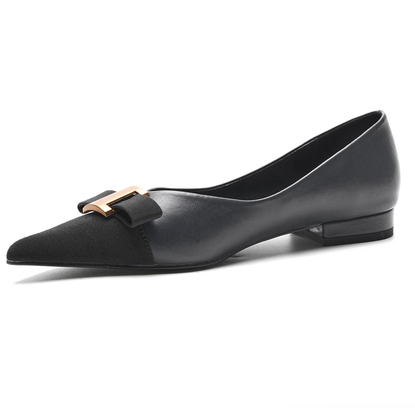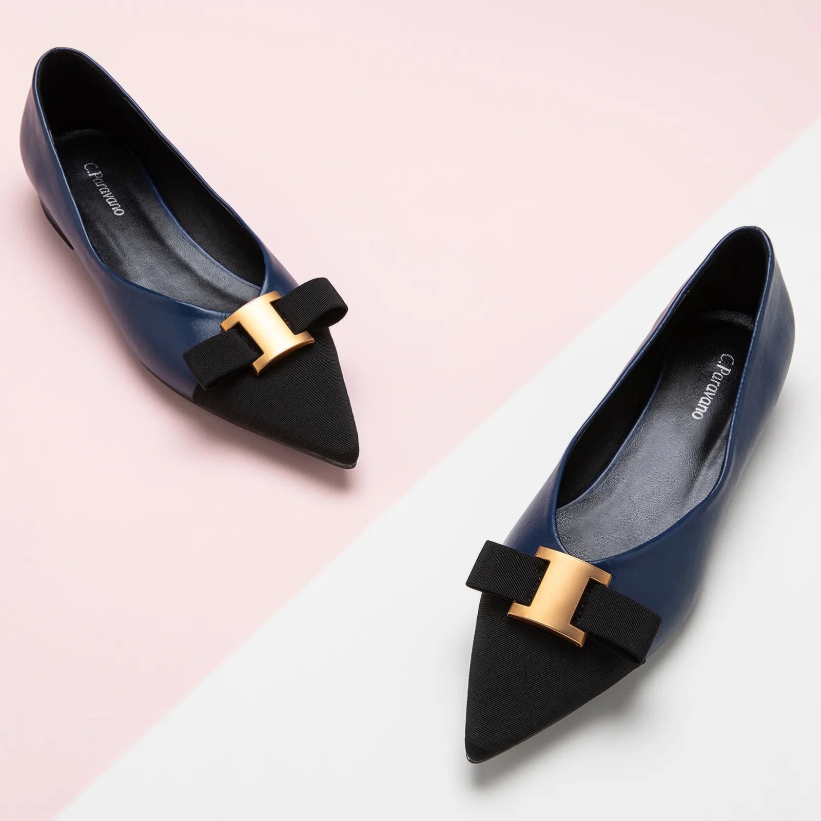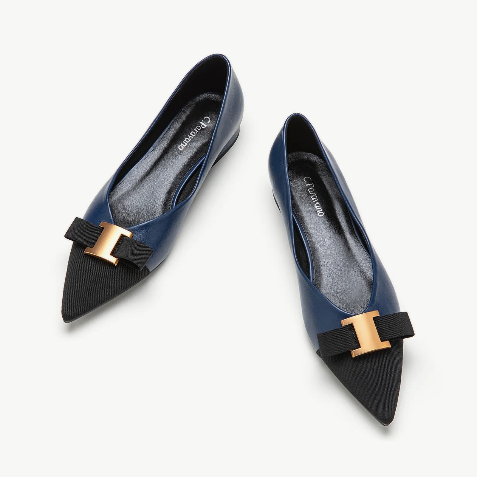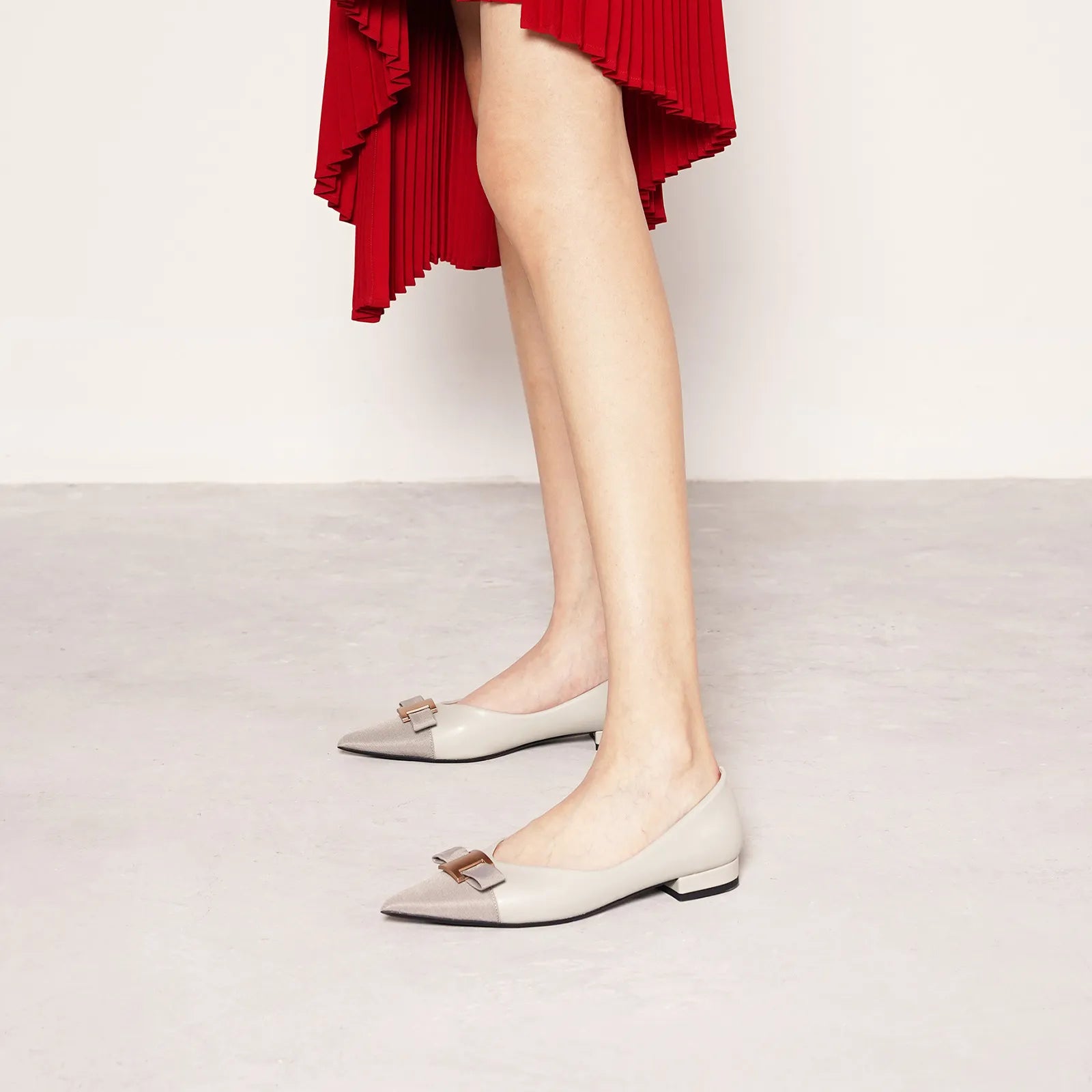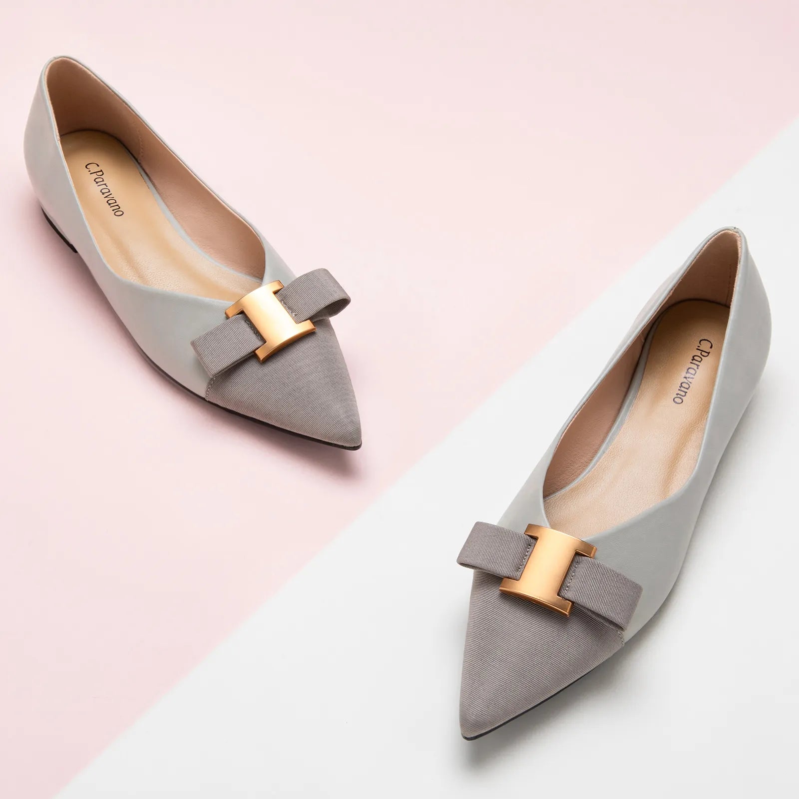 Boasting a unique dual-color, dual-material splicing design, these flats seamlessly blend two distinct hues and textures for a captivating visual impact. The bow with metal trim and a grippy sole adorned with iconic prints, exude feminine delicacy and strength. This pair is a statement of sophisticated lifestyle, balancing classic with fashion.