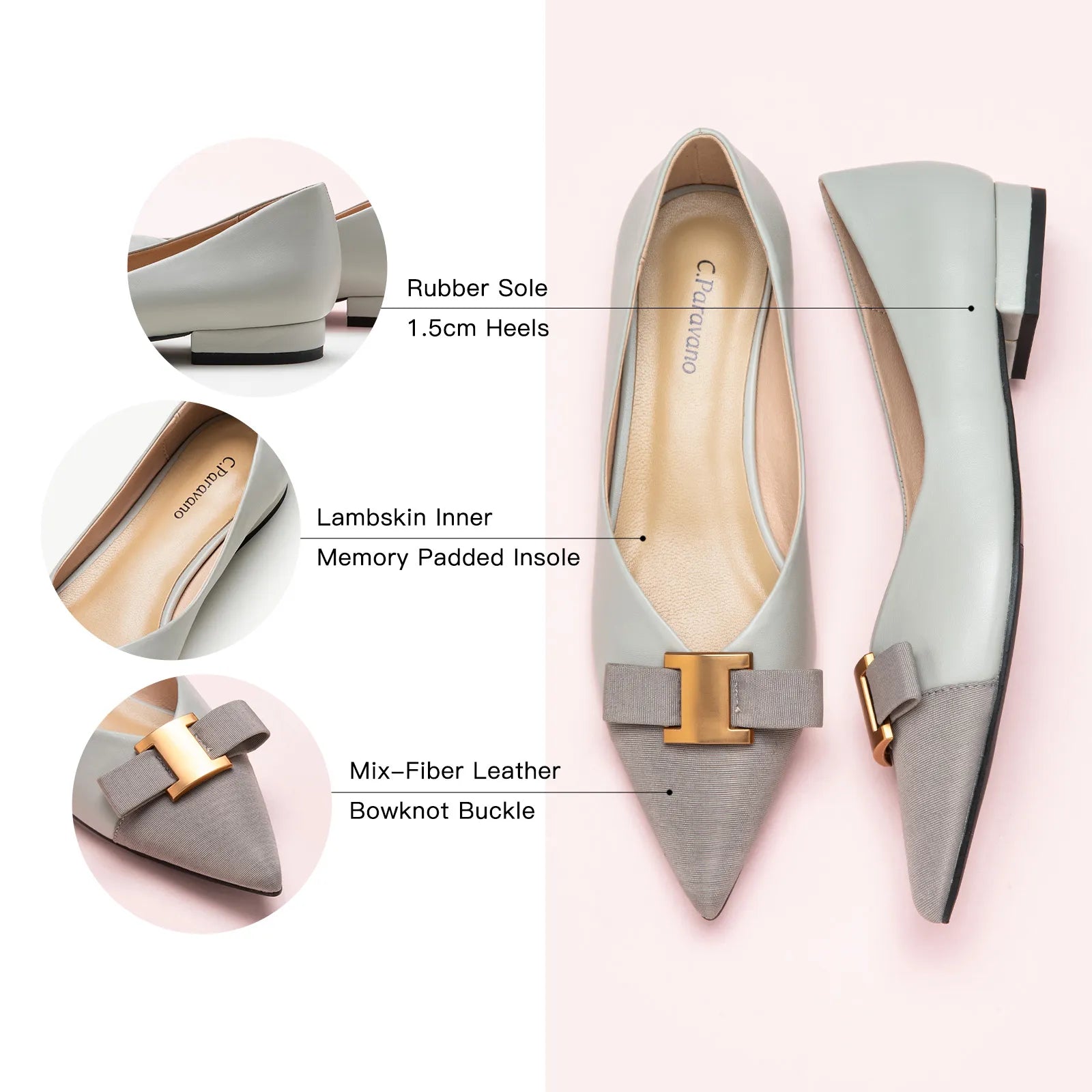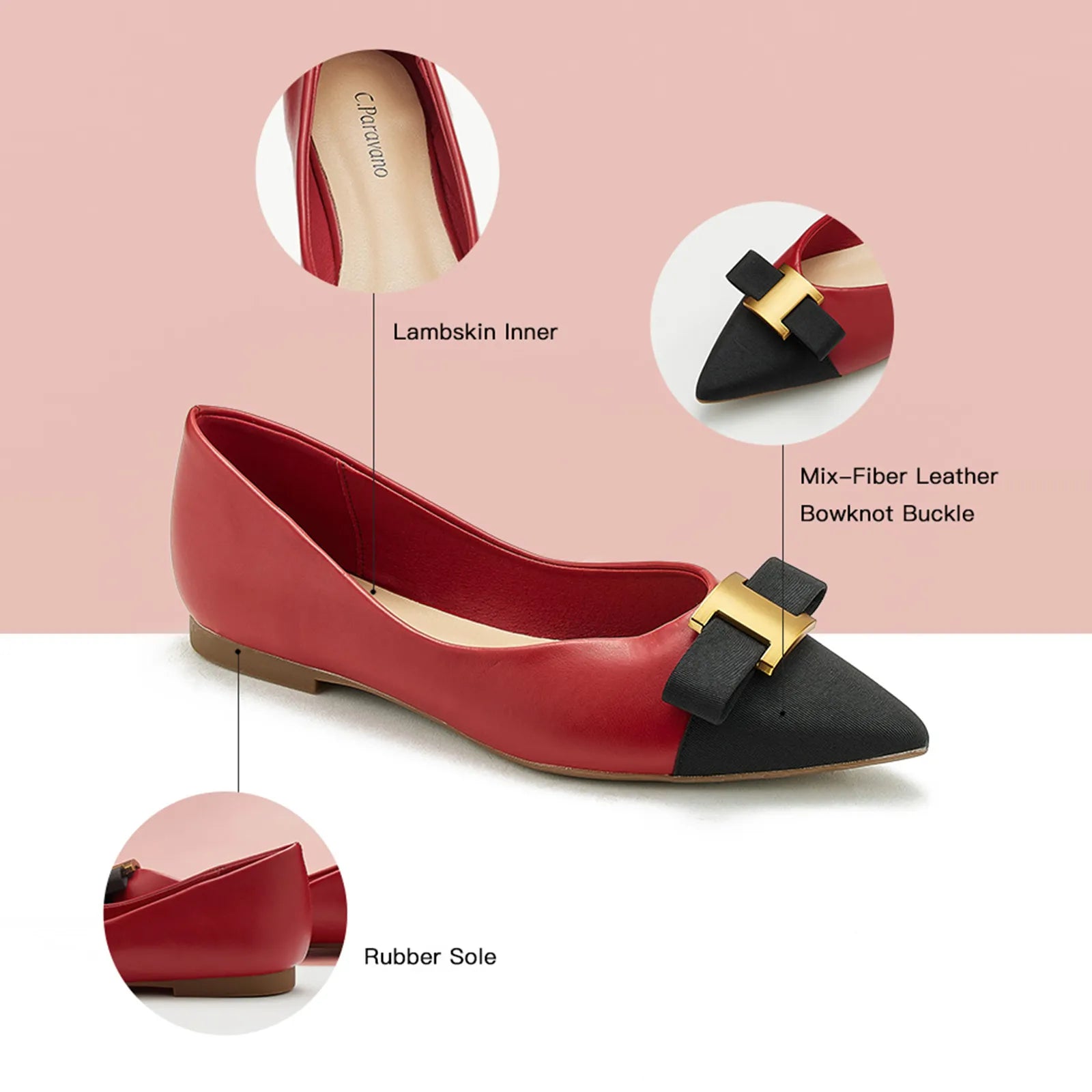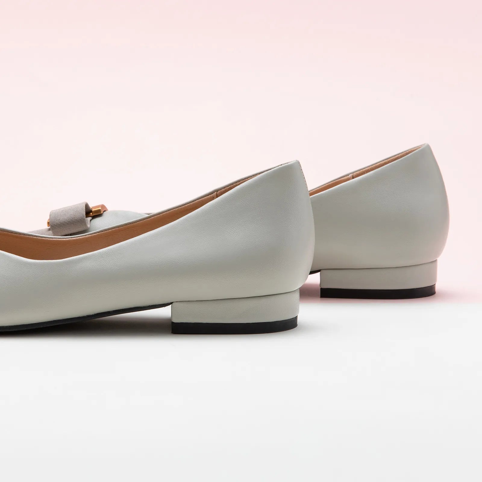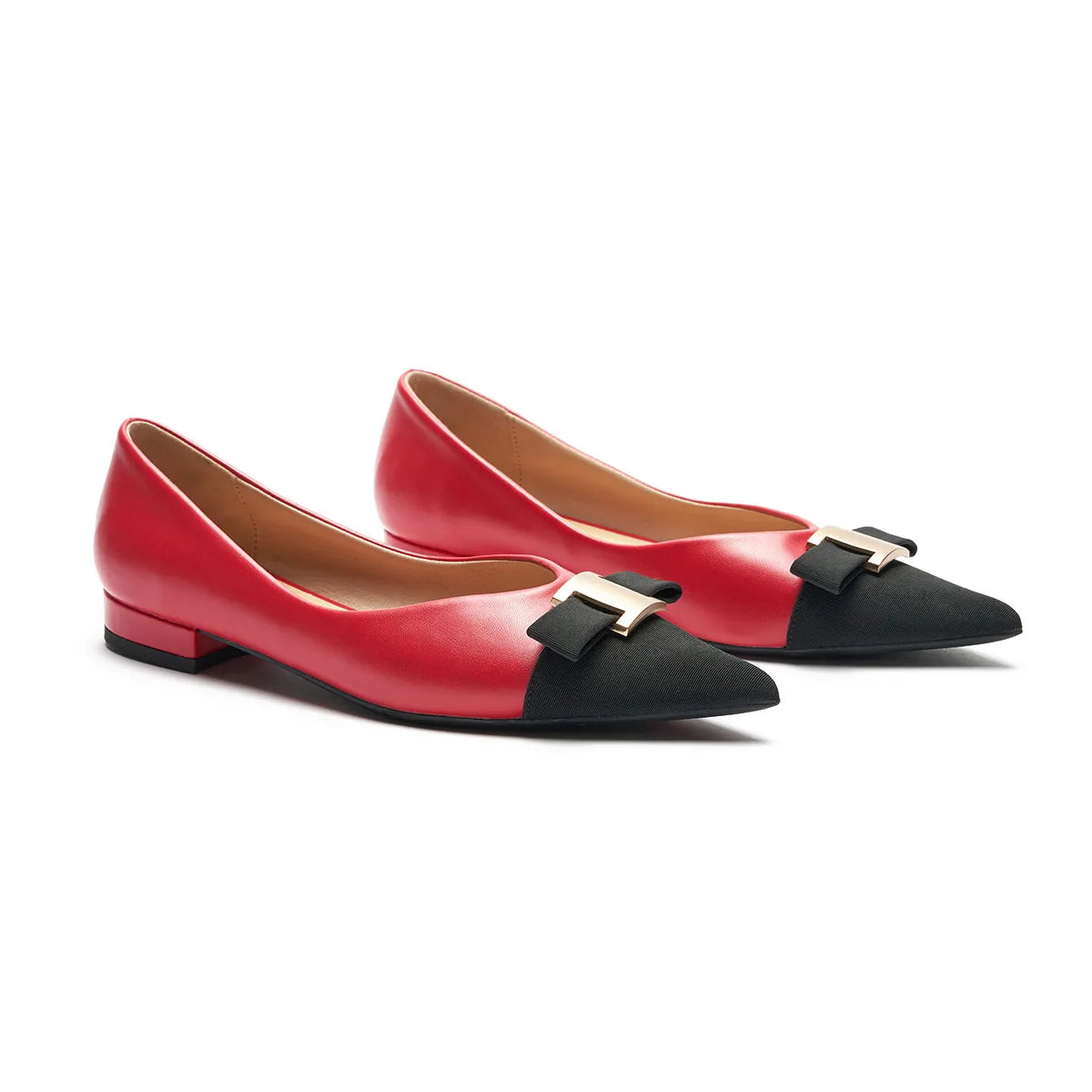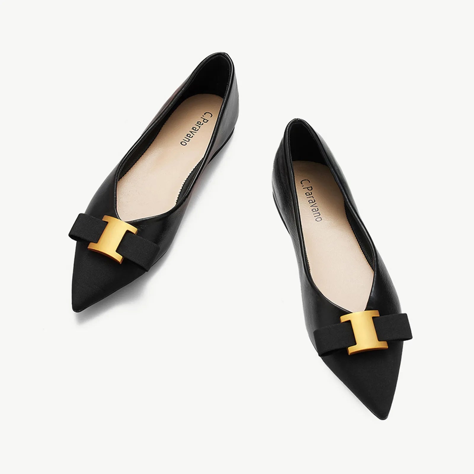 Boasting a unique dual-color, dual-material splicing design, these flats seamlessly blend two distinct hues and textures for a captivating visual impact. The bow with metal trim and a grippy sole adorned with iconic prints, exude feminine delicacy and strength. This pair is a statement of sophisticated lifestyle, balancing classic with fashion.