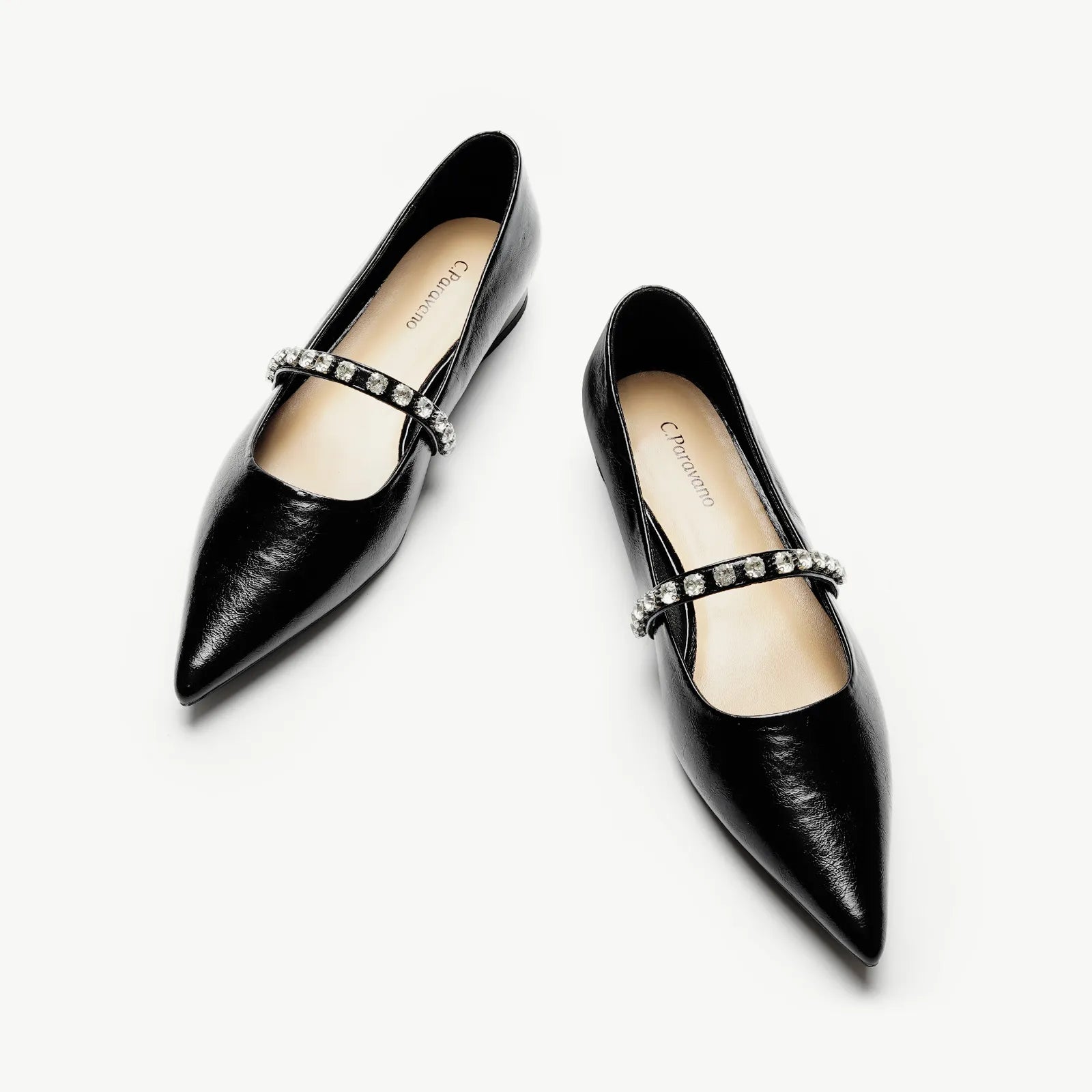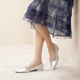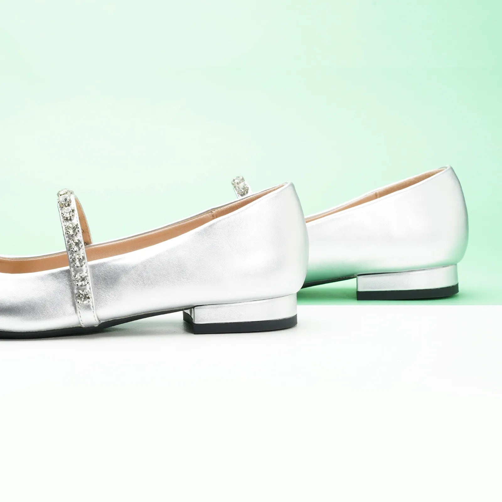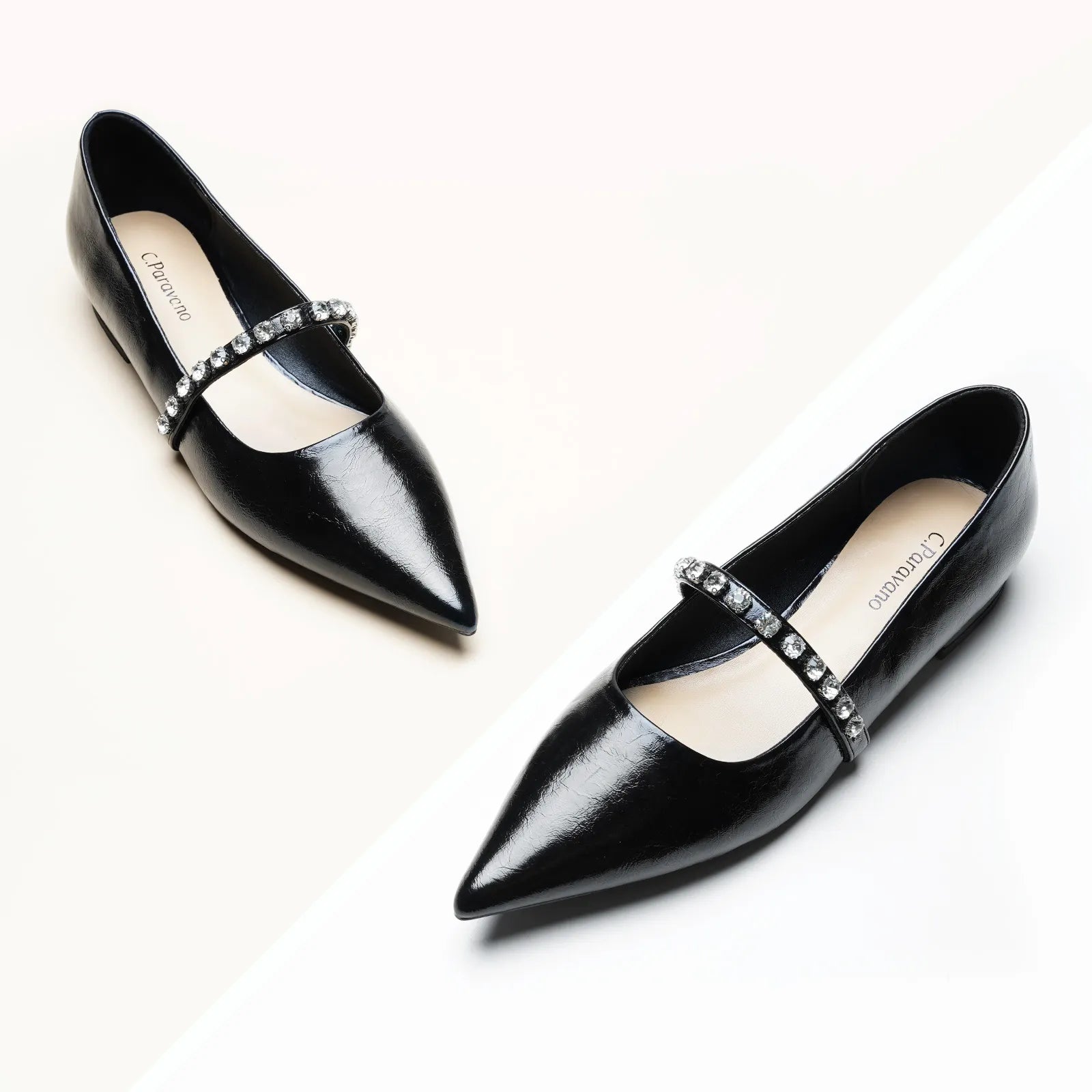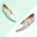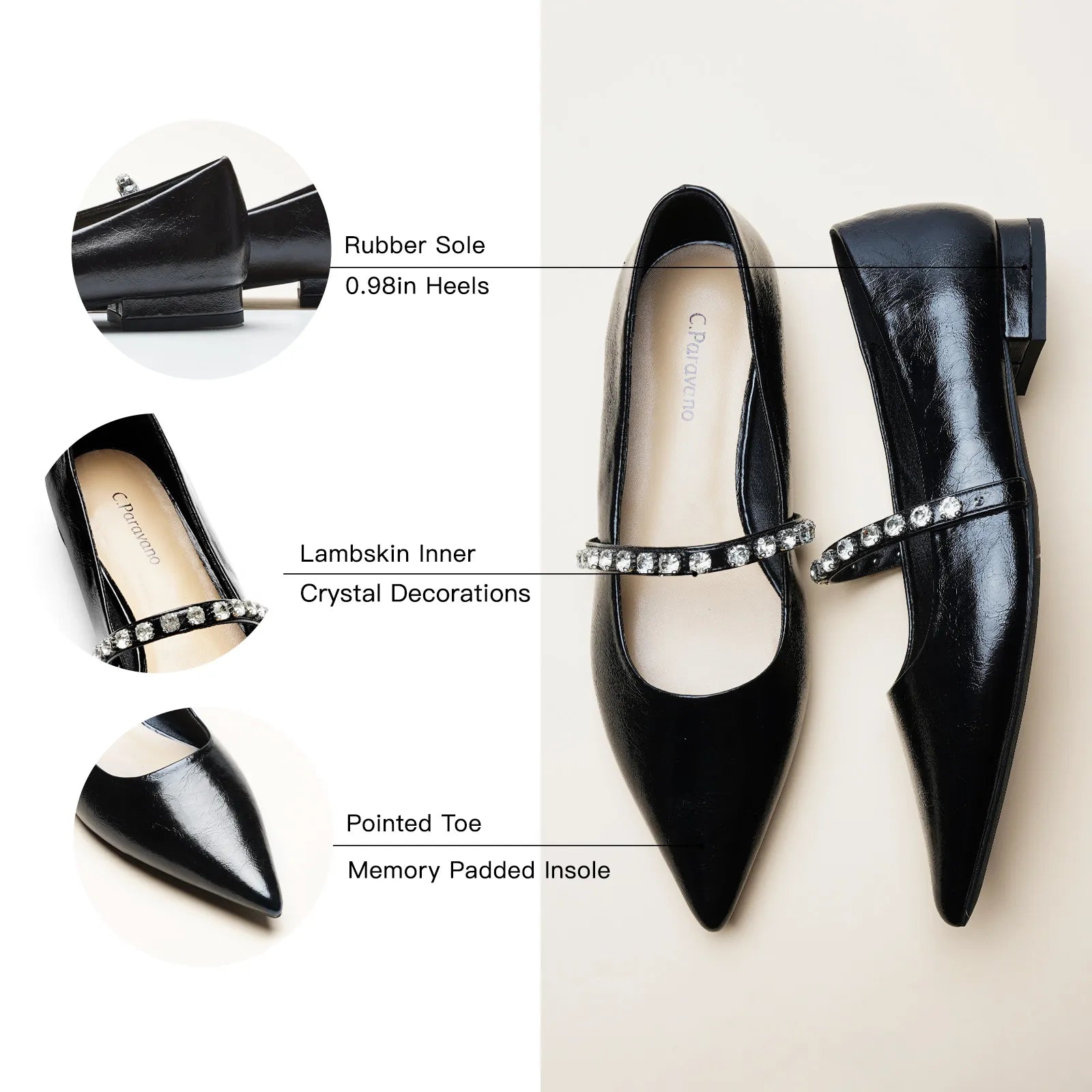 Unlike traditional Mary Jane shoes, we have made some innovations in this model. We adopted a pointed toe design which can elongate the legs and create a sleek, sophisticated look. Crystal studs set along the strap add texture - and lots of sparkle - to the look