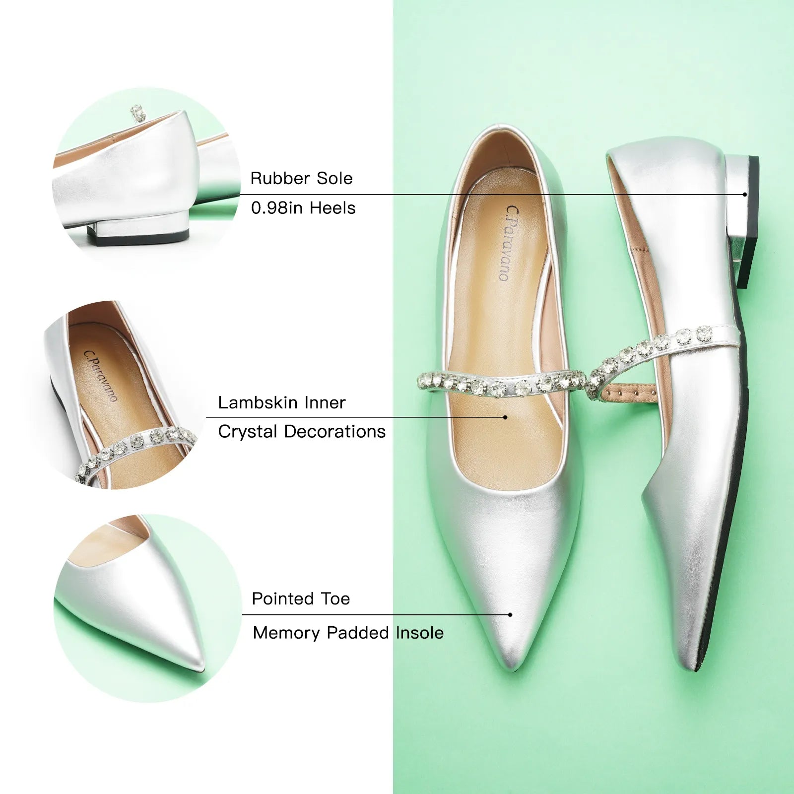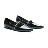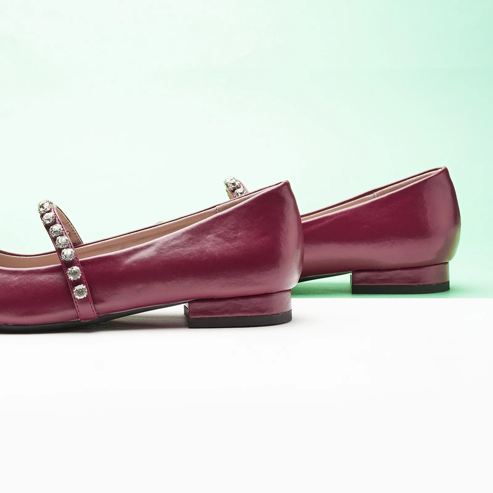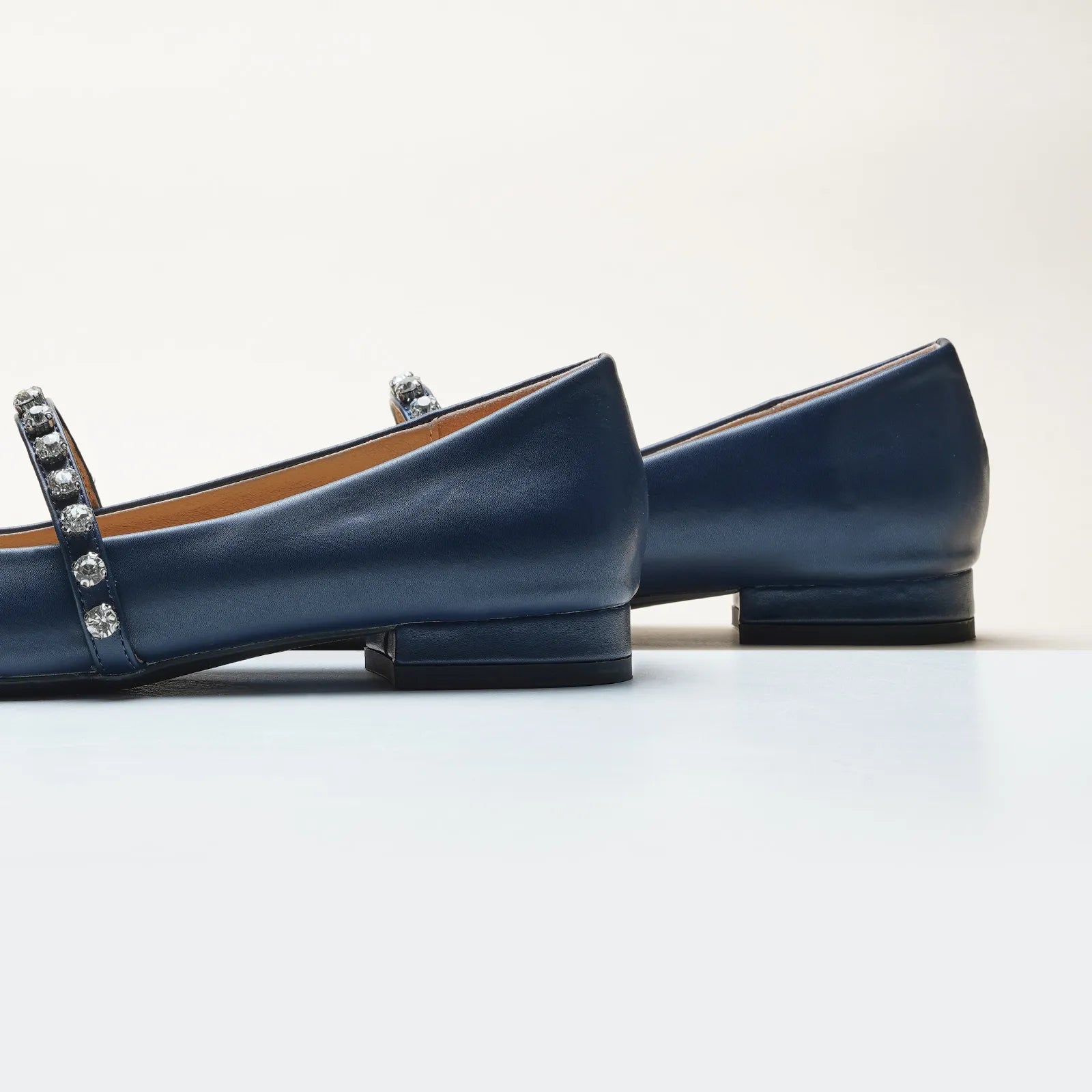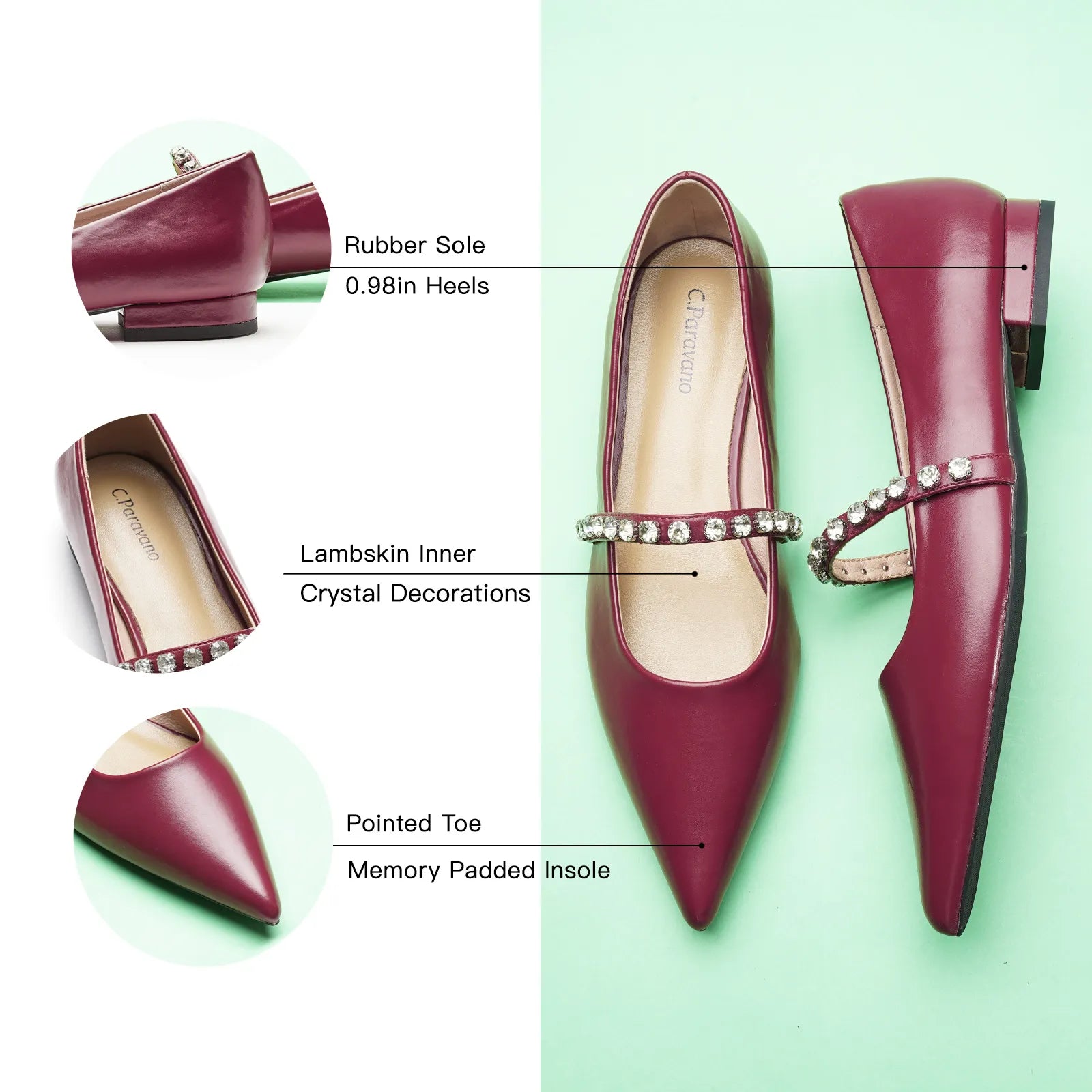 Unlike traditional Mary Jane shoes, we have made some innovations in this model. We adopted a pointed toe design which can elongate the legs and create a sleek, sophisticated look. Crystal studs set along the strap add texture - and lots of sparkle - to the look