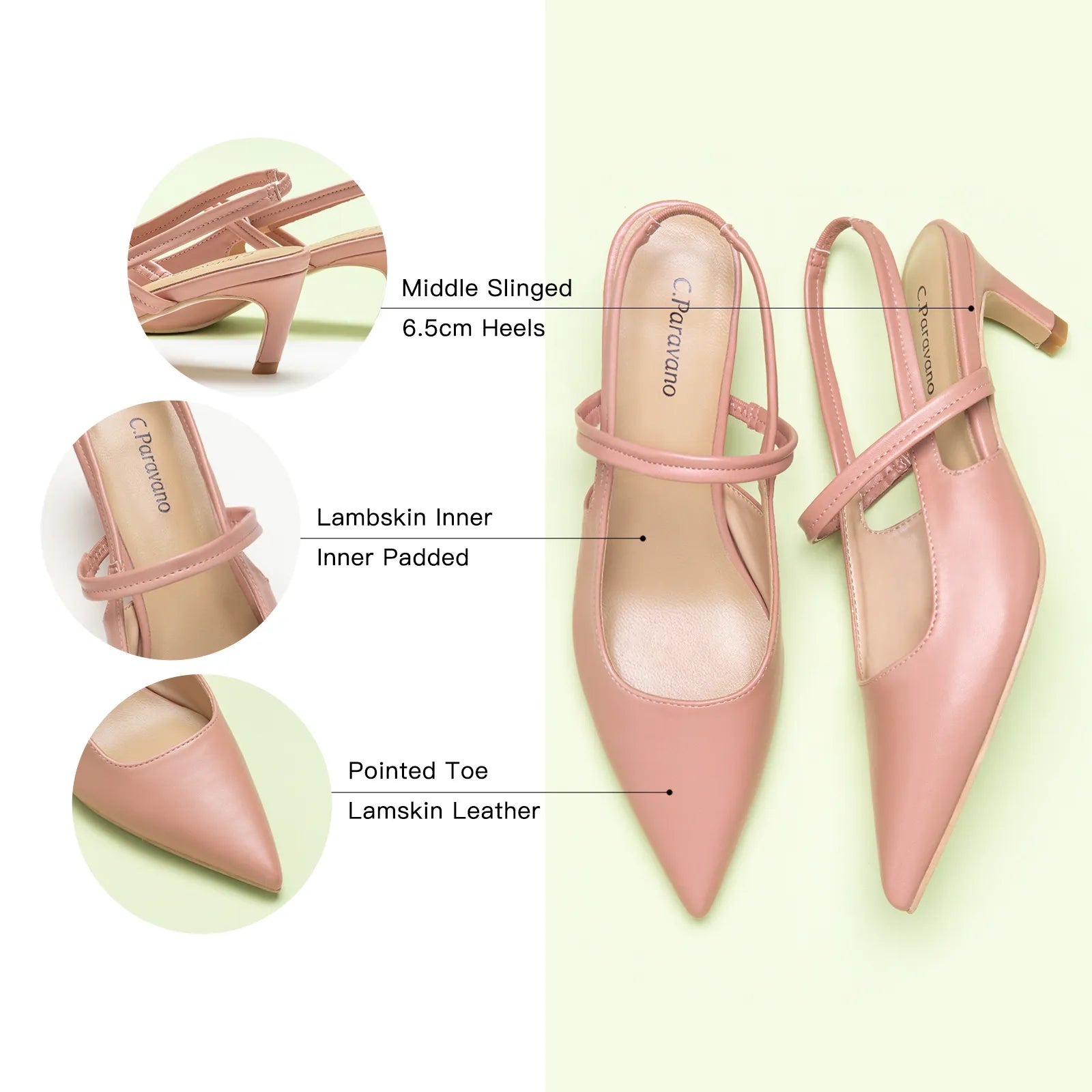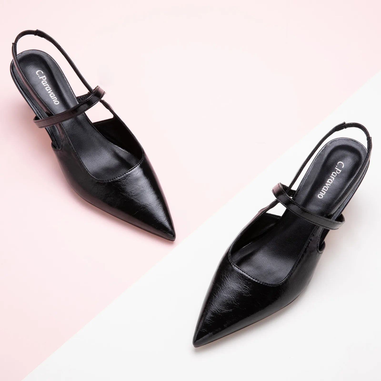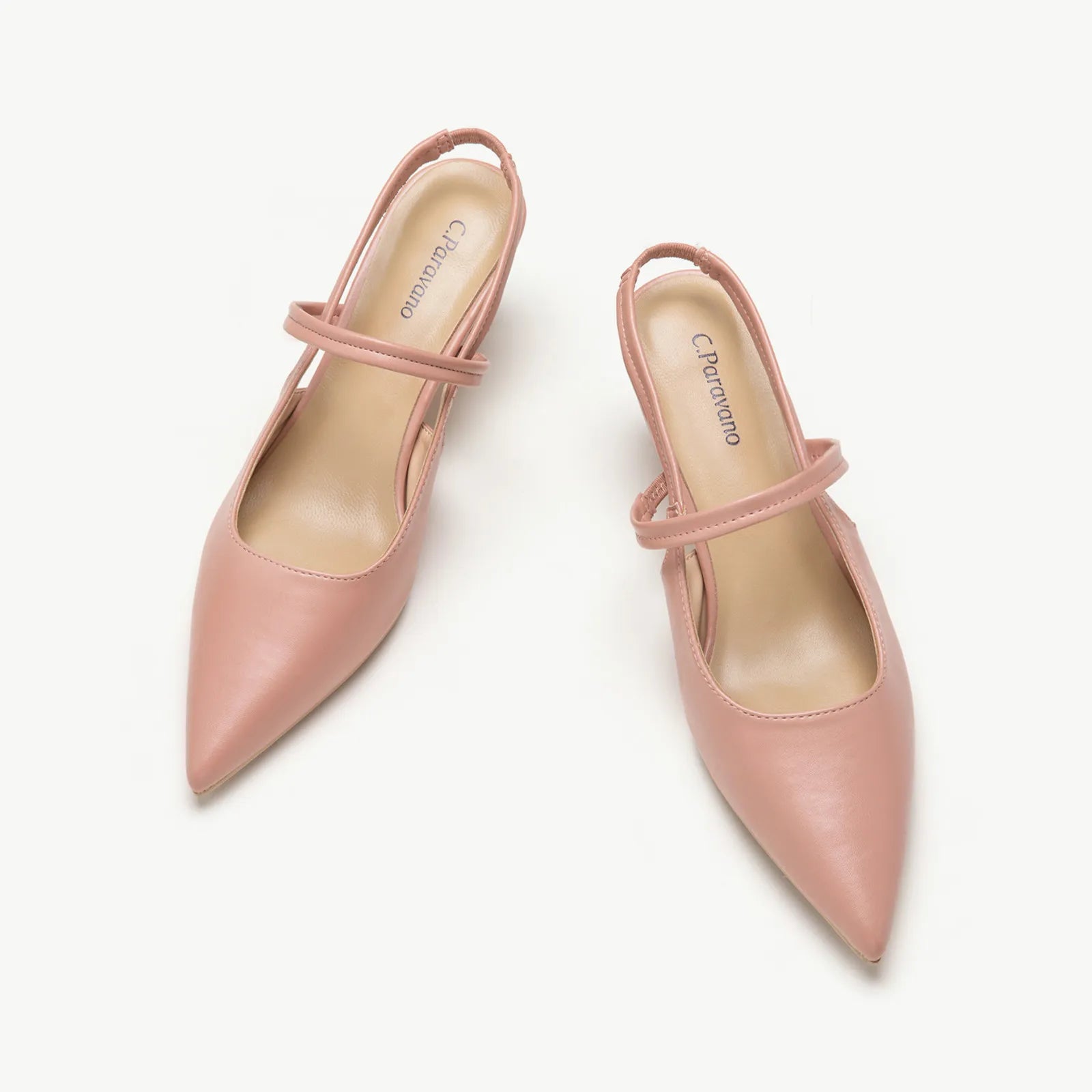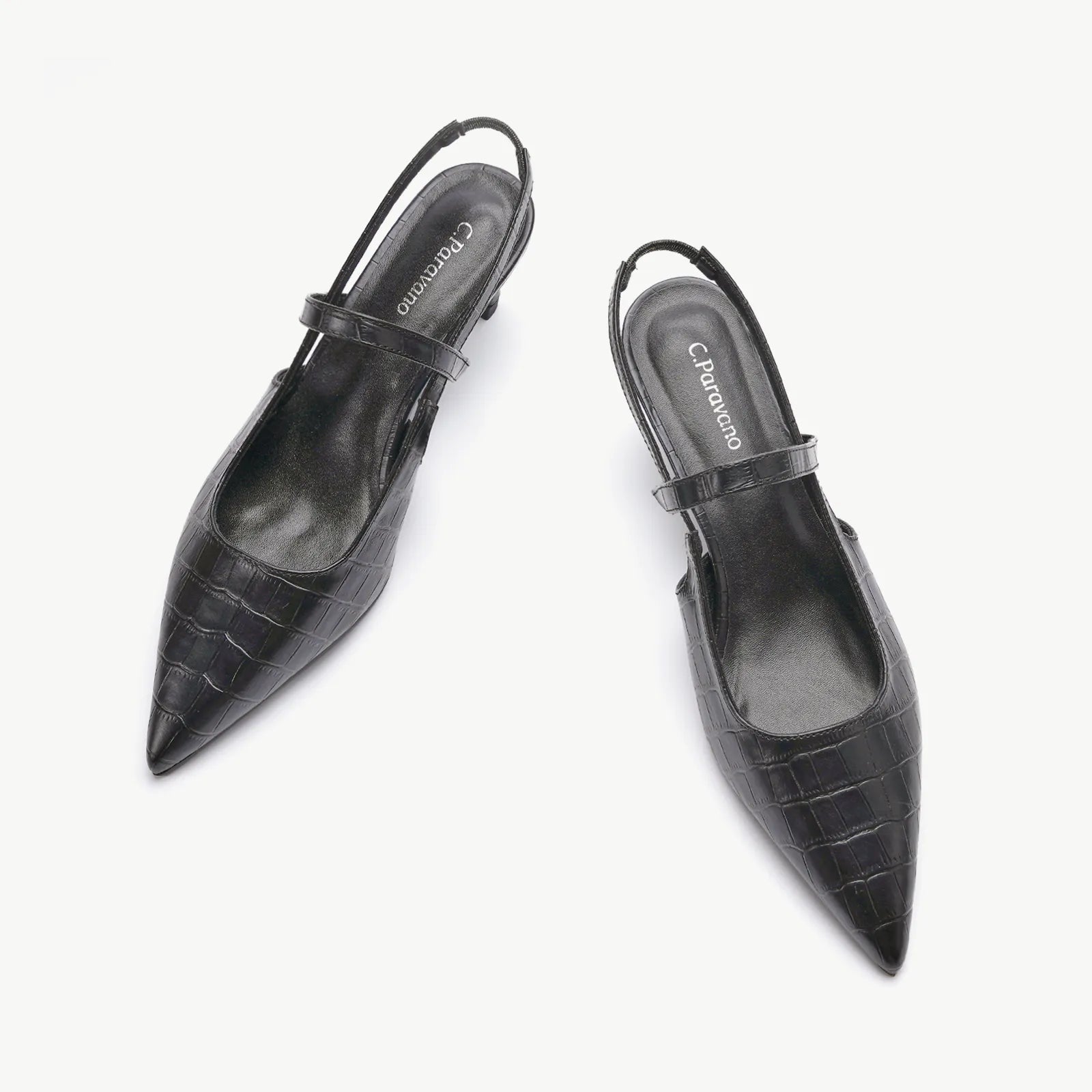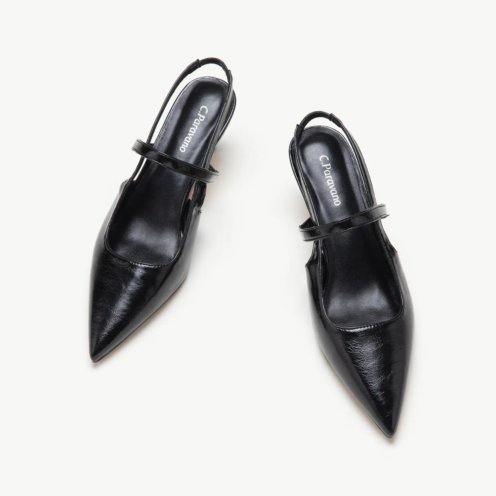 - C.Paravano slingback heels have a sharp silhouette with a pointed toe, slim elastic straps, soft leather lining and a sculpted heel measuring 65mm. The instep strap ensures a snug fit, preventing heel slippage. You can wear them to go from work to dinner.