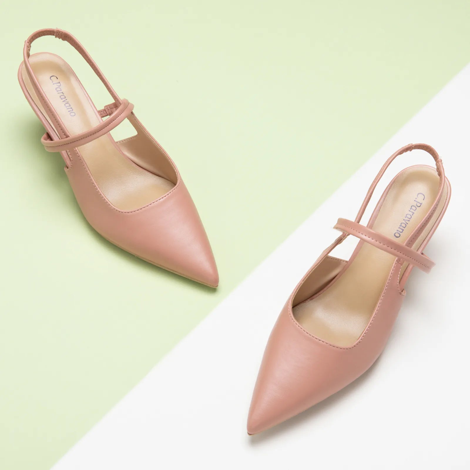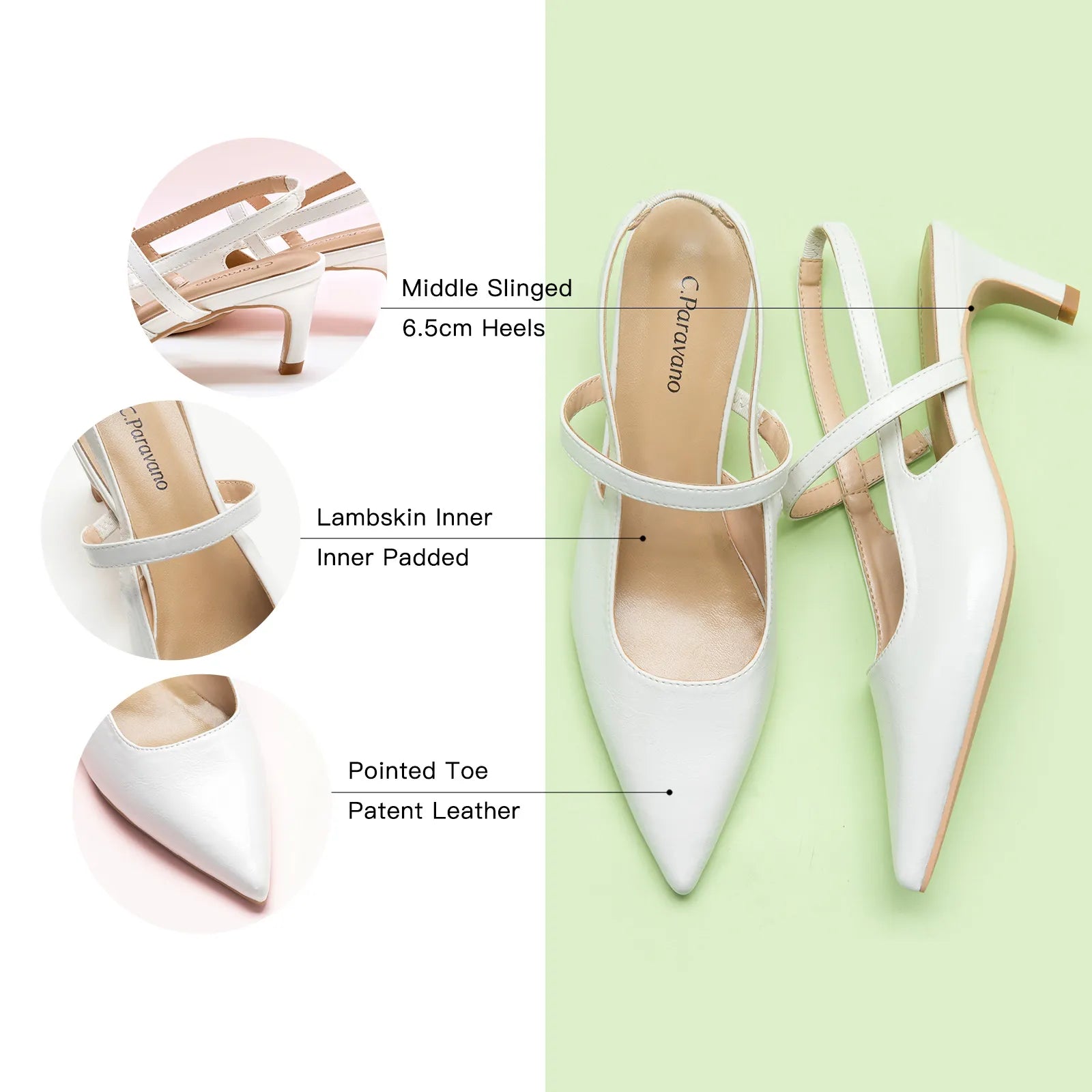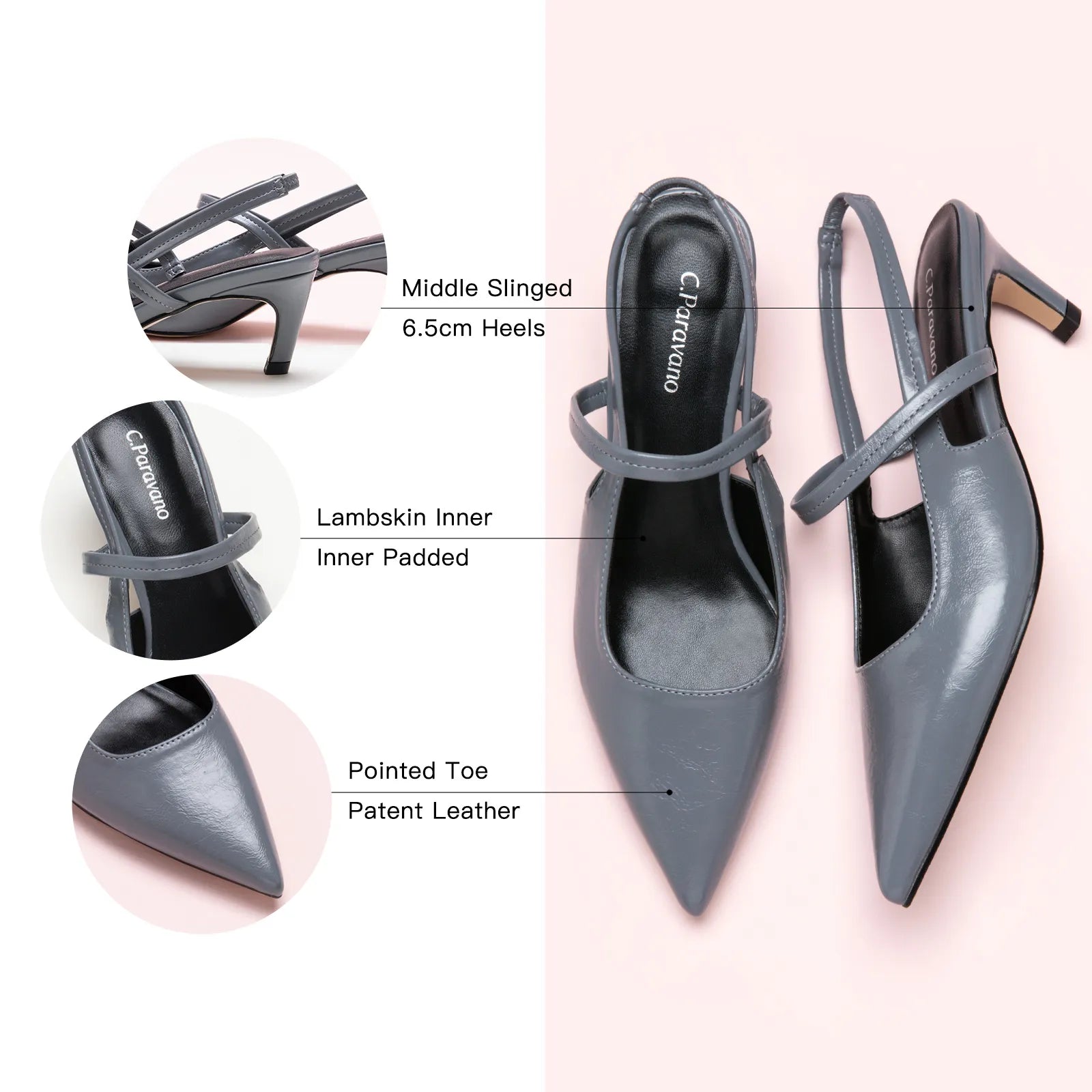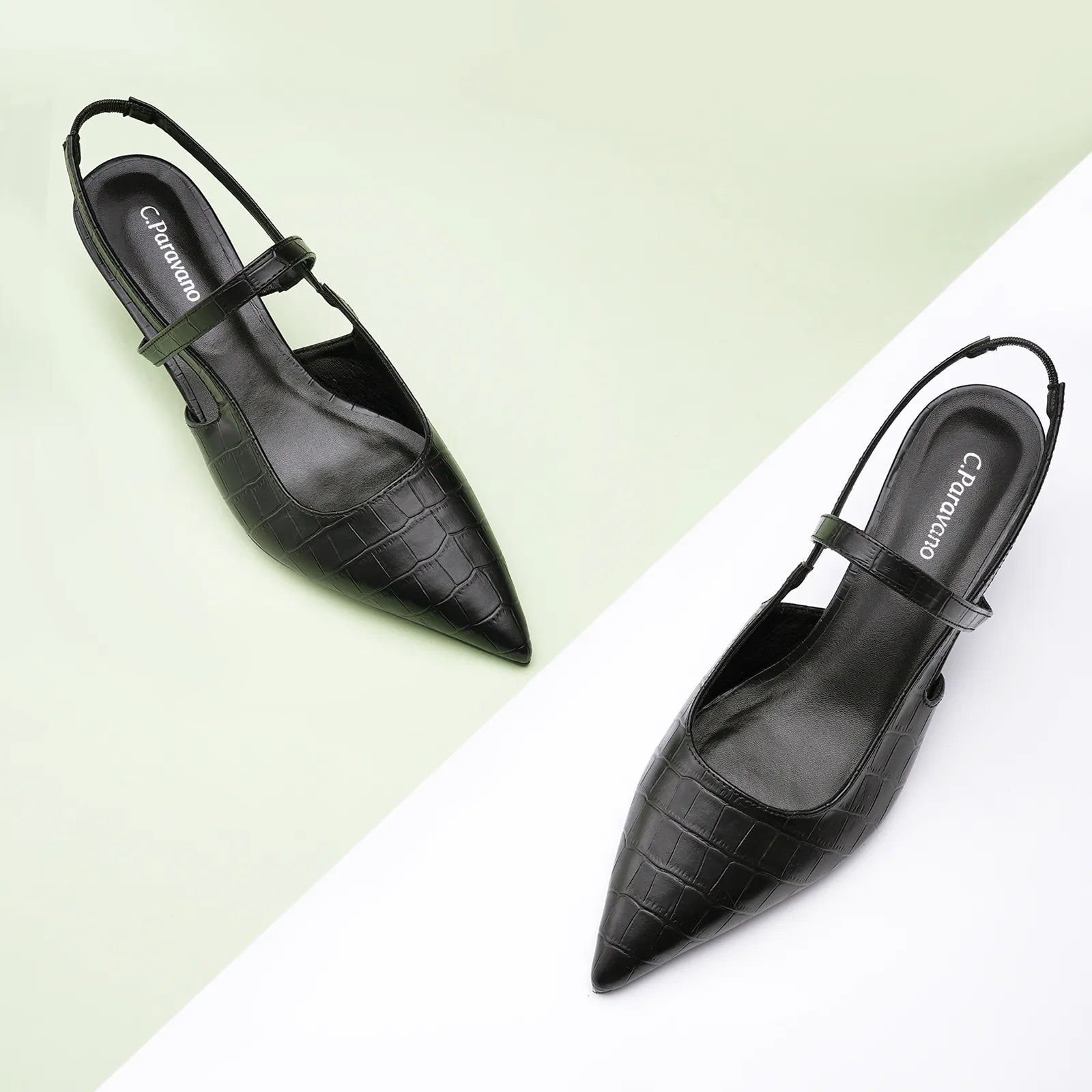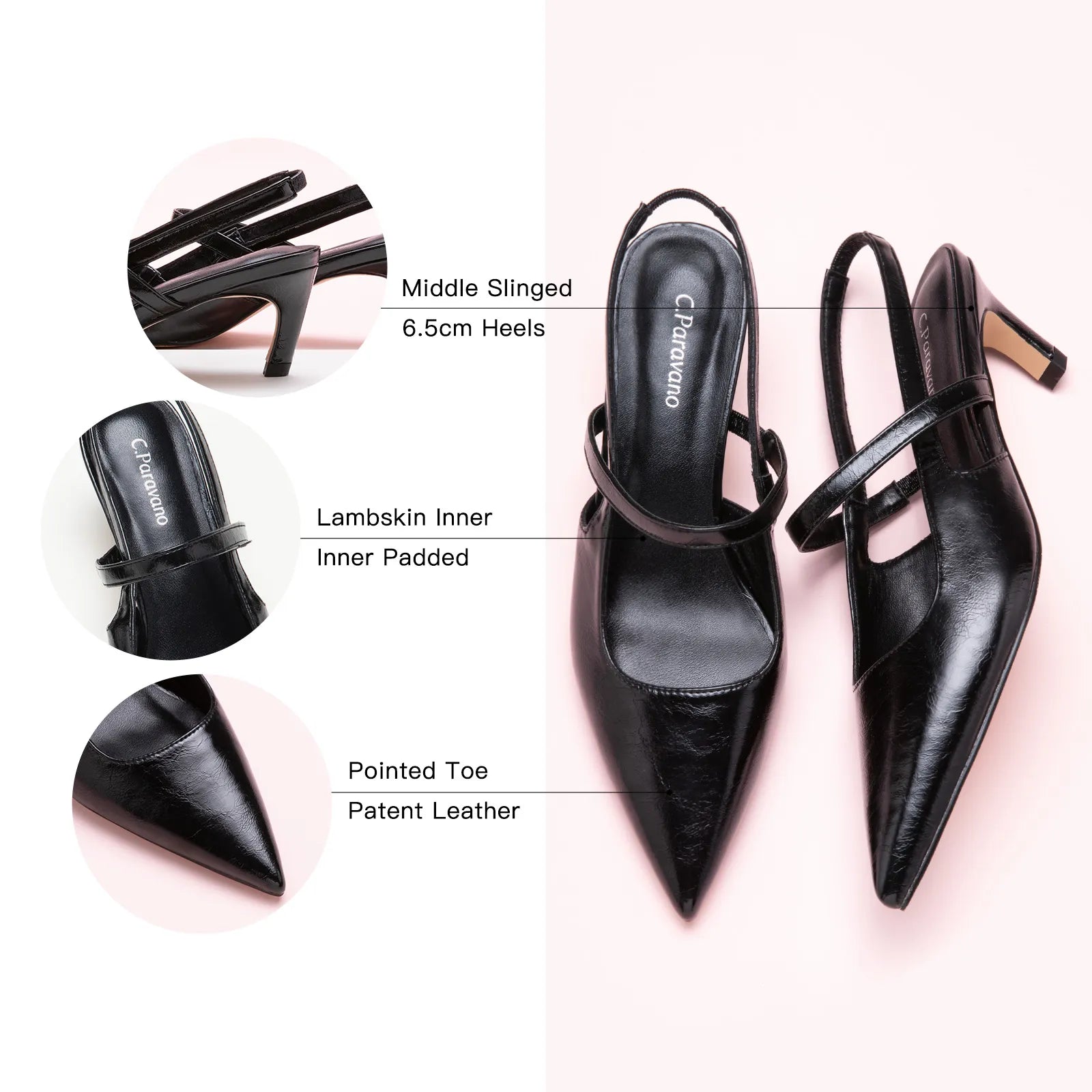 - C.Paravano slingback heels have a sharp silhouette with a pointed toe, slim elastic straps, soft leather lining and a sculpted heel measuring 65mm. The instep strap ensures a snug fit, preventing heel slippage. You can wear them to go from work to dinner.
