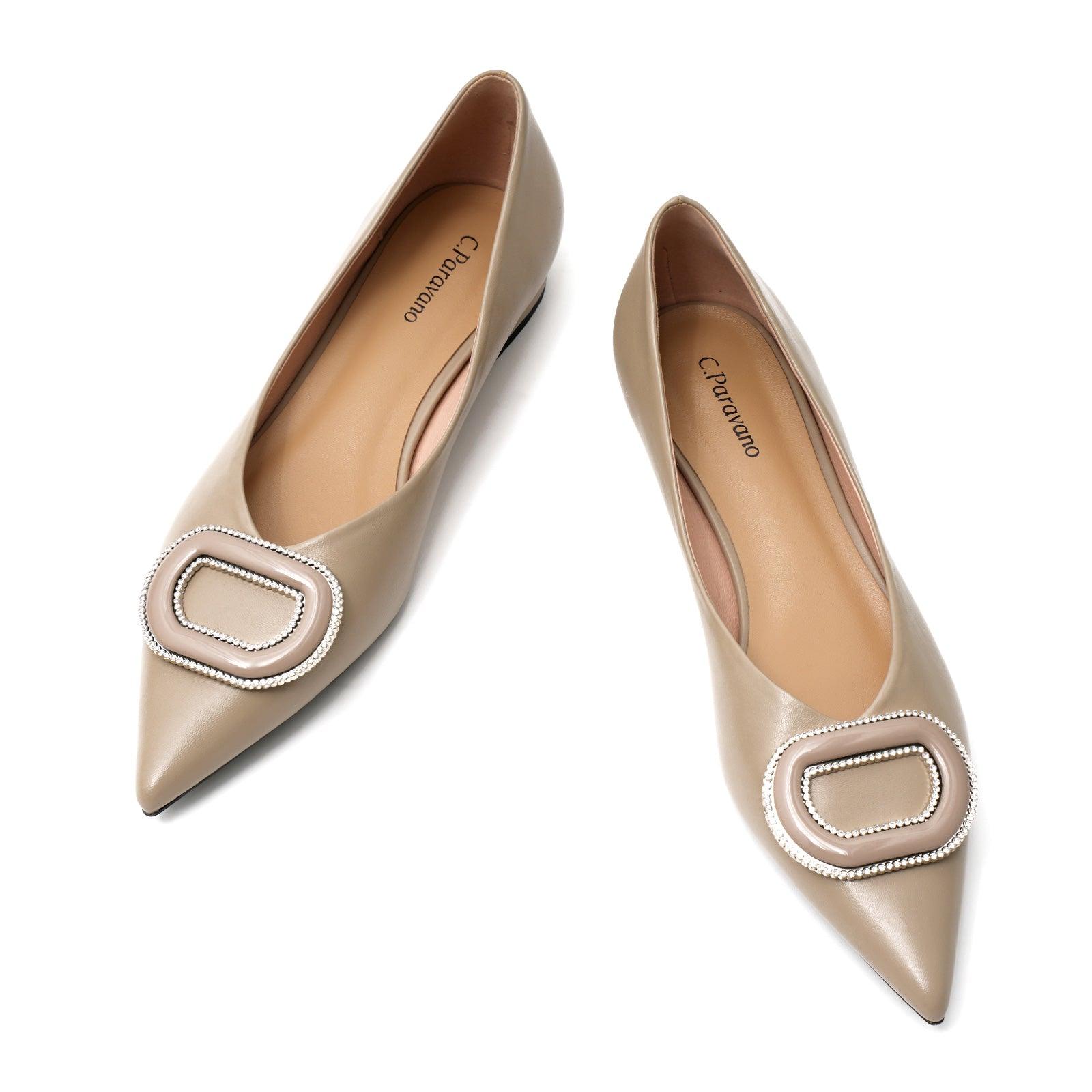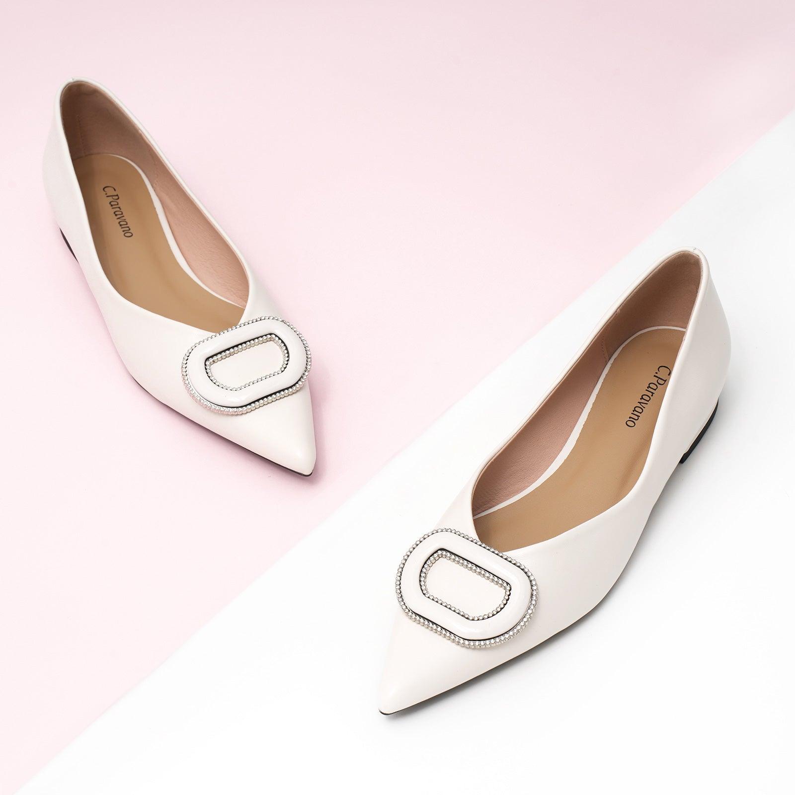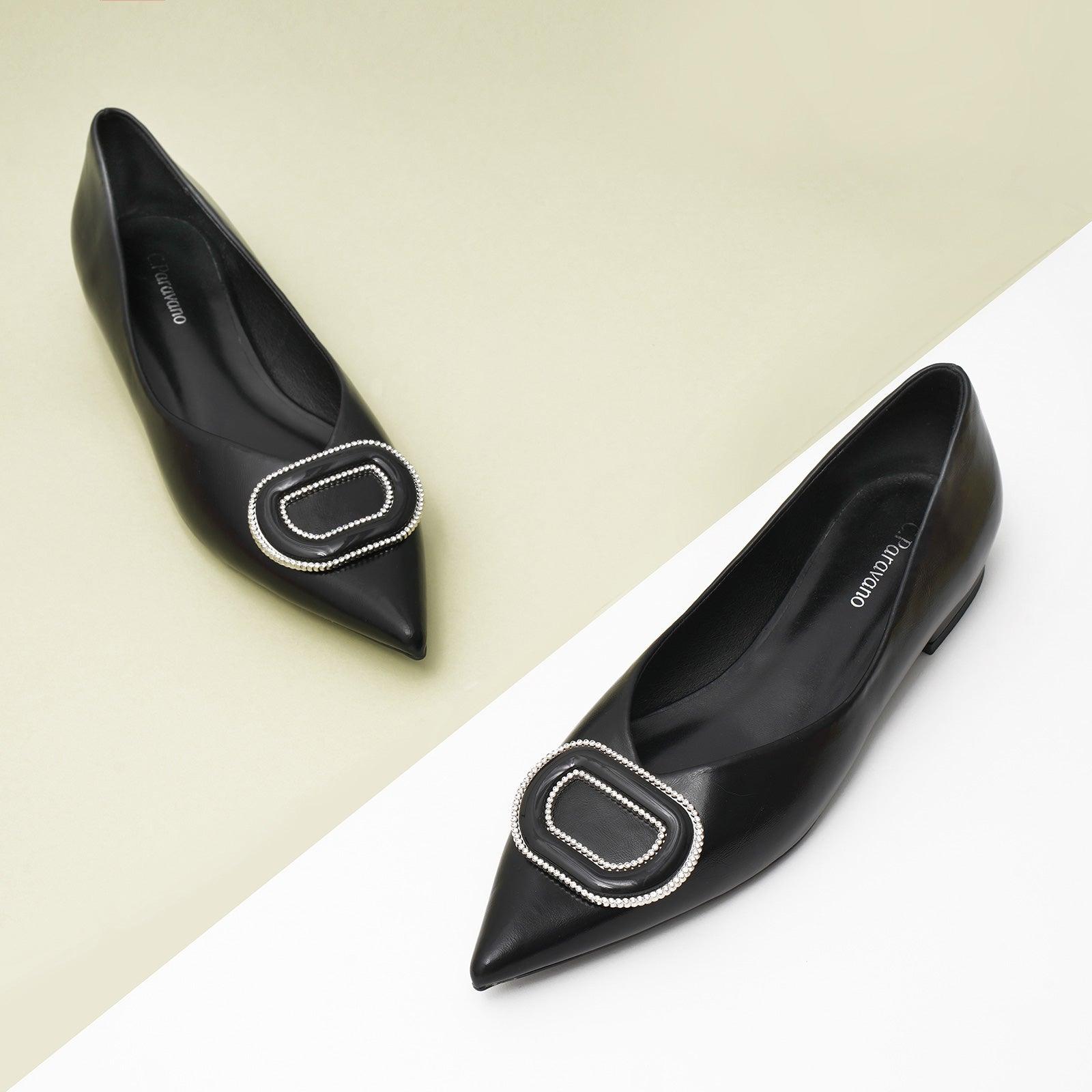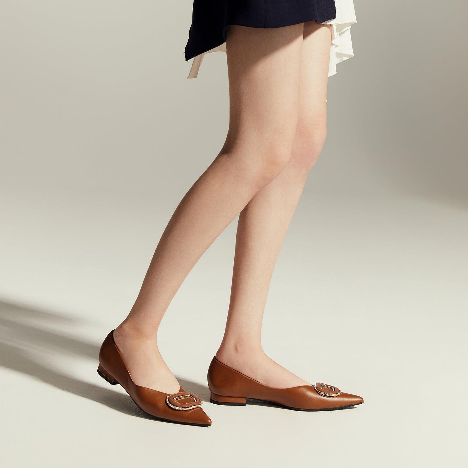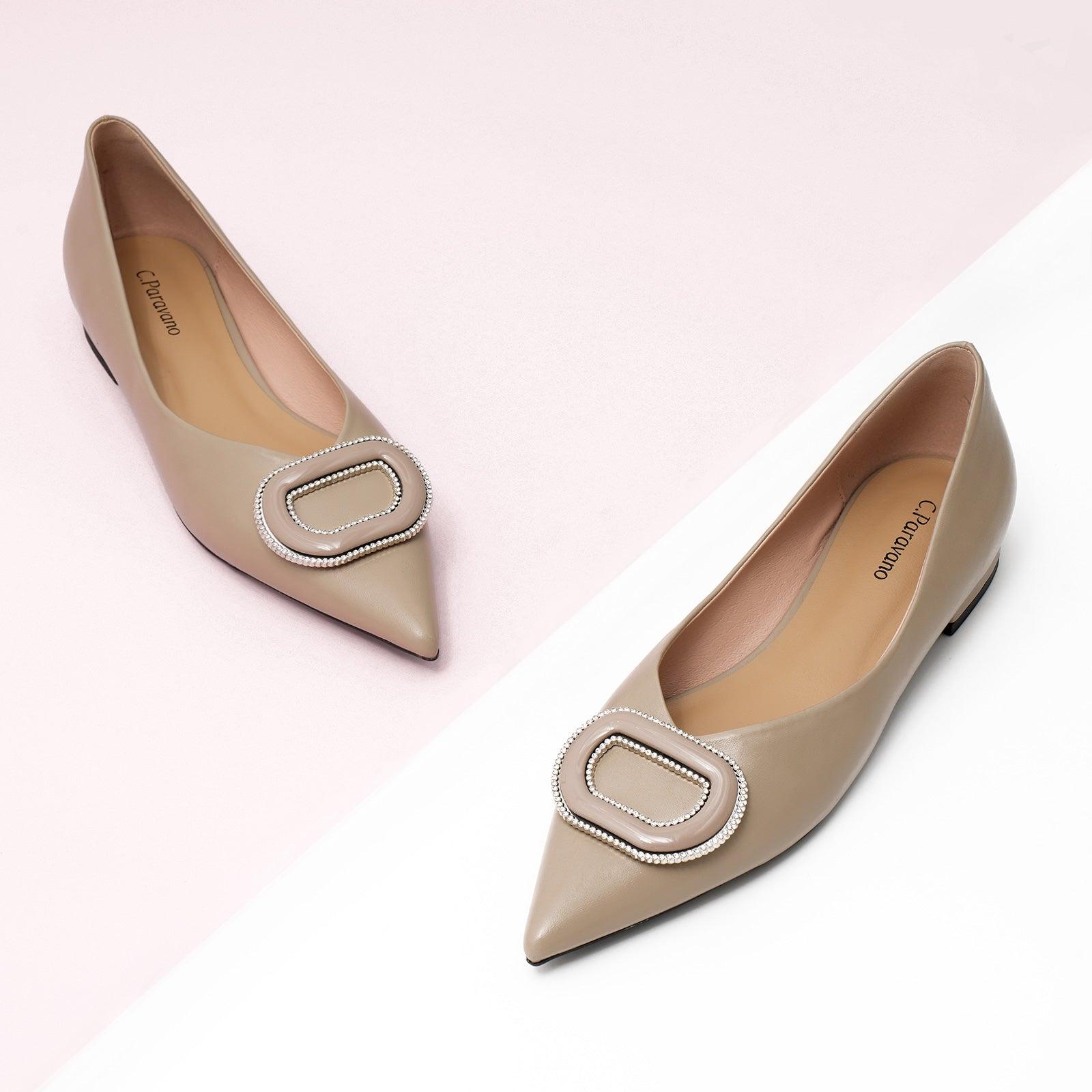 - Clean and chic, these soft leather flats will quickly become an essential part in your workwear wardrobe. Timeless pointed-toes create an sophisticated profile that is further enhanced with distinctive buckle embellishment and a grippy sole adorned with iconic prints. However you choose to wear them, they will look elegant.