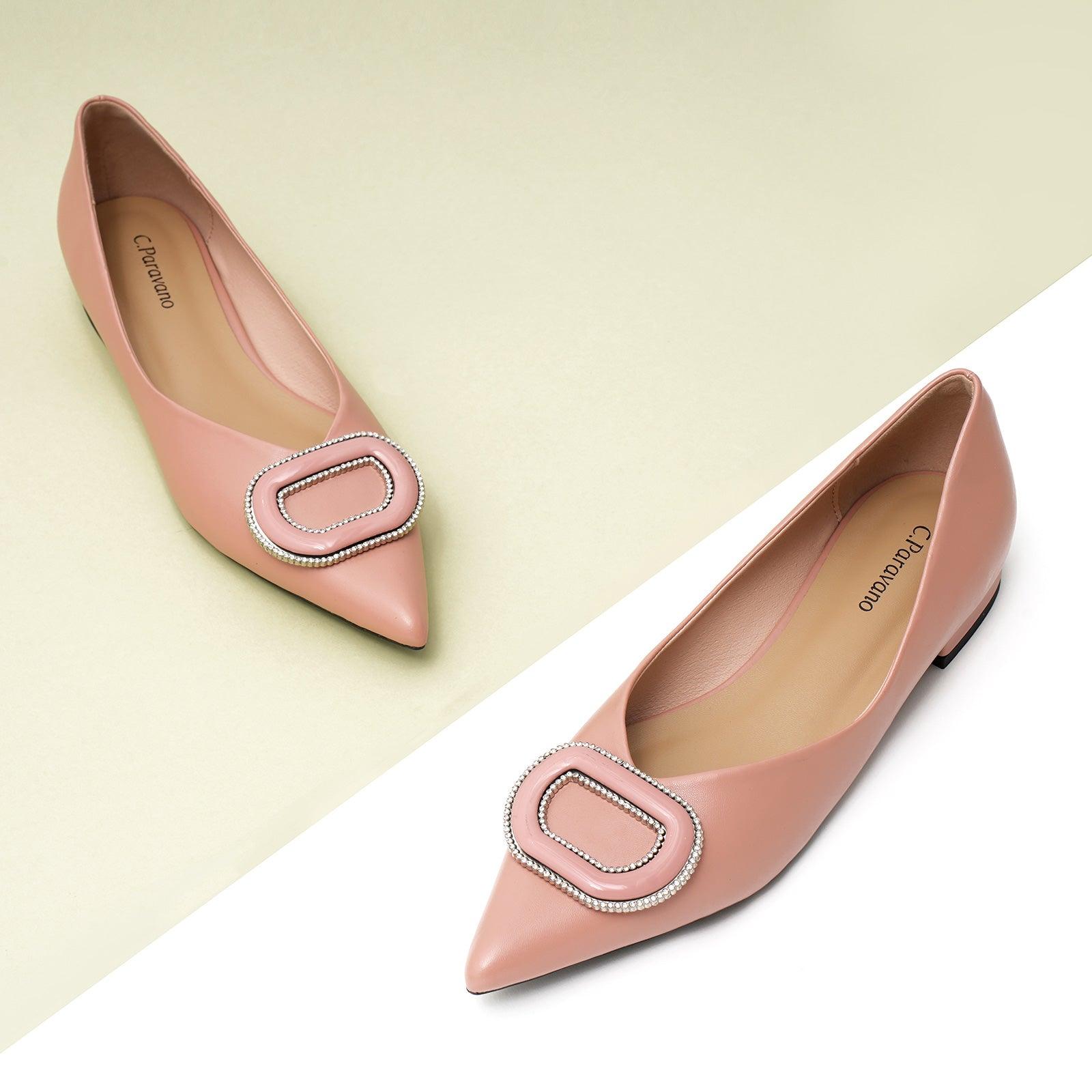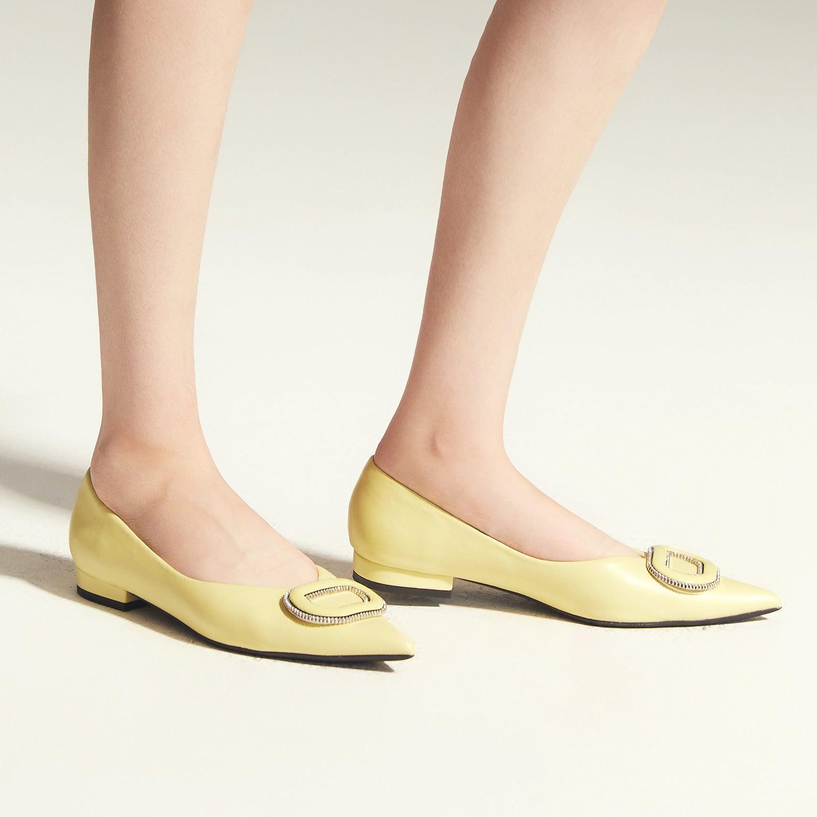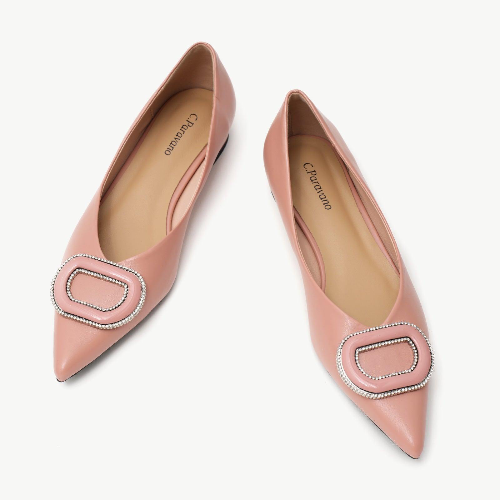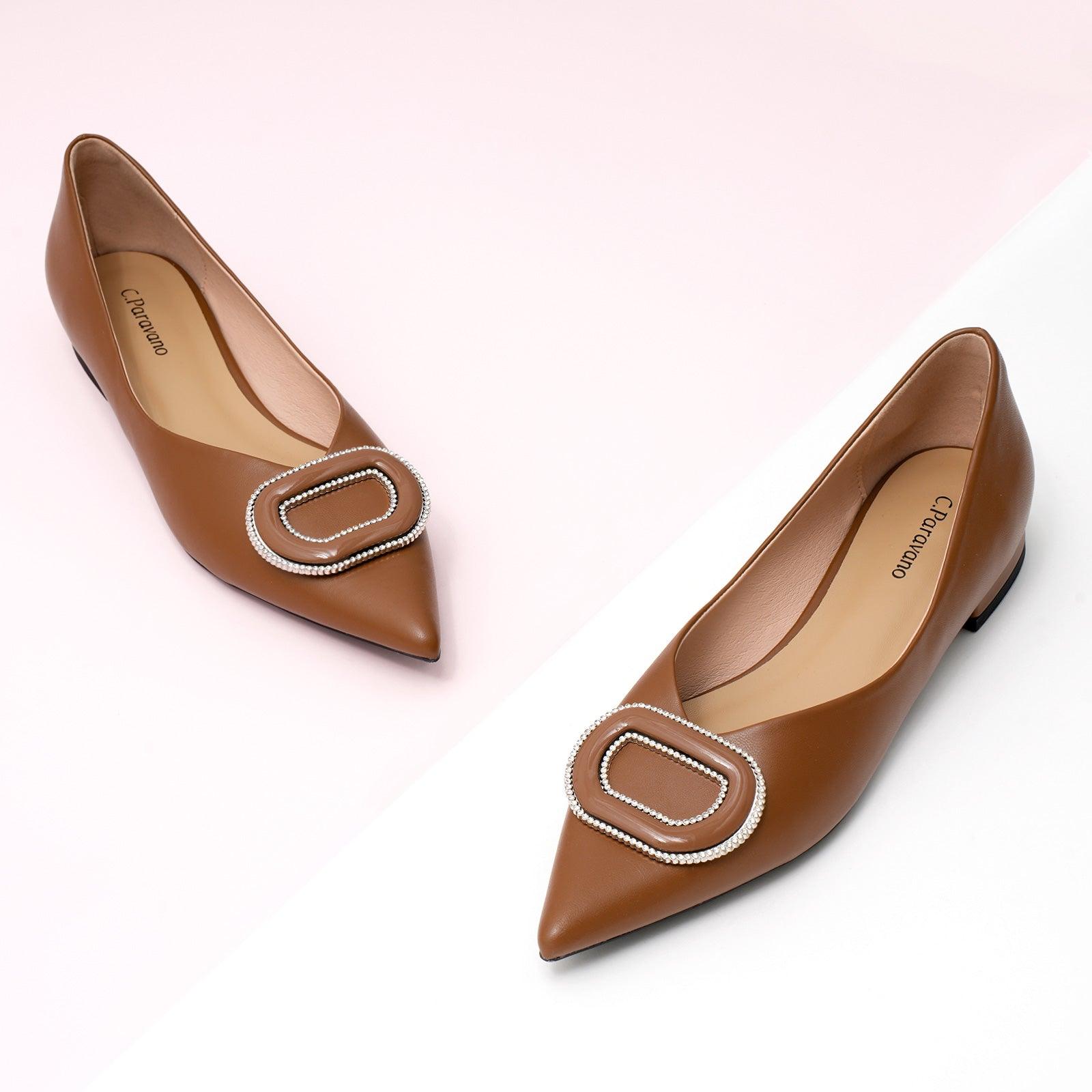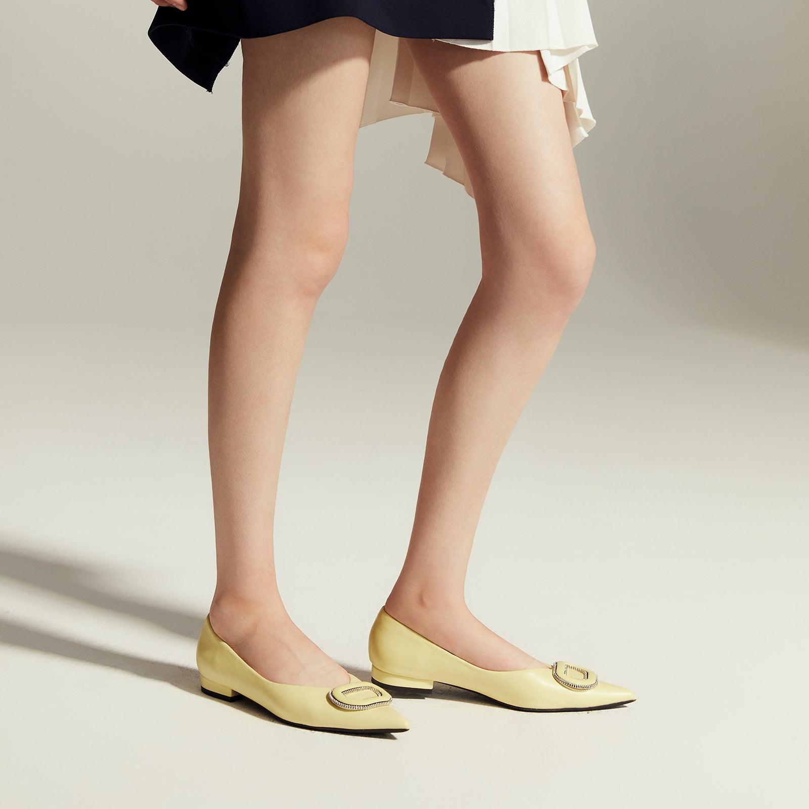 - Clean and chic, these soft leather flats will quickly become an essential part in your workwear wardrobe. Timeless pointed-toes create an sophisticated profile that is further enhanced with distinctive buckle embellishment and a grippy sole adorned with iconic prints. However you choose to wear them, they will look elegant.