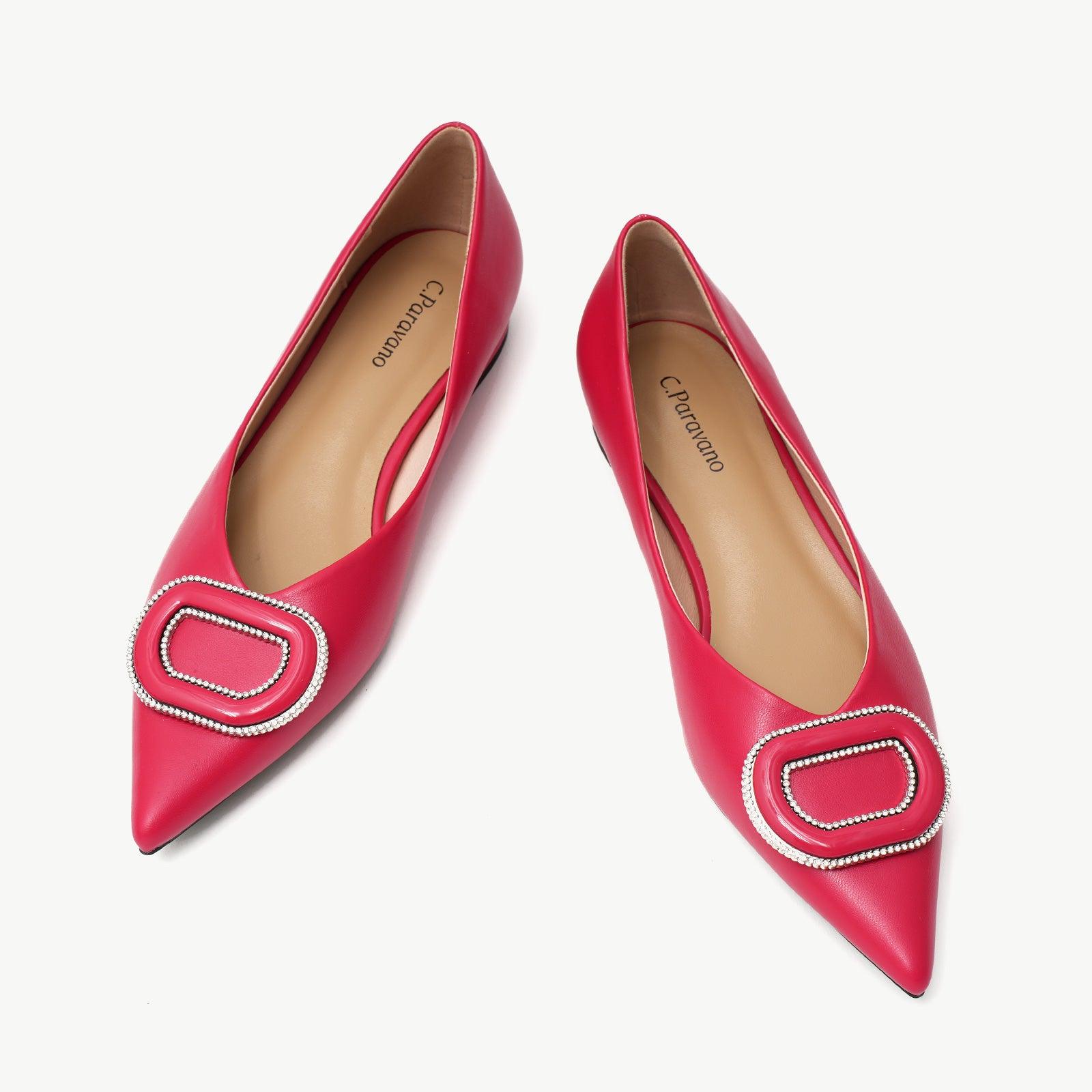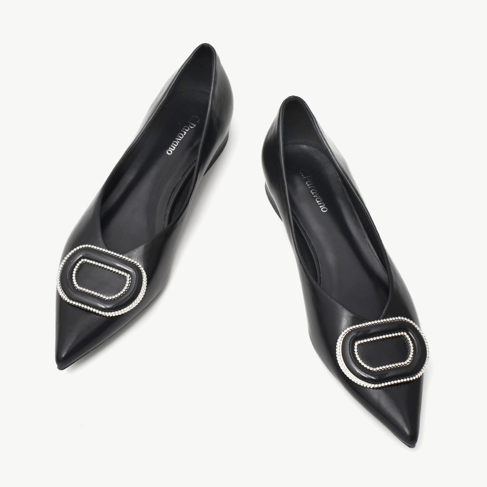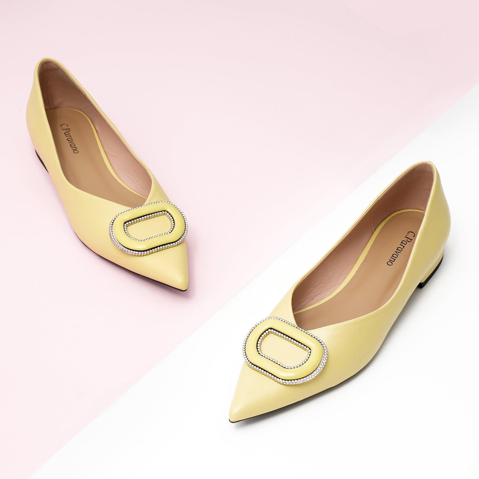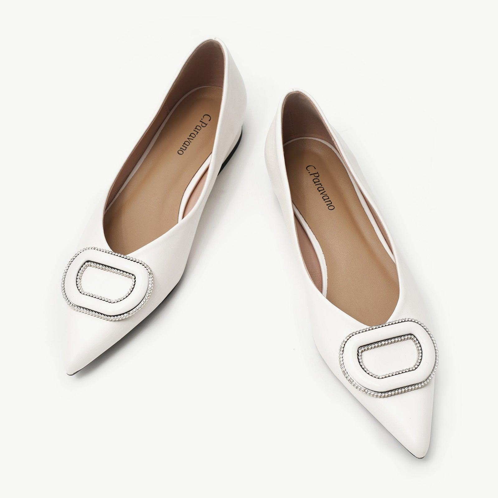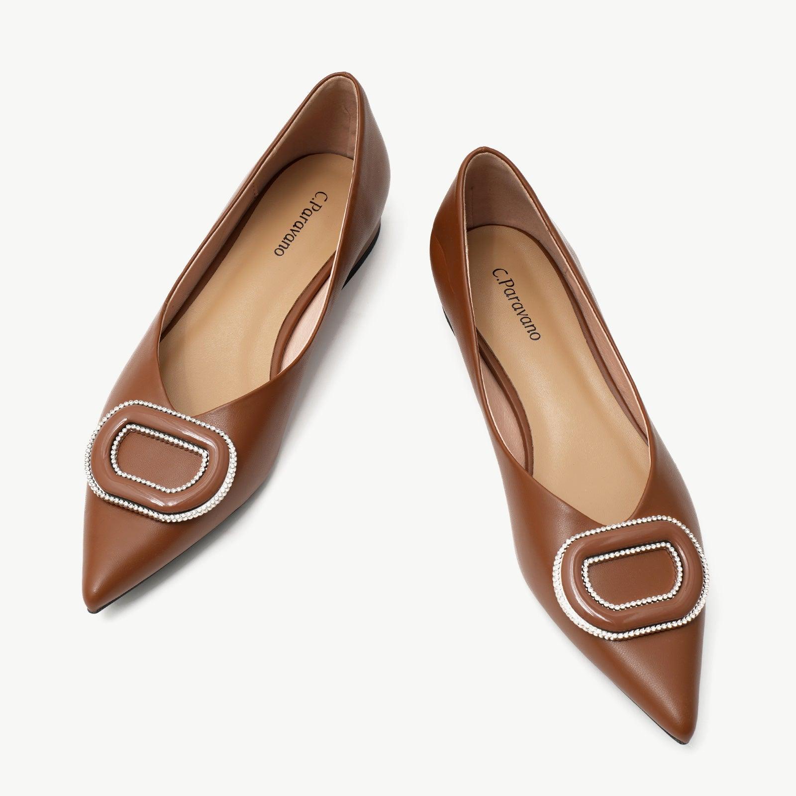 - Clean and chic, these soft leather flats will quickly become an essential part in your workwear wardrobe. Timeless pointed-toes create an sophisticated profile that is further enhanced with distinctive buckle embellishment and a grippy sole adorned with iconic prints. However you choose to wear them, they will look elegant.