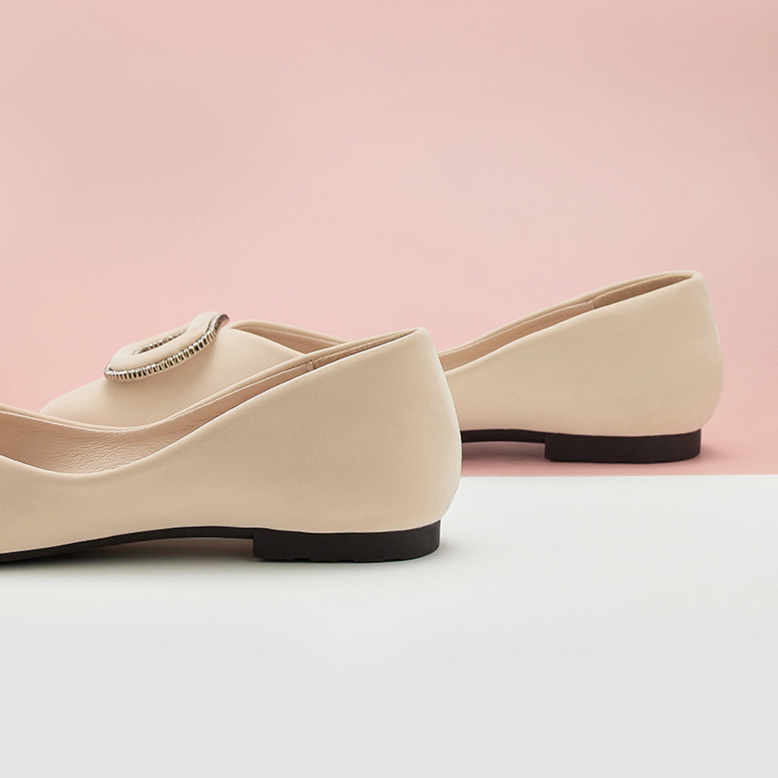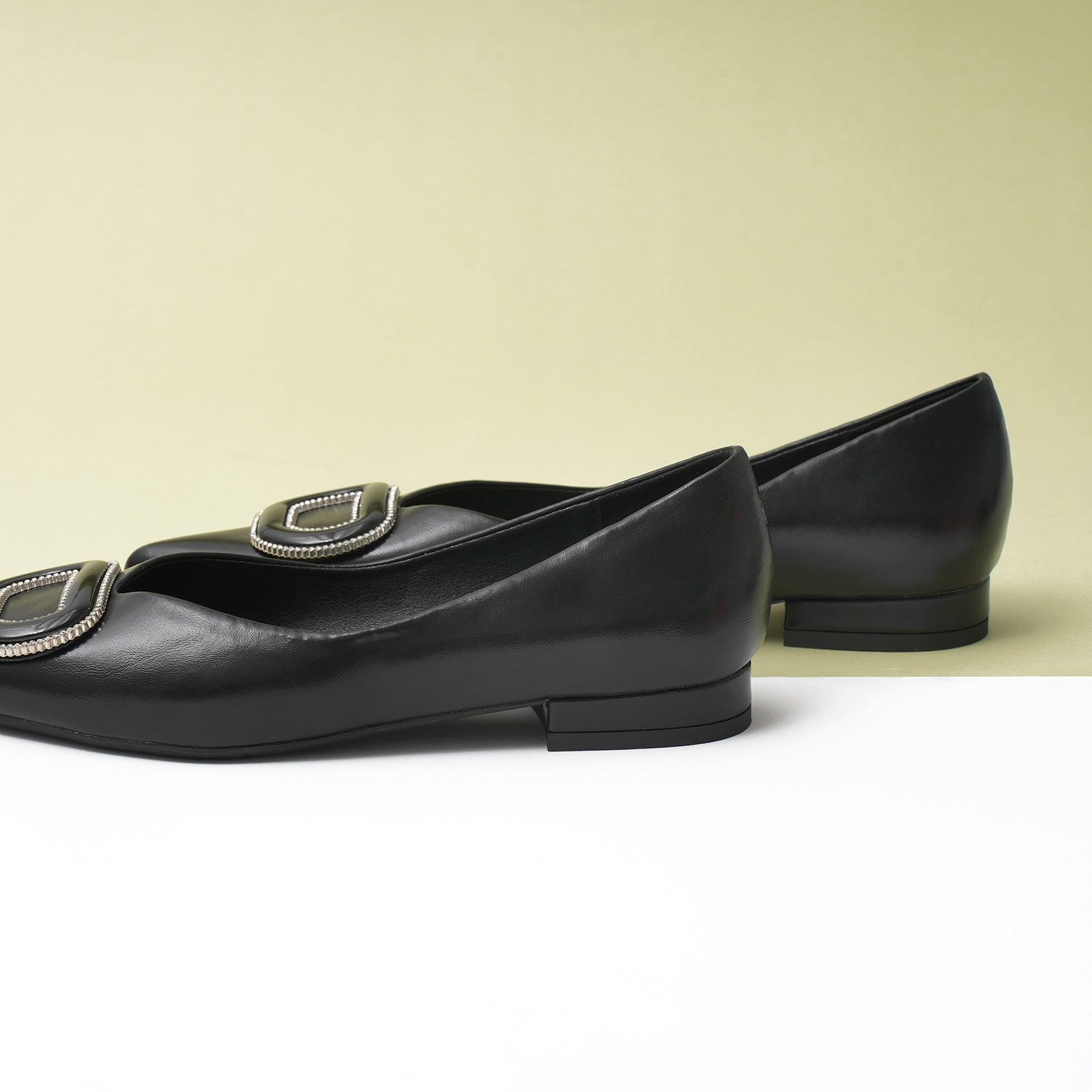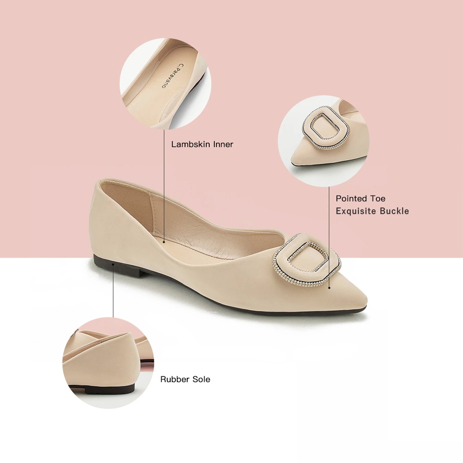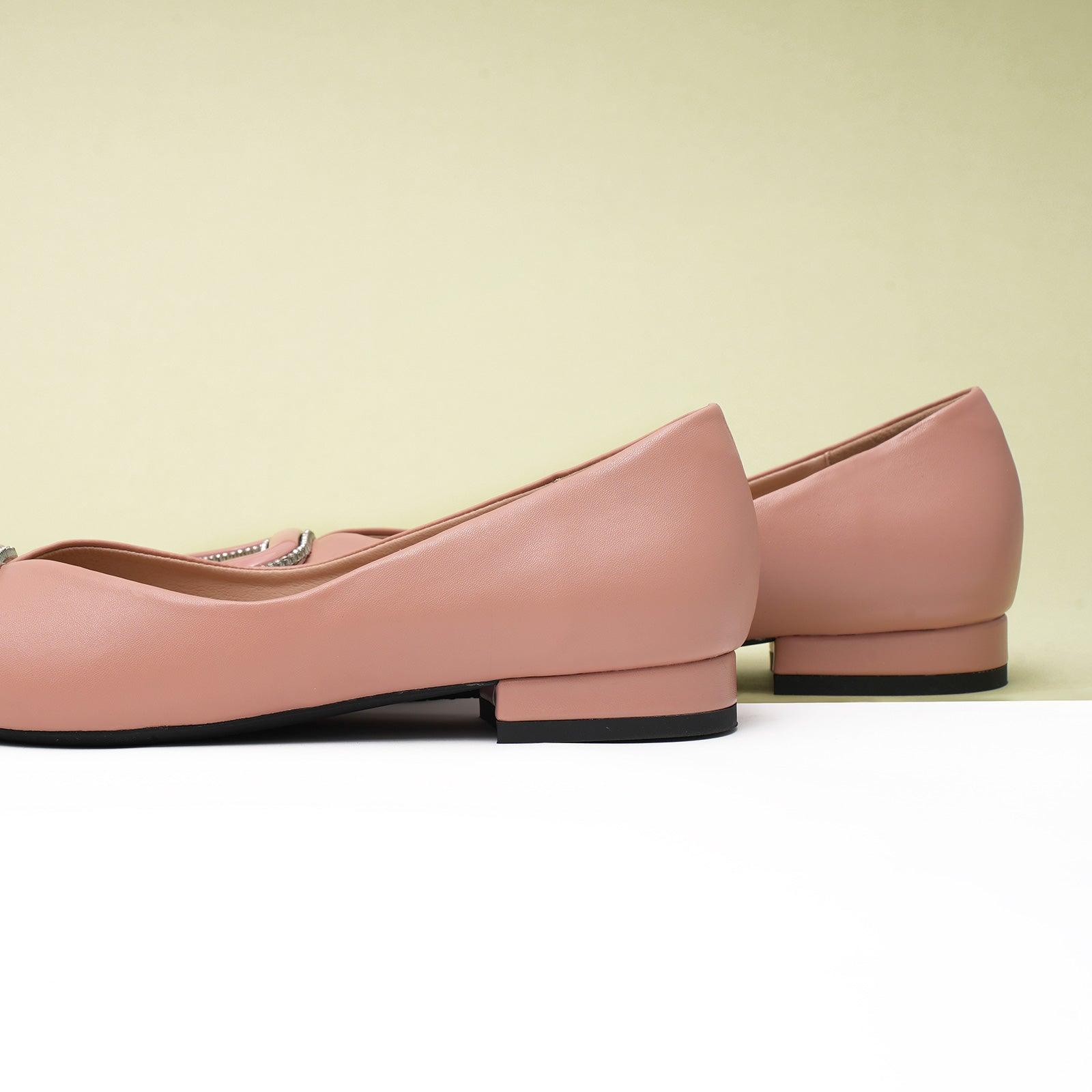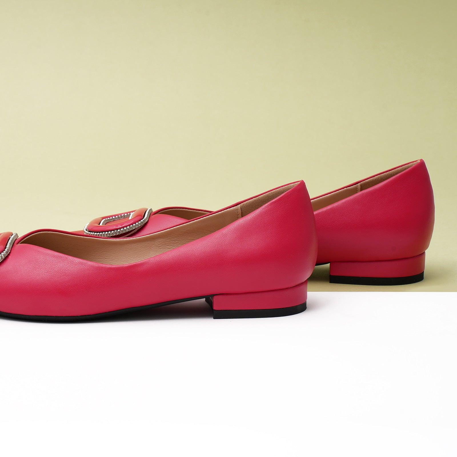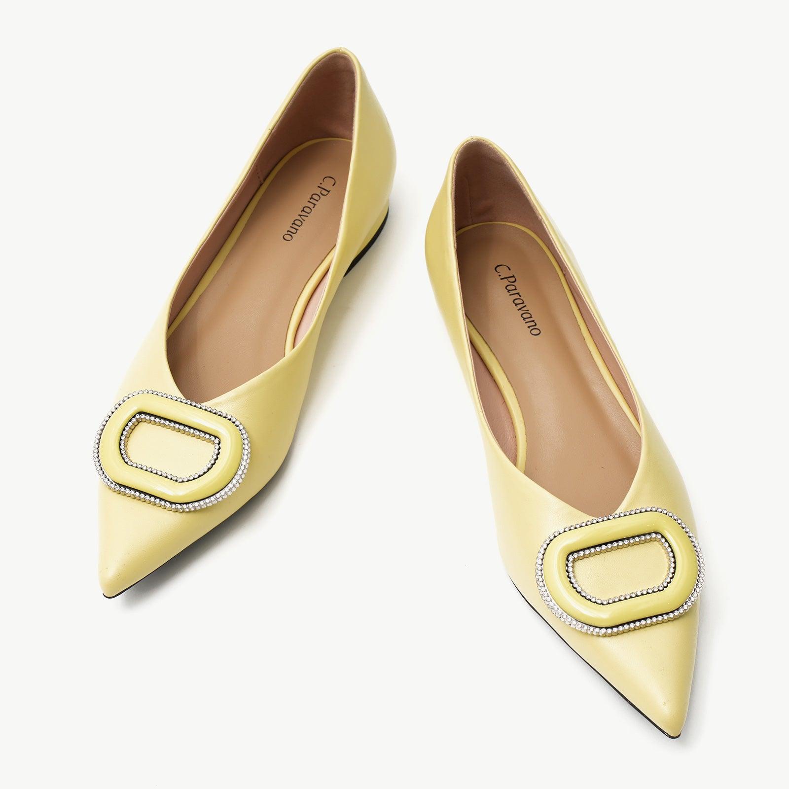 - Clean and chic, these soft leather flats will quickly become an essential part in your workwear wardrobe. Timeless pointed-toes create an sophisticated profile that is further enhanced with distinctive buckle embellishment and a grippy sole adorned with iconic prints. However you choose to wear them, they will look elegant.