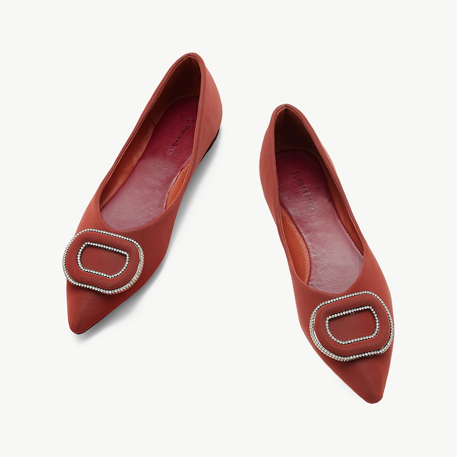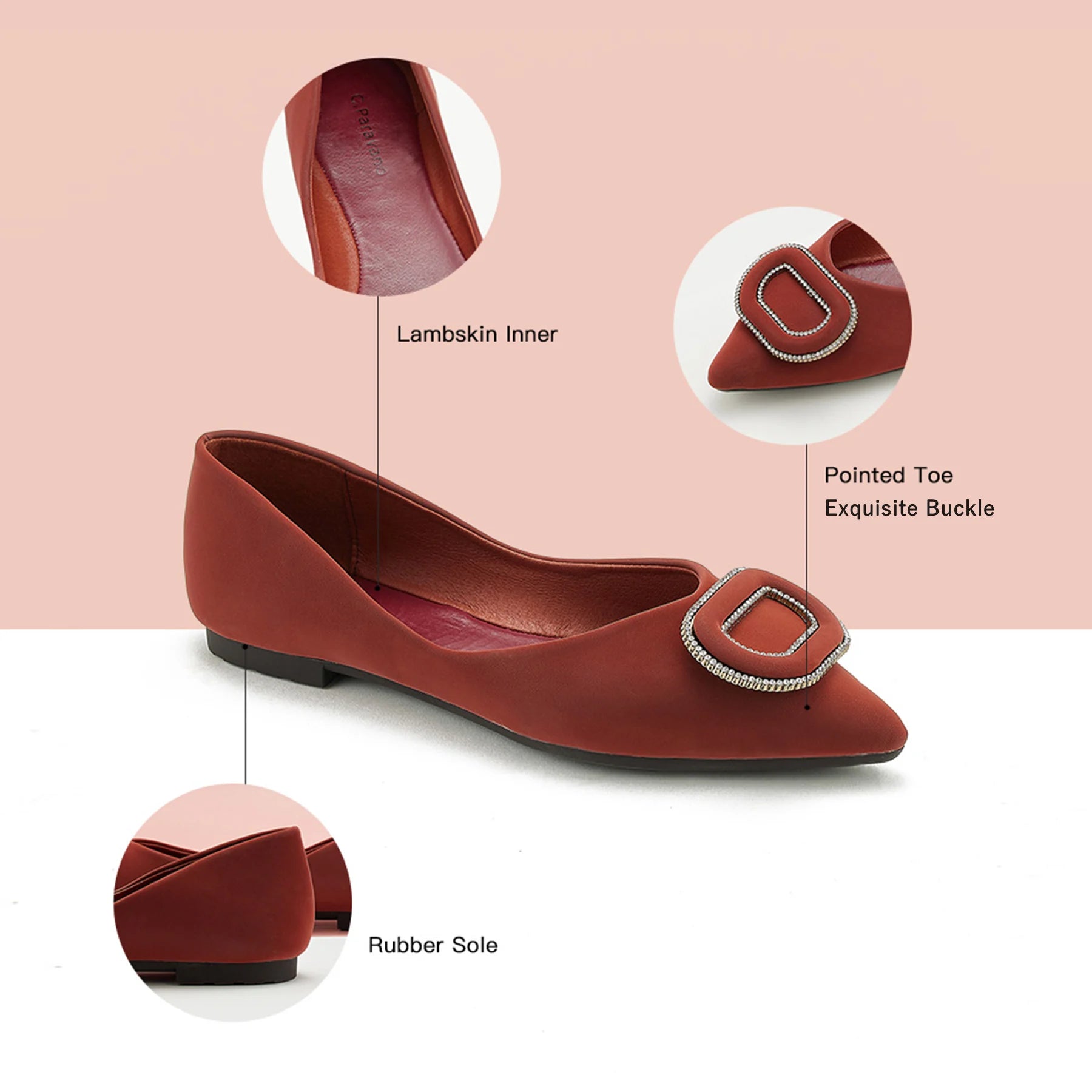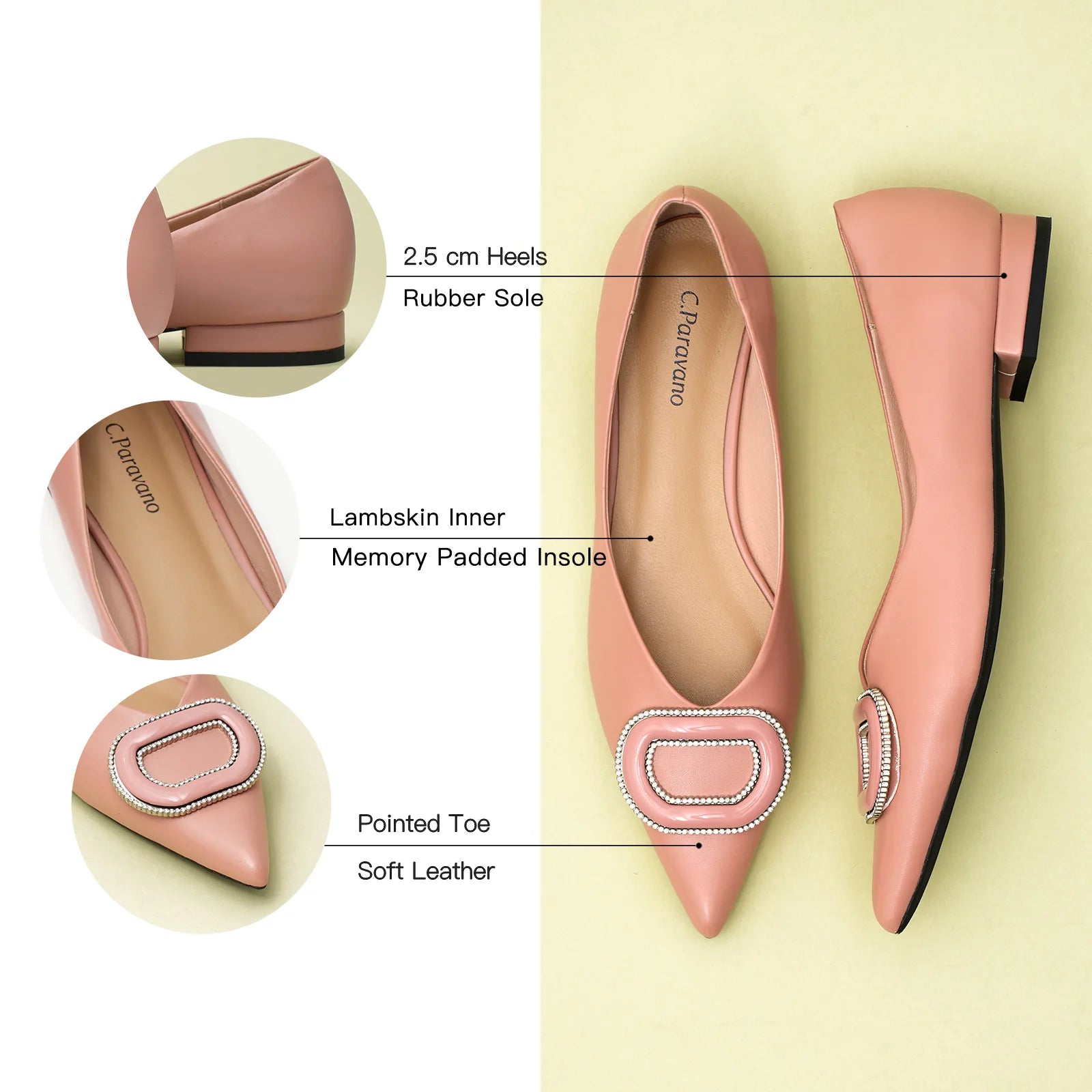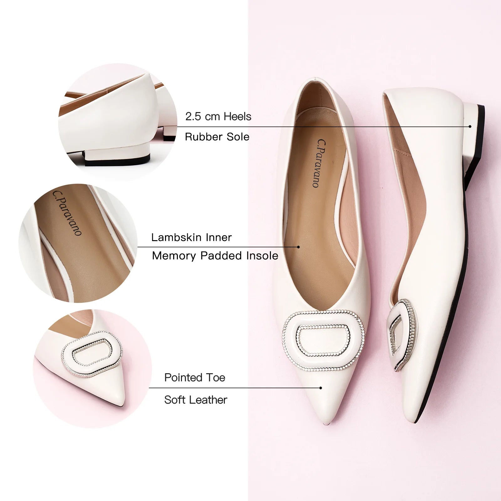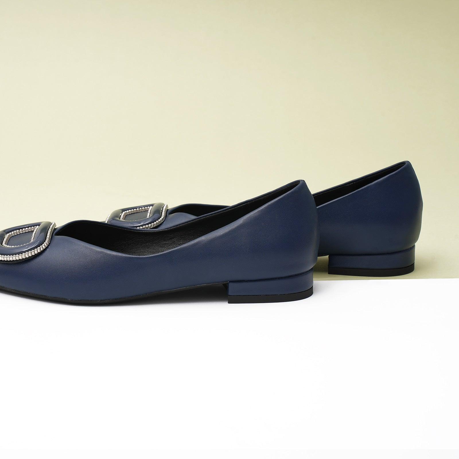 - Clean and chic, these soft leather flats will quickly become an essential part in your workwear wardrobe. Timeless pointed-toes create an sophisticated profile that is further enhanced with distinctive buckle embellishment and a grippy sole adorned with iconic prints. However you choose to wear them, they will look elegant.