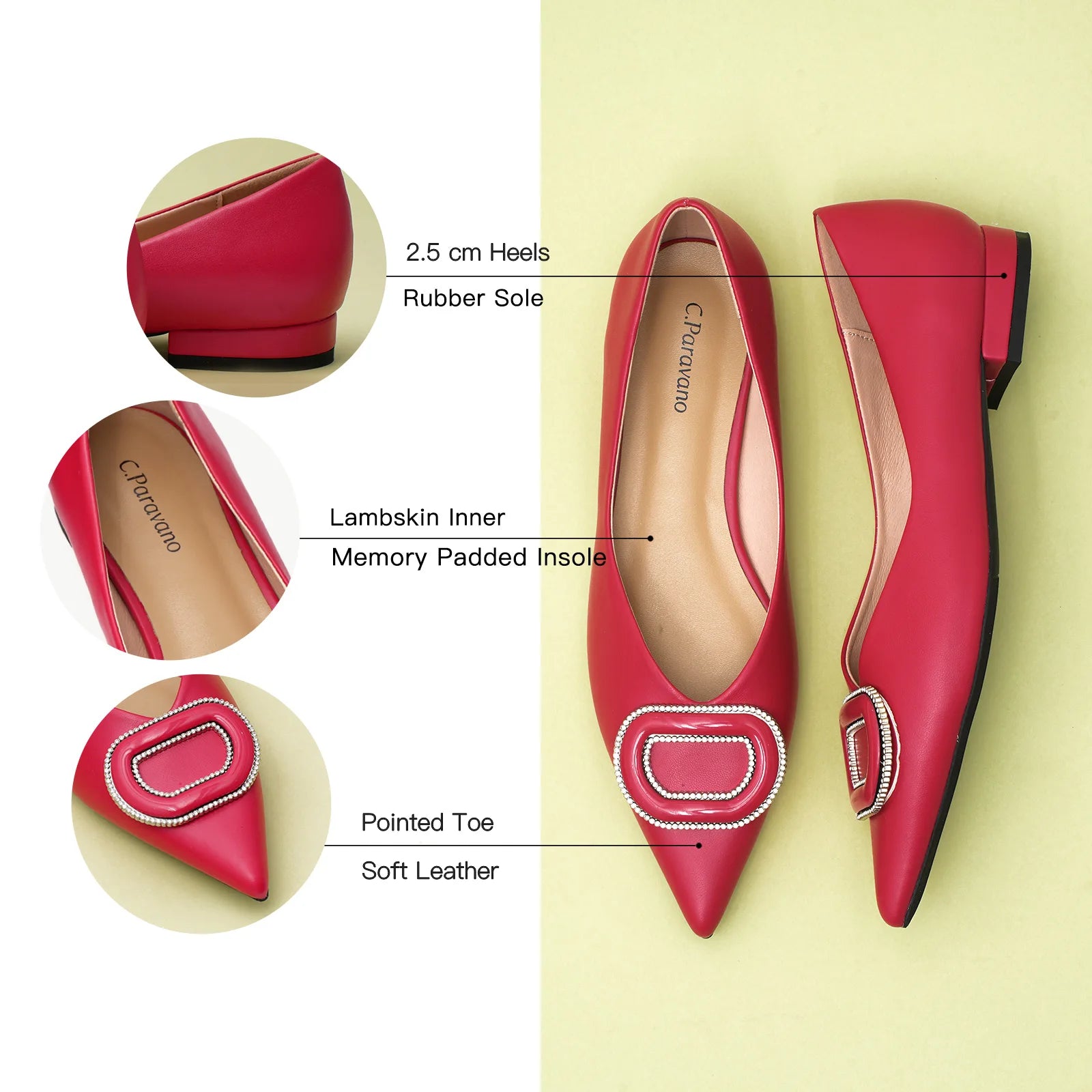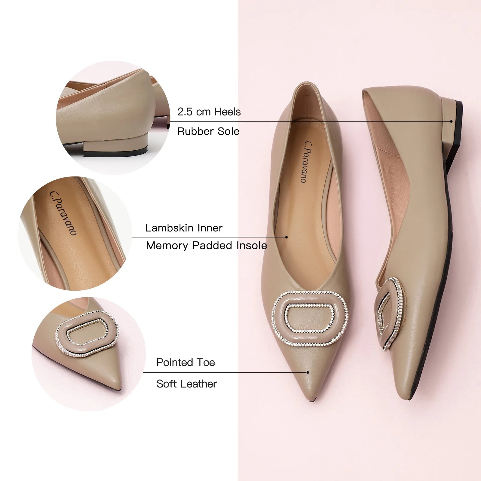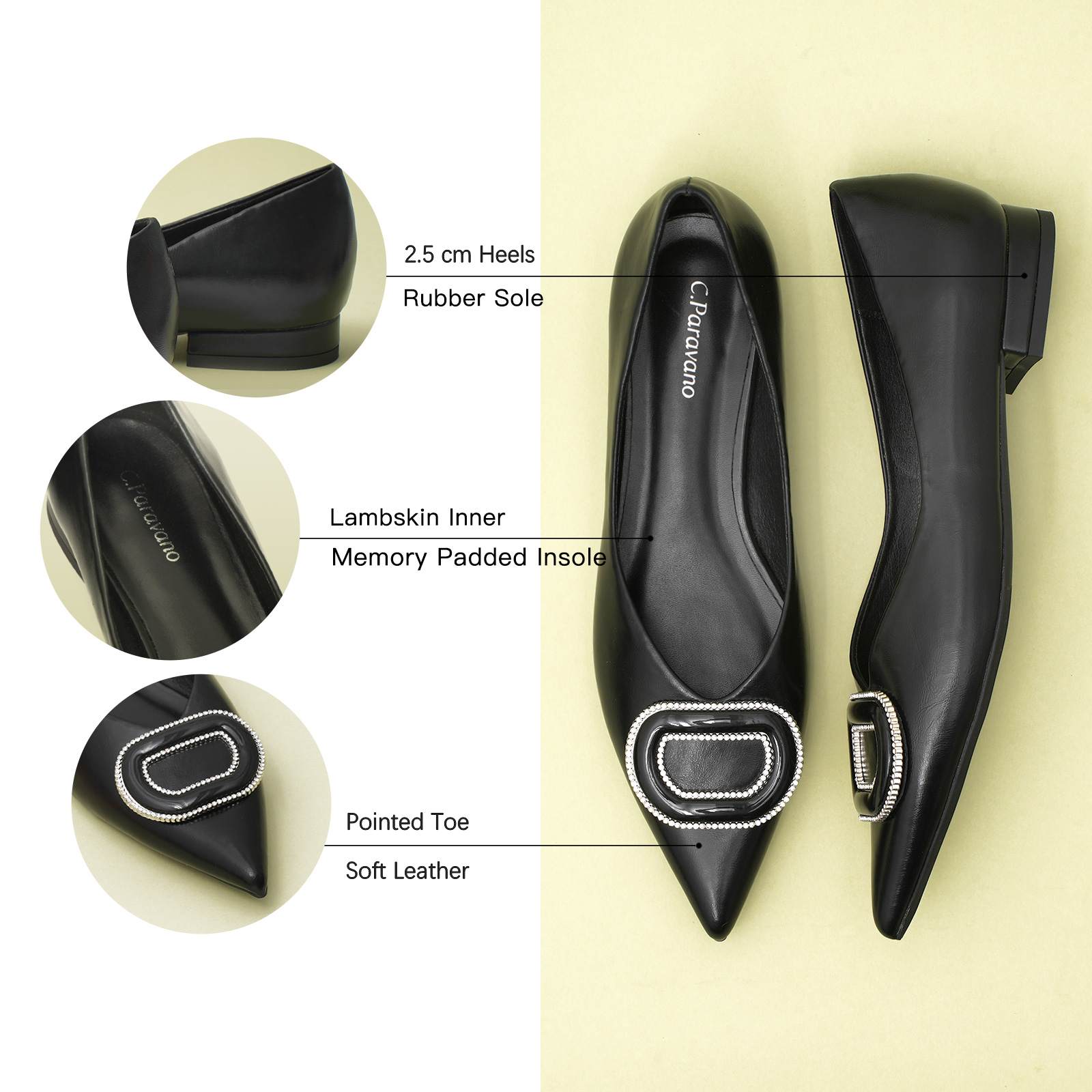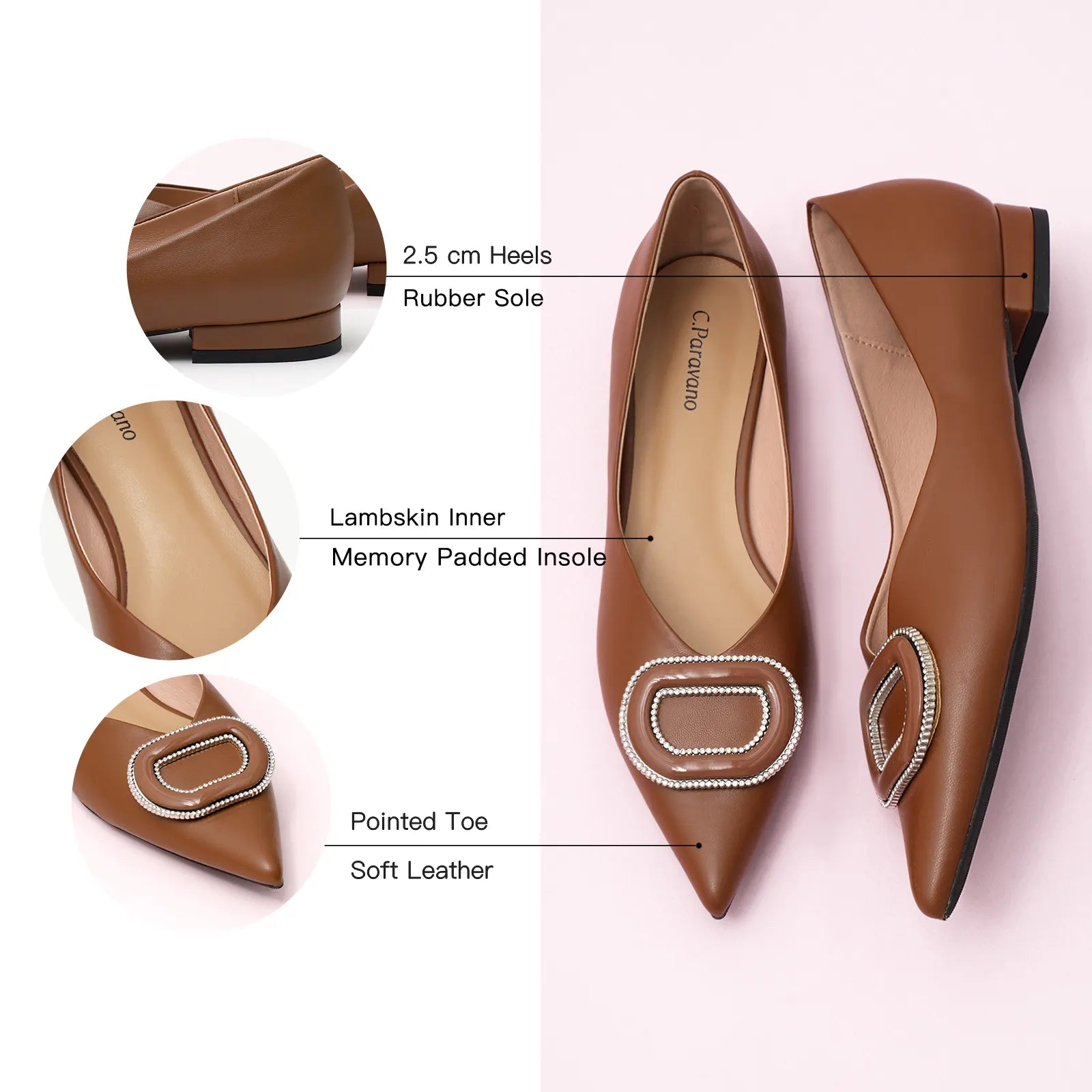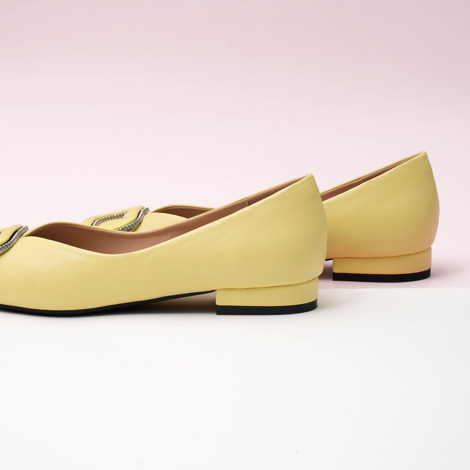- Clean and chic, these soft leather flats will quickly become an essential part in your workwear wardrobe. Timeless pointed-toes create an sophisticated profile that is further enhanced with distinctive buckle embellishment and a grippy sole adorned with iconic prints. However you choose to wear them, they will look elegant.