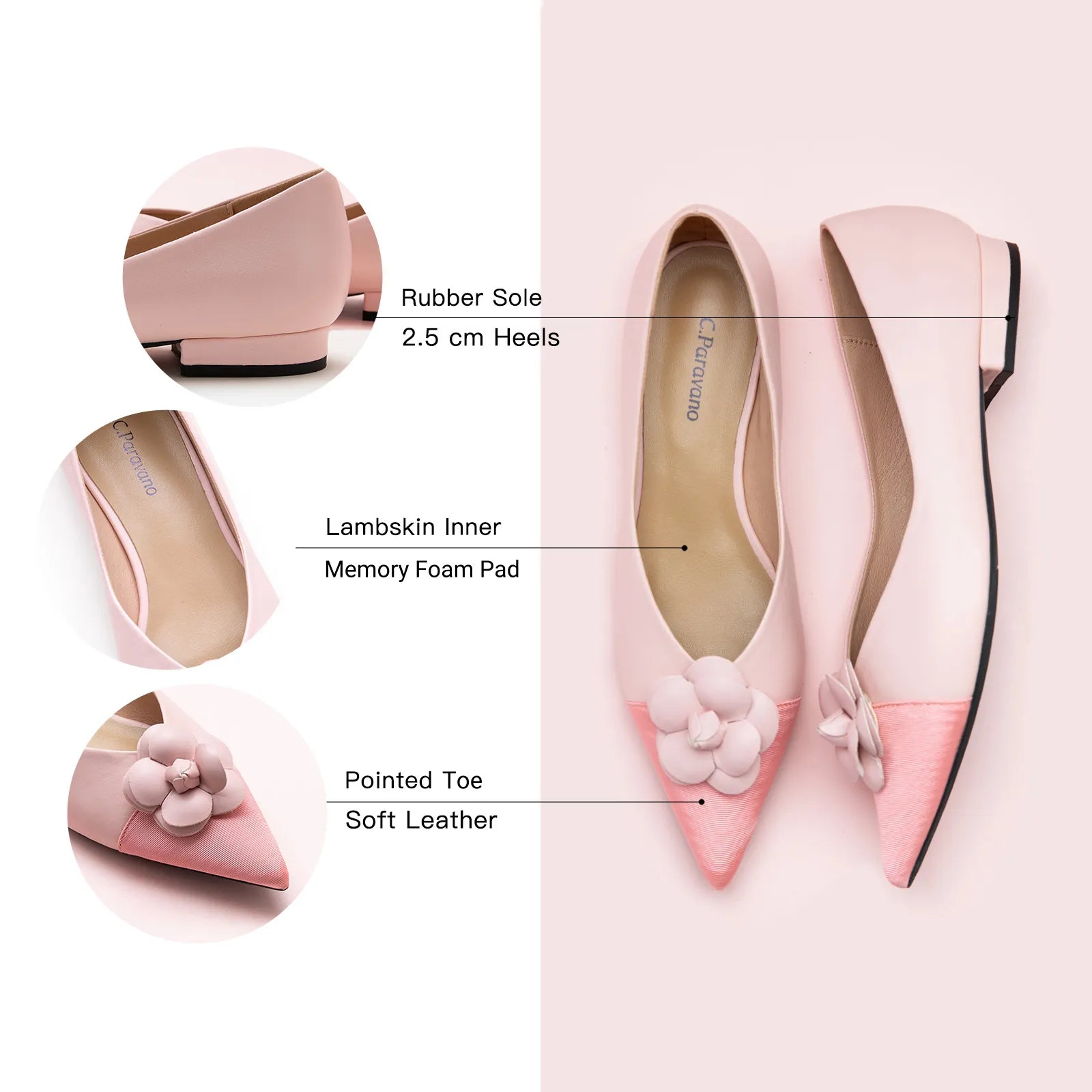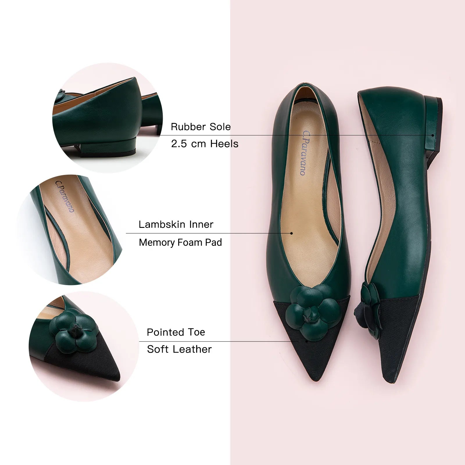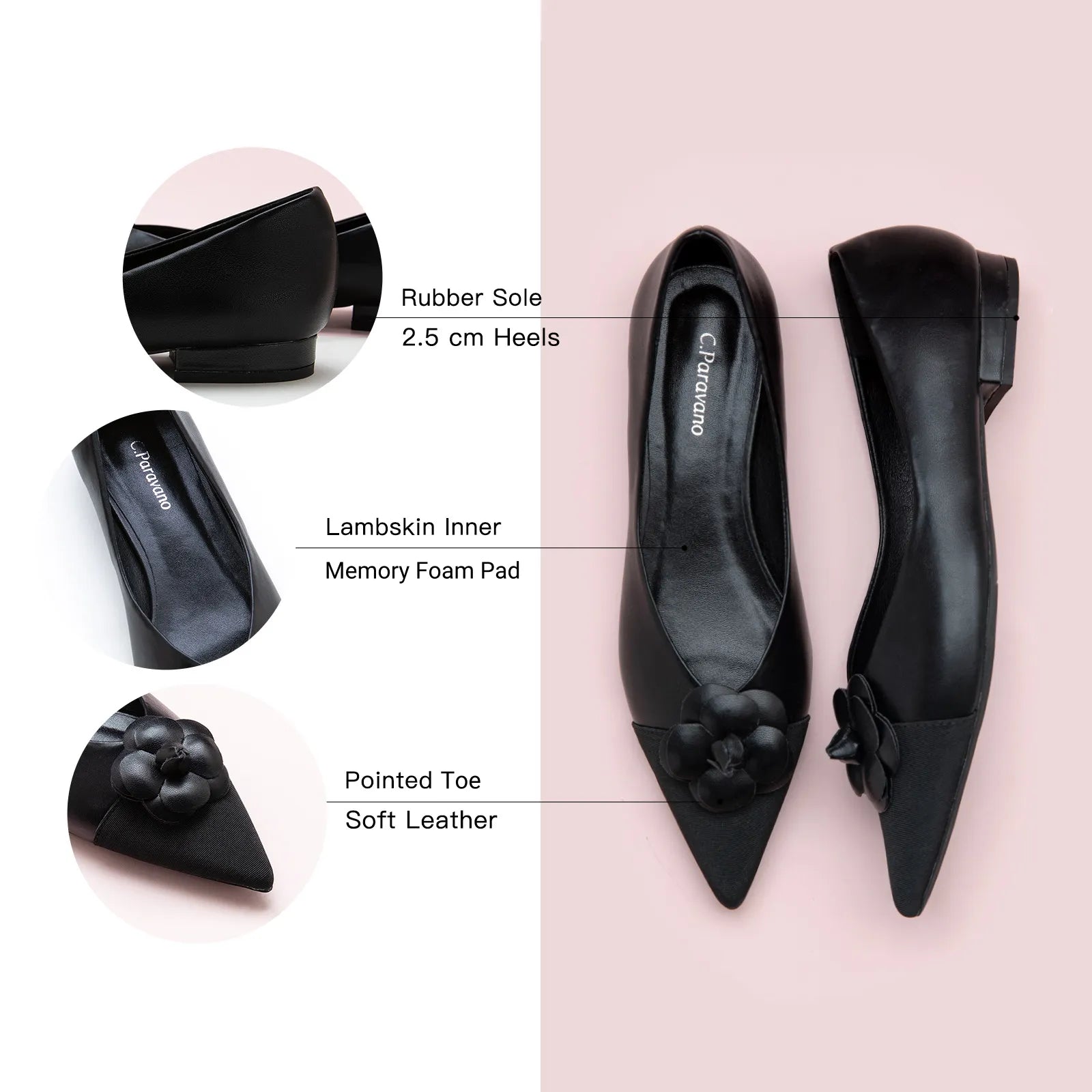 The Camellia Soft Leather Flats are made with soft micro fiber upper, set on flat heels with the pointed toe and accent with the elegant floral decor on the toe.