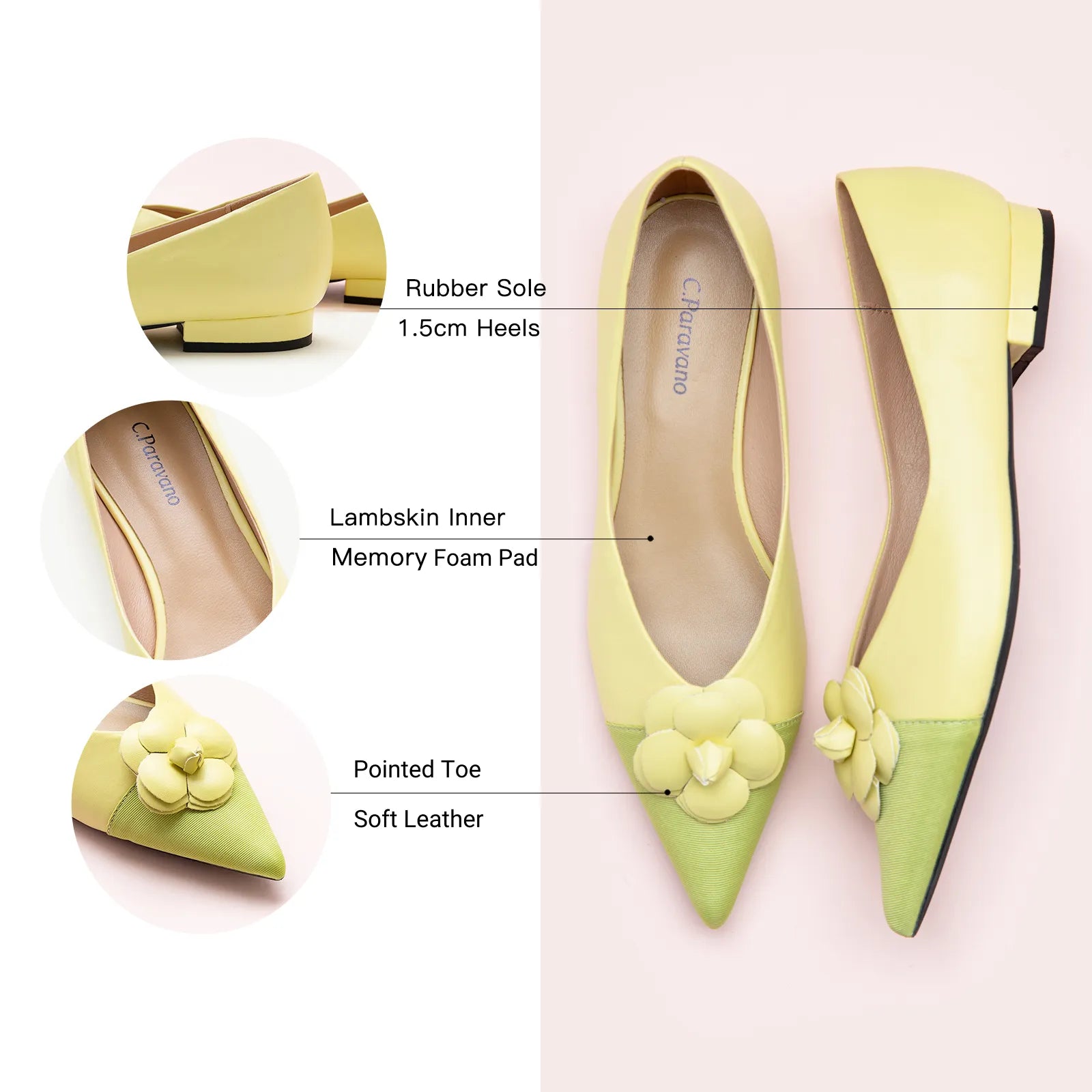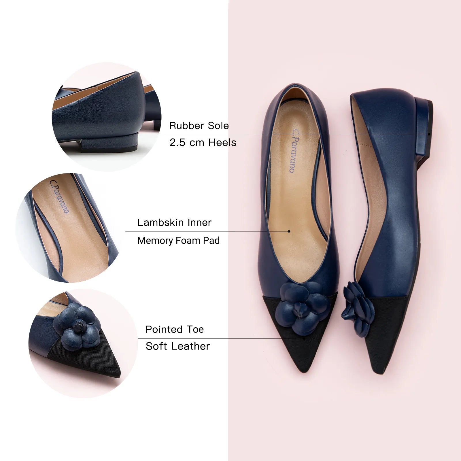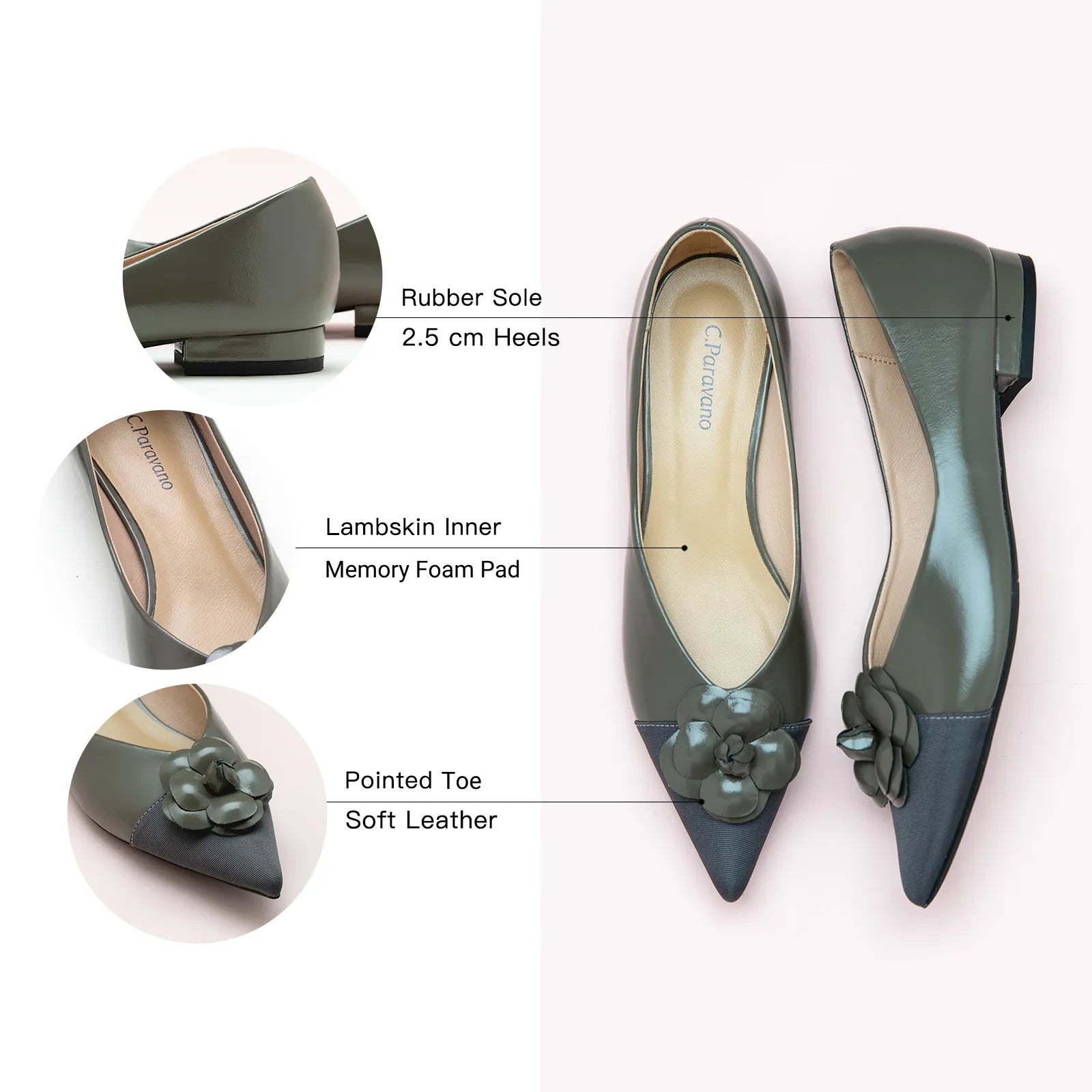 The Camellia Soft Leather Flats are made with soft micro fiber upper, set on flat heels with the pointed toe and accent with the elegant floral decor on the toe.