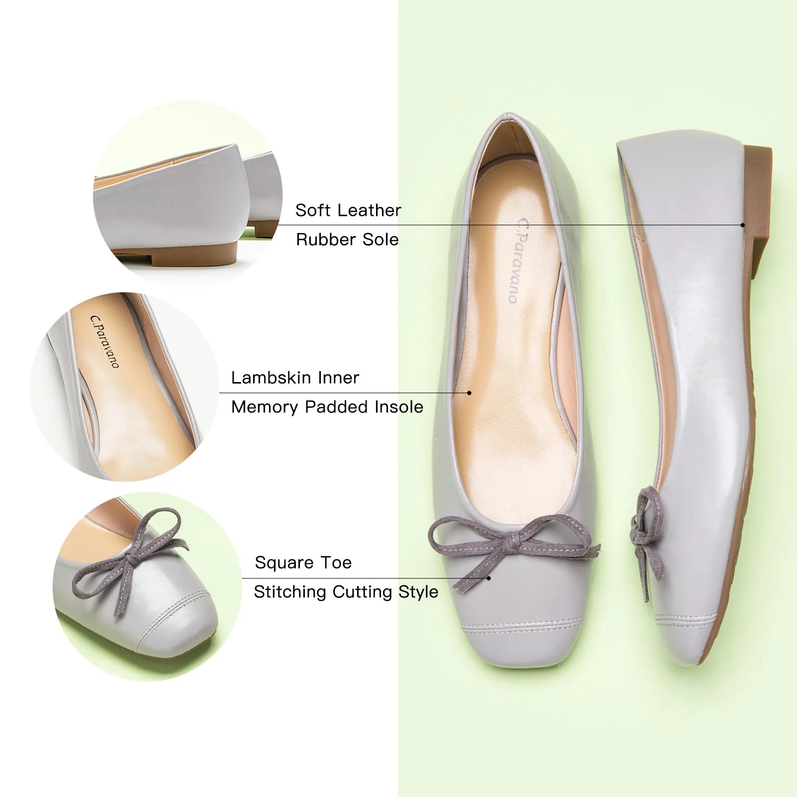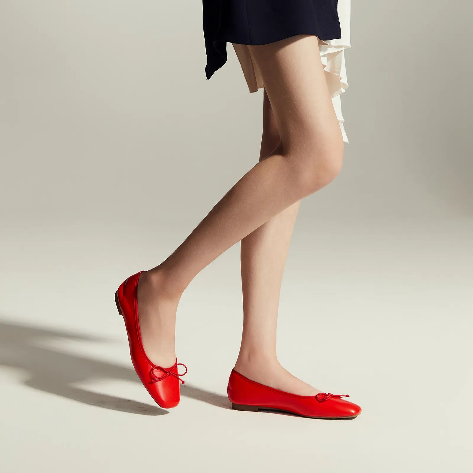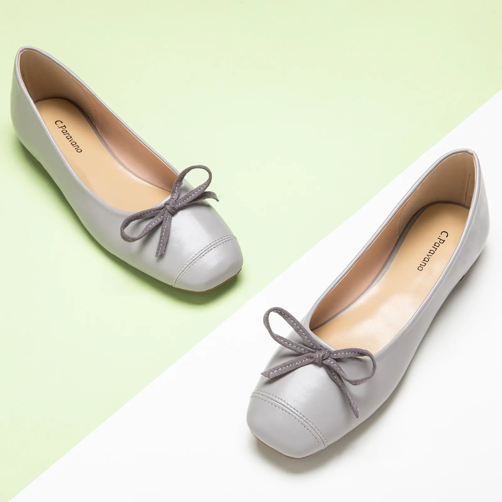 Features a squared-toe ballet flat, a subtle yet distinctive element that adds a touch of modernity to the classic design. The splicing design of the toe and the shoe body presents a structuralist aesthetic.