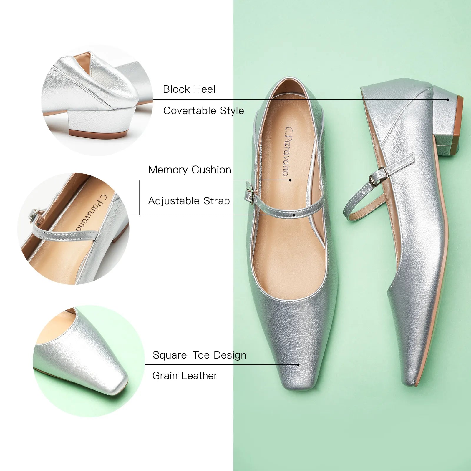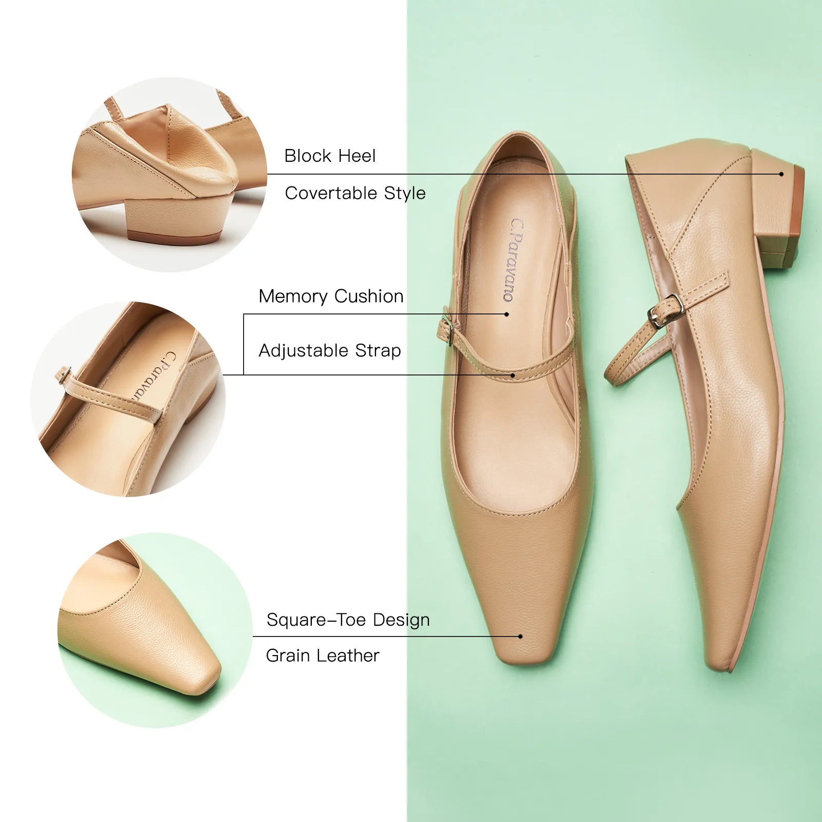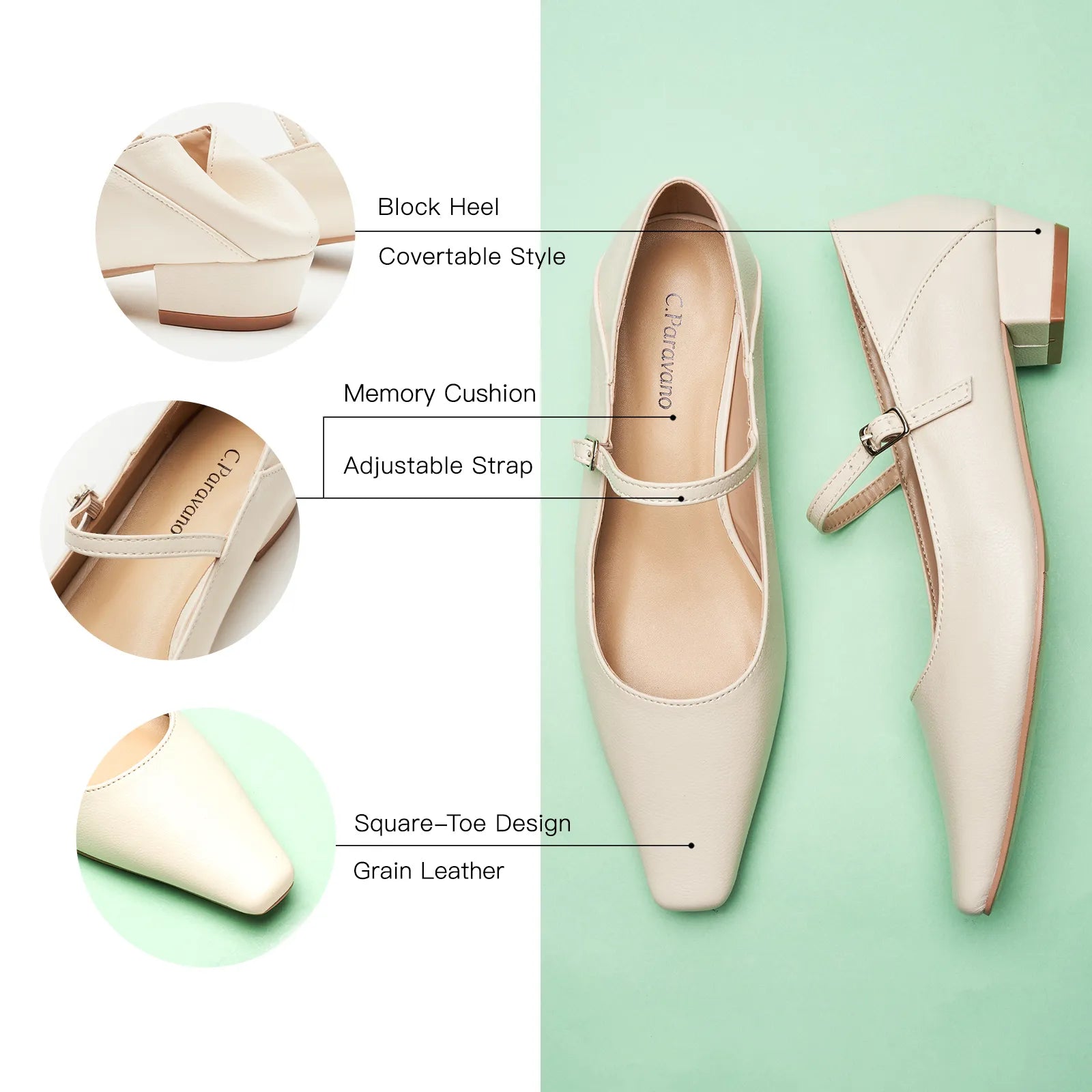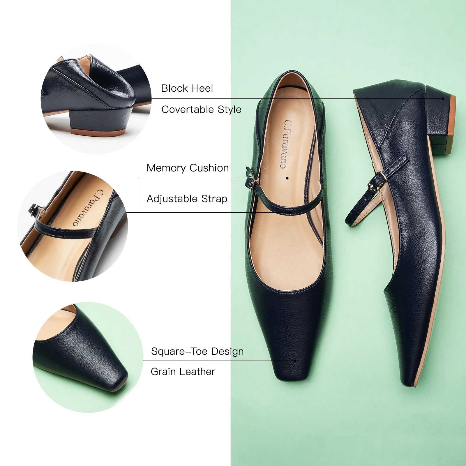 - With a soft leather finish, this pair’s refined texture exudes elegance and nobility, making it ideal for formal events. The foldable back pad adds mule-inspired ease, while the square toe ensures optimal comfort. Pair them with your favorite pantsuit or a pencil skirt for polished office days.