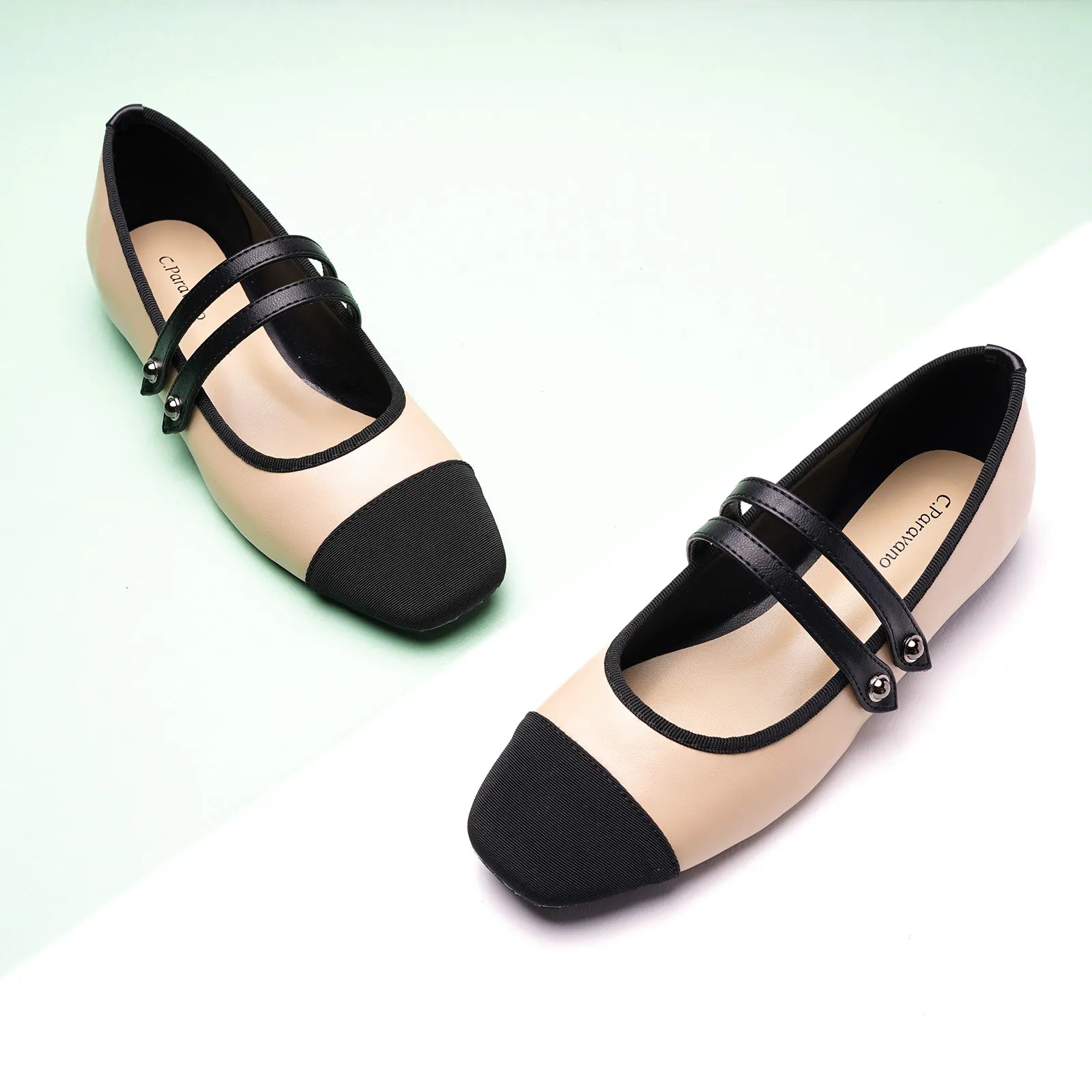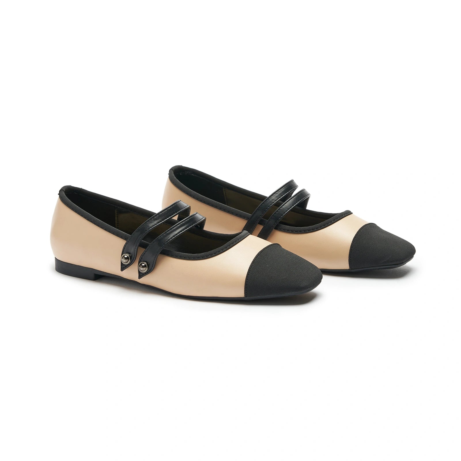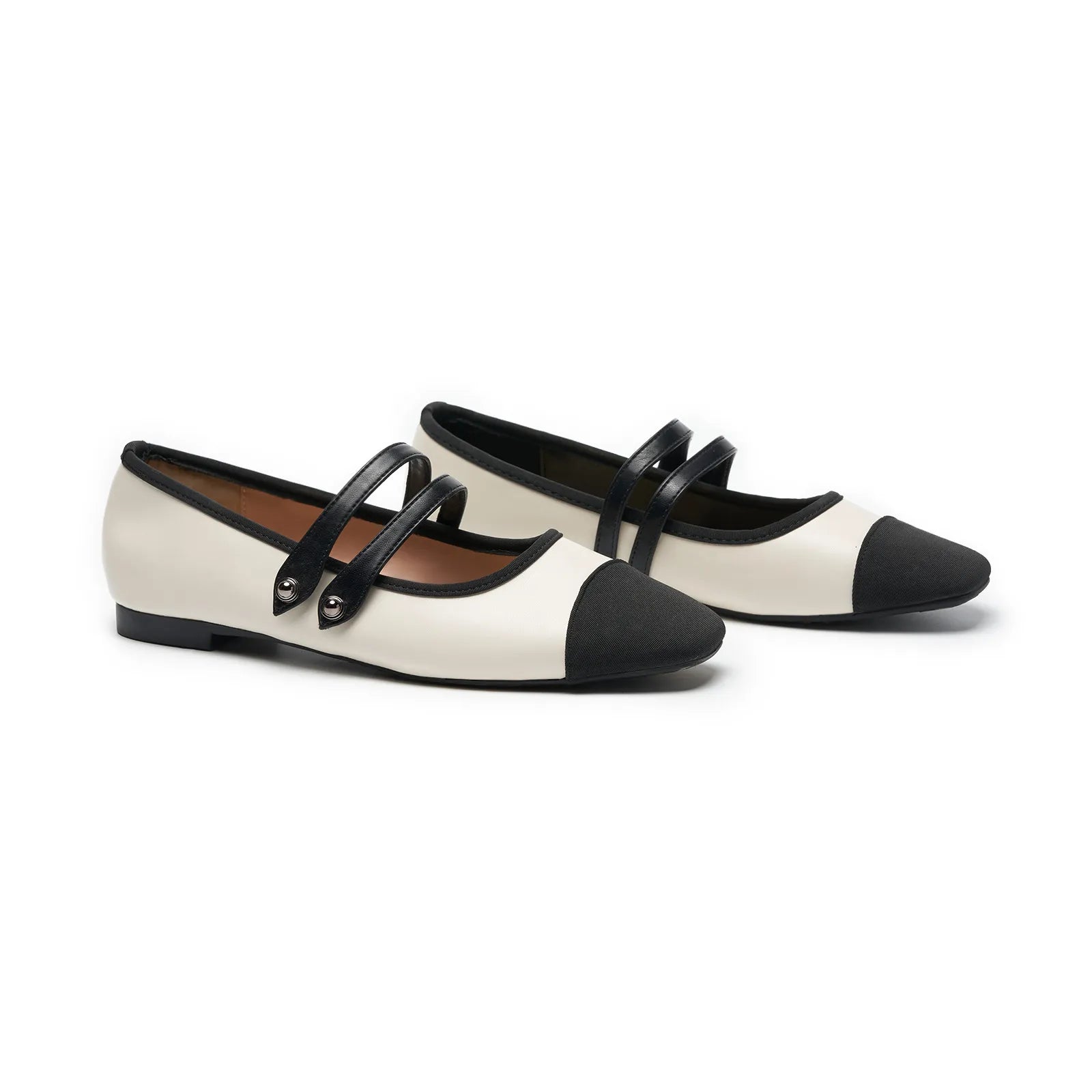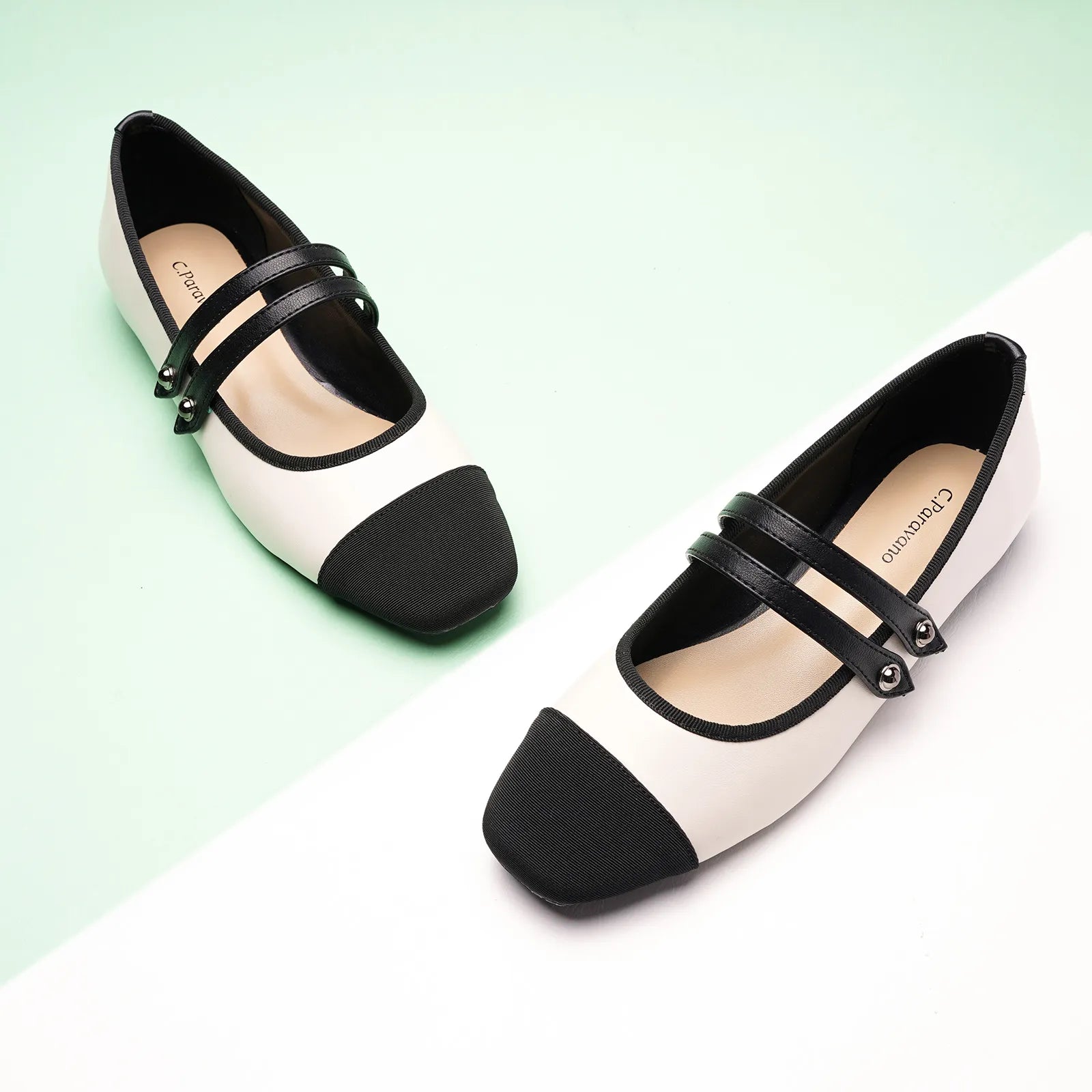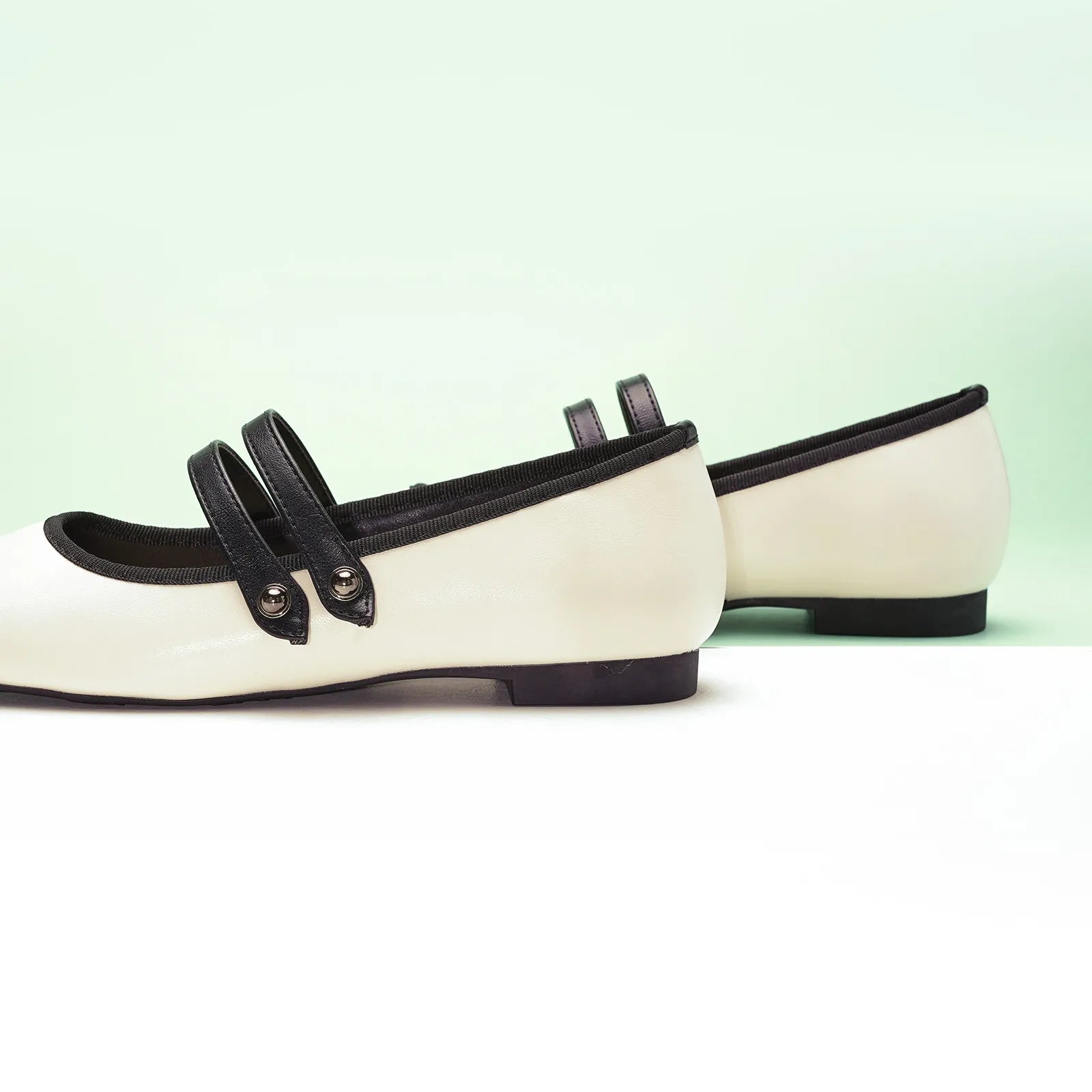 - Embrace a clean and classic aesthetic with these Mary Jane flats. They stand out with their two-tone design and textured finish. Featuring two elastic straps, they ensure a secure fit while adding a stylish flair to any outfit. The grippy sole, adorned with iconic prints, invites you to embark on an elegant and comfortable journey.