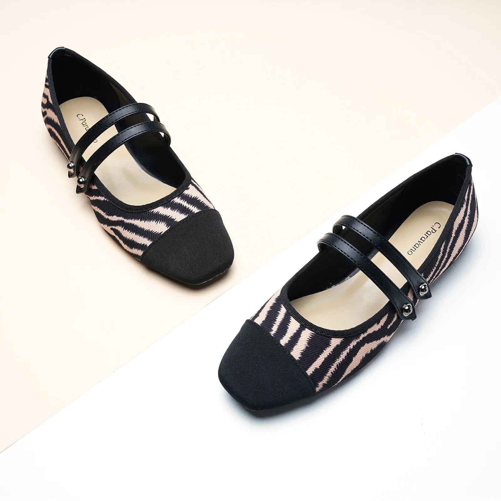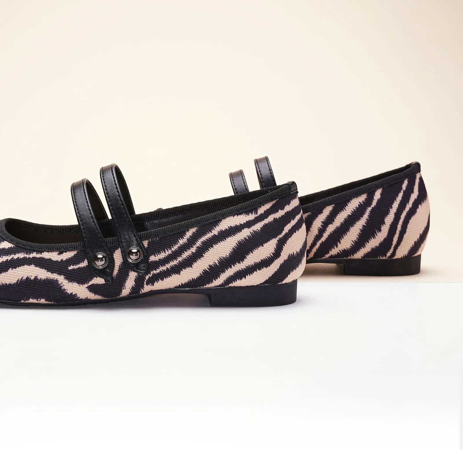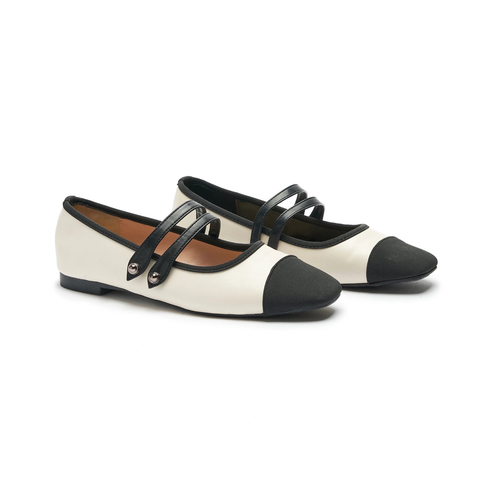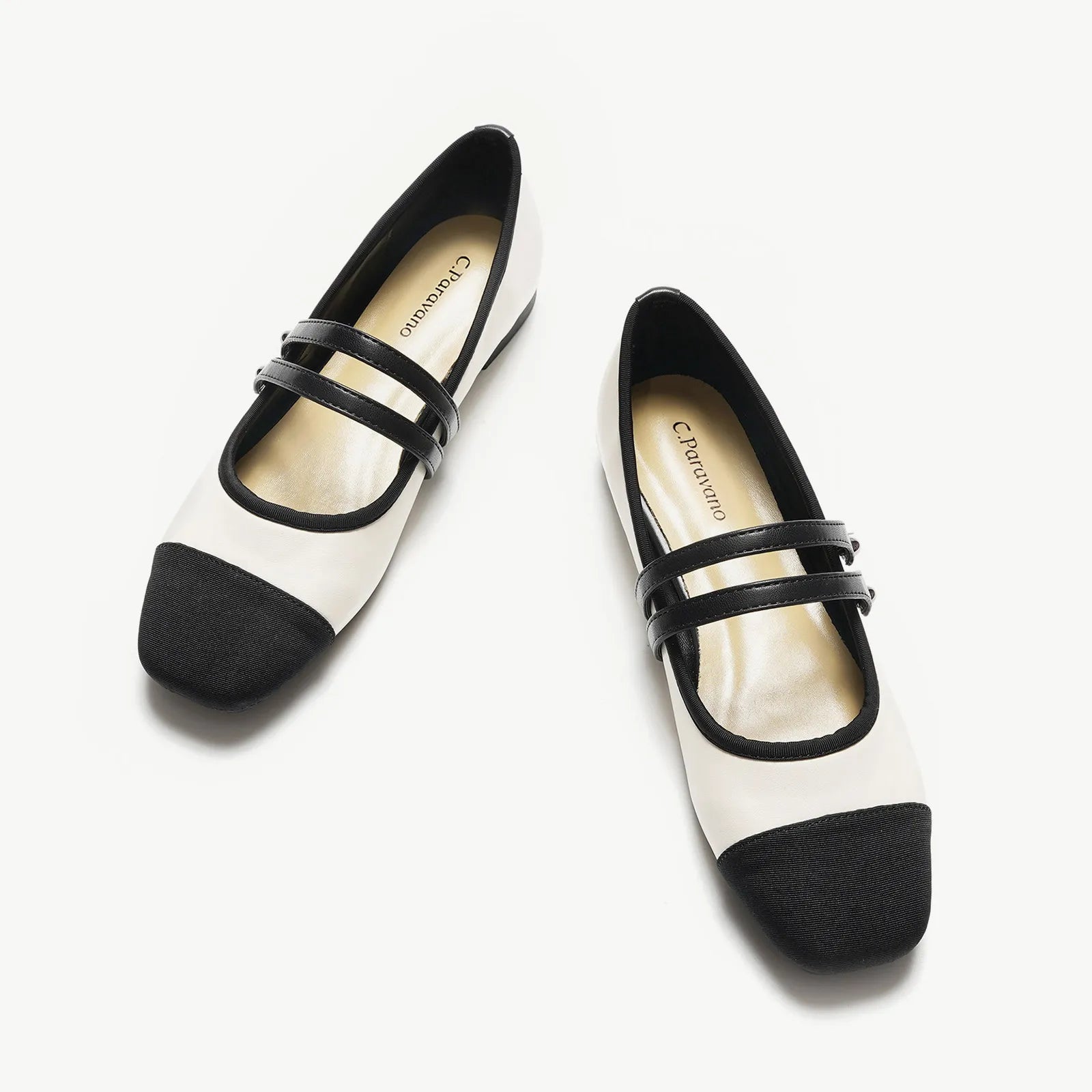 - Embrace a clean and classic aesthetic with these Mary Jane flats. They stand out with their two-tone design and textured finish. Featuring two elastic straps, they ensure a secure fit while adding a stylish flair to any outfit. The grippy sole, adorned with iconic prints, invites you to embark on an elegant and comfortable journey.
