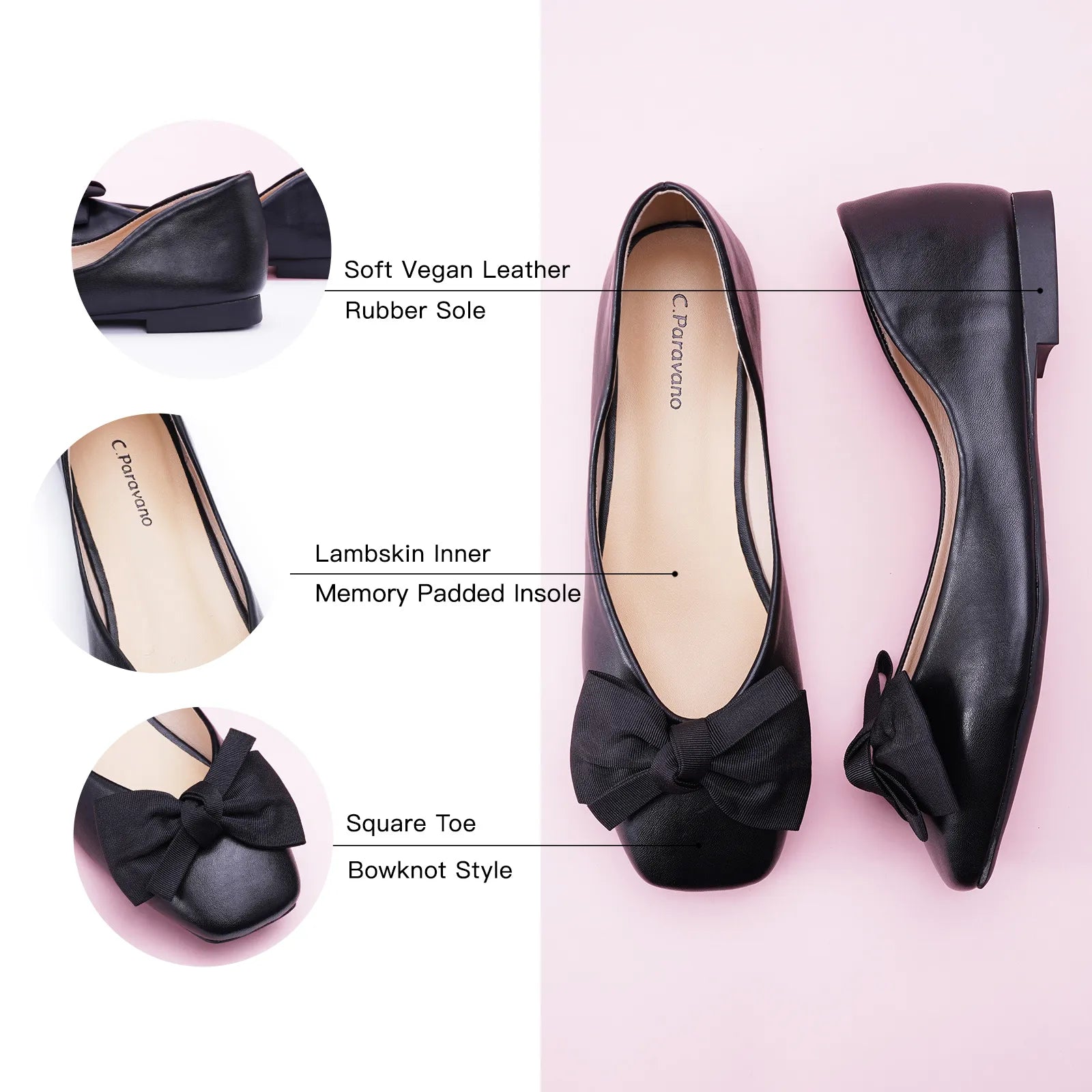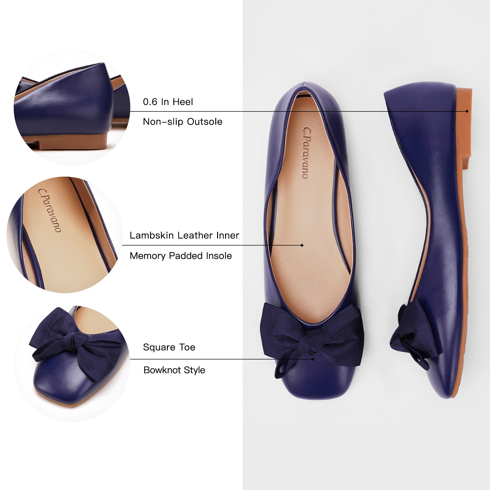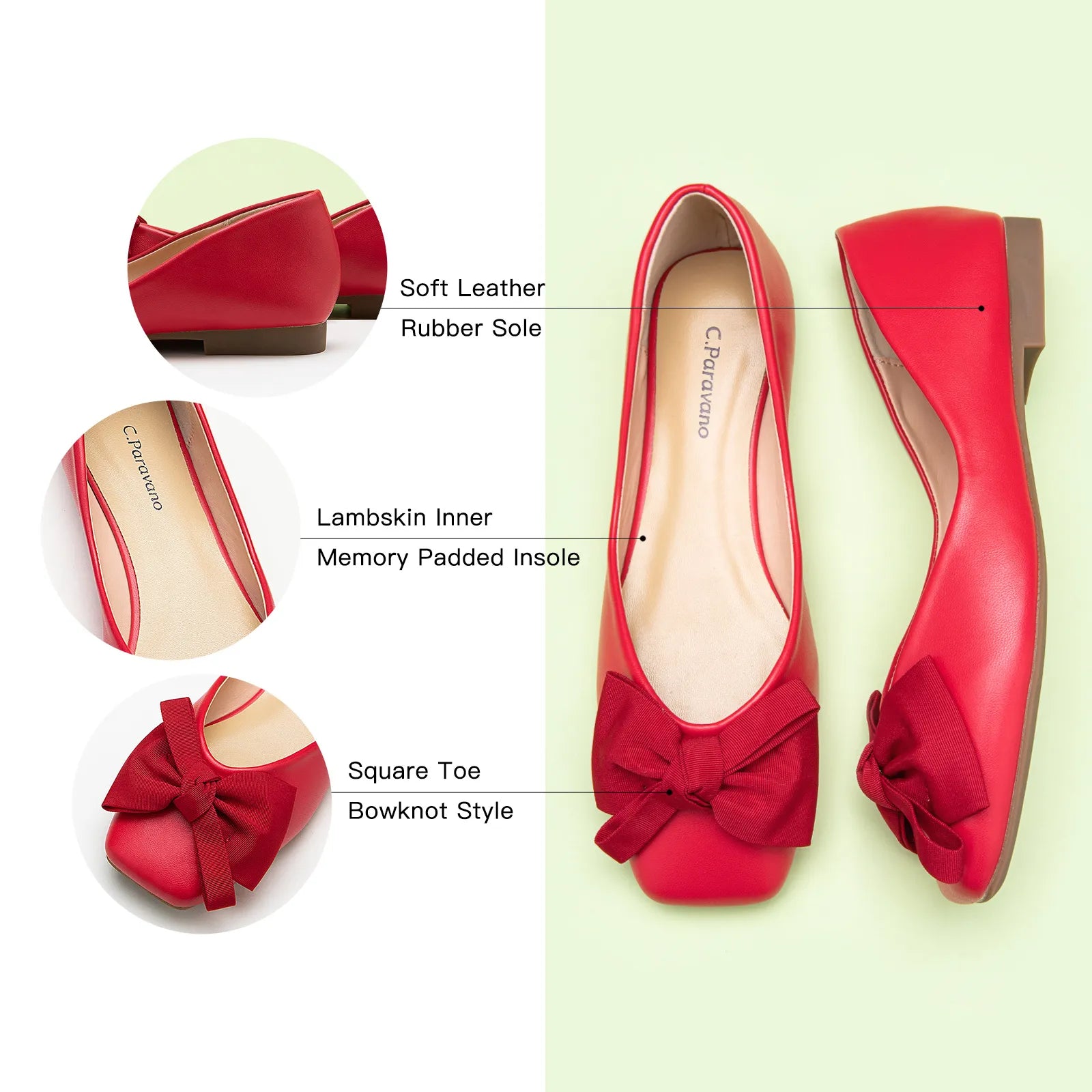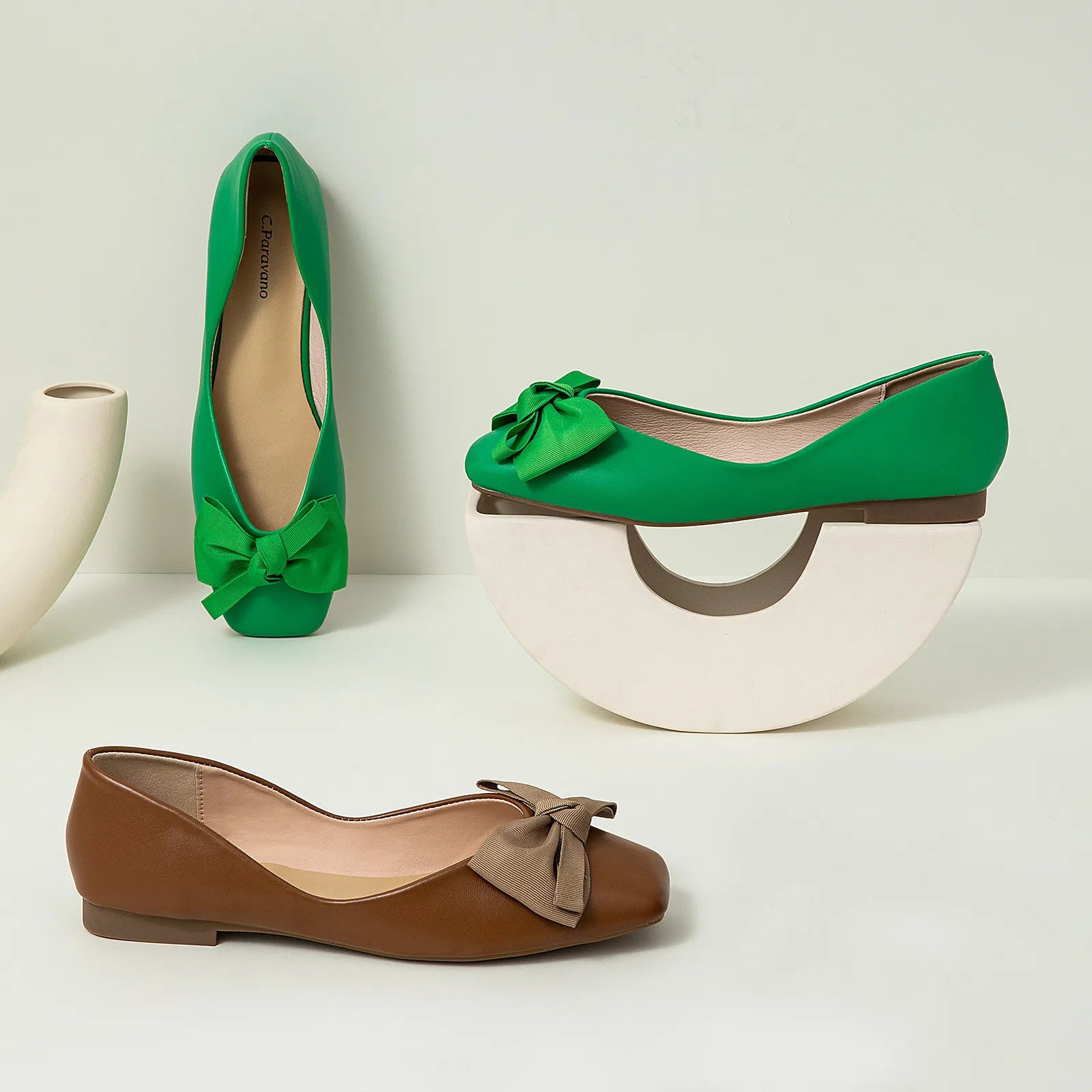Embrace the beauty of nature with these verdant green square-toe flats, featuring an elegant bowknot and crafted from soft, high-quality leather for a stylish and comfortable look.