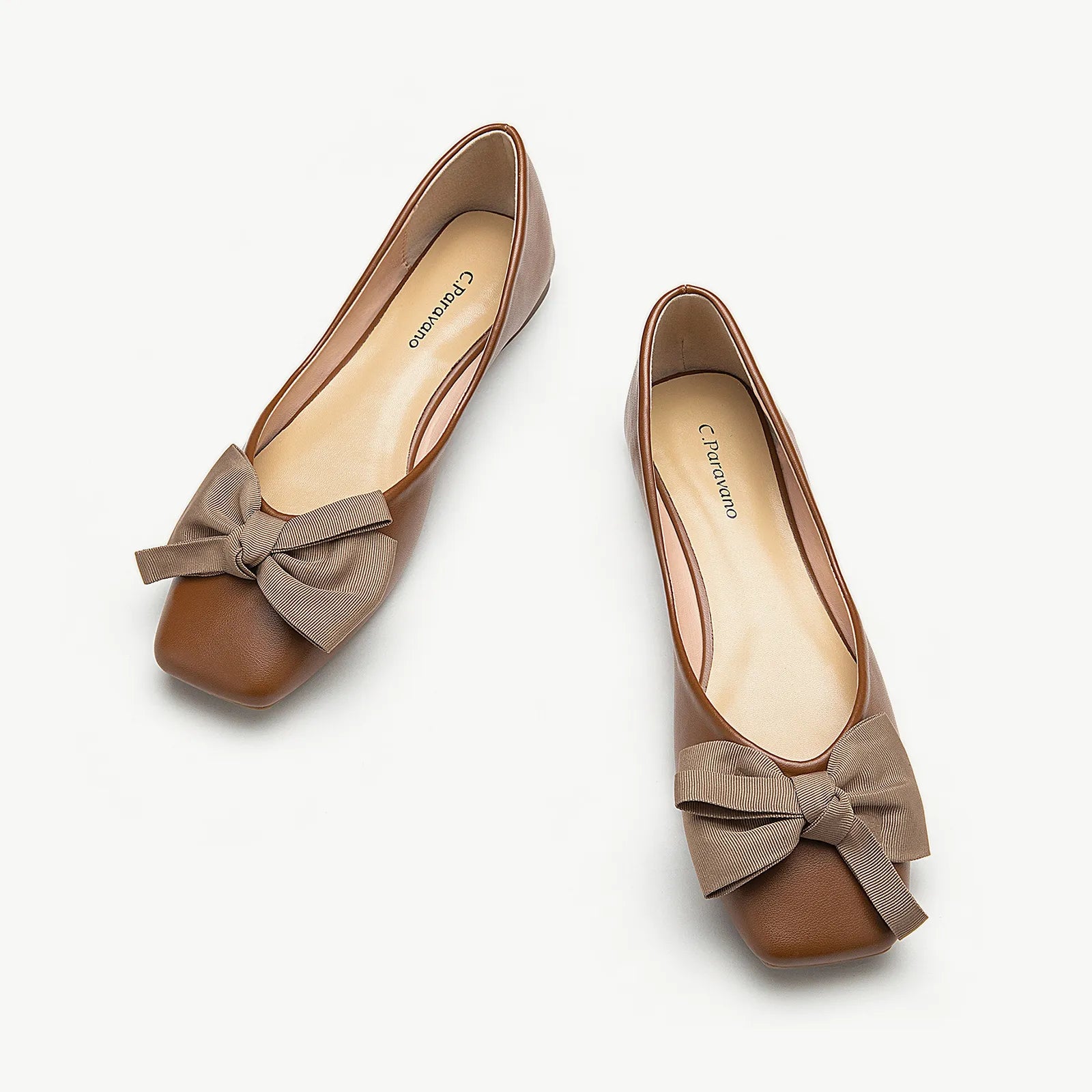 Neutral Tone Bowknot Square Flats: Embrace sophistication with these square-toe flats in a chic beige hue, adorned with a stylish bowknot, made from soft leather for a refined and understated appeal.