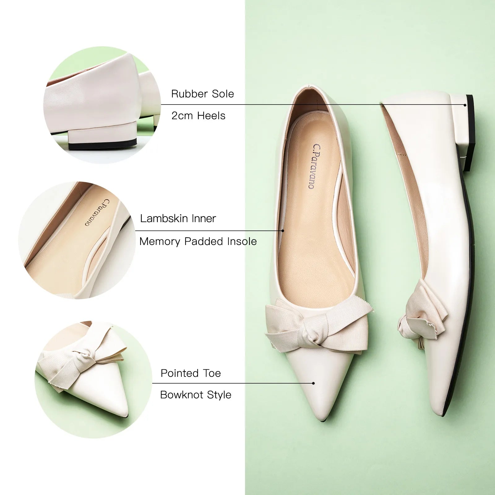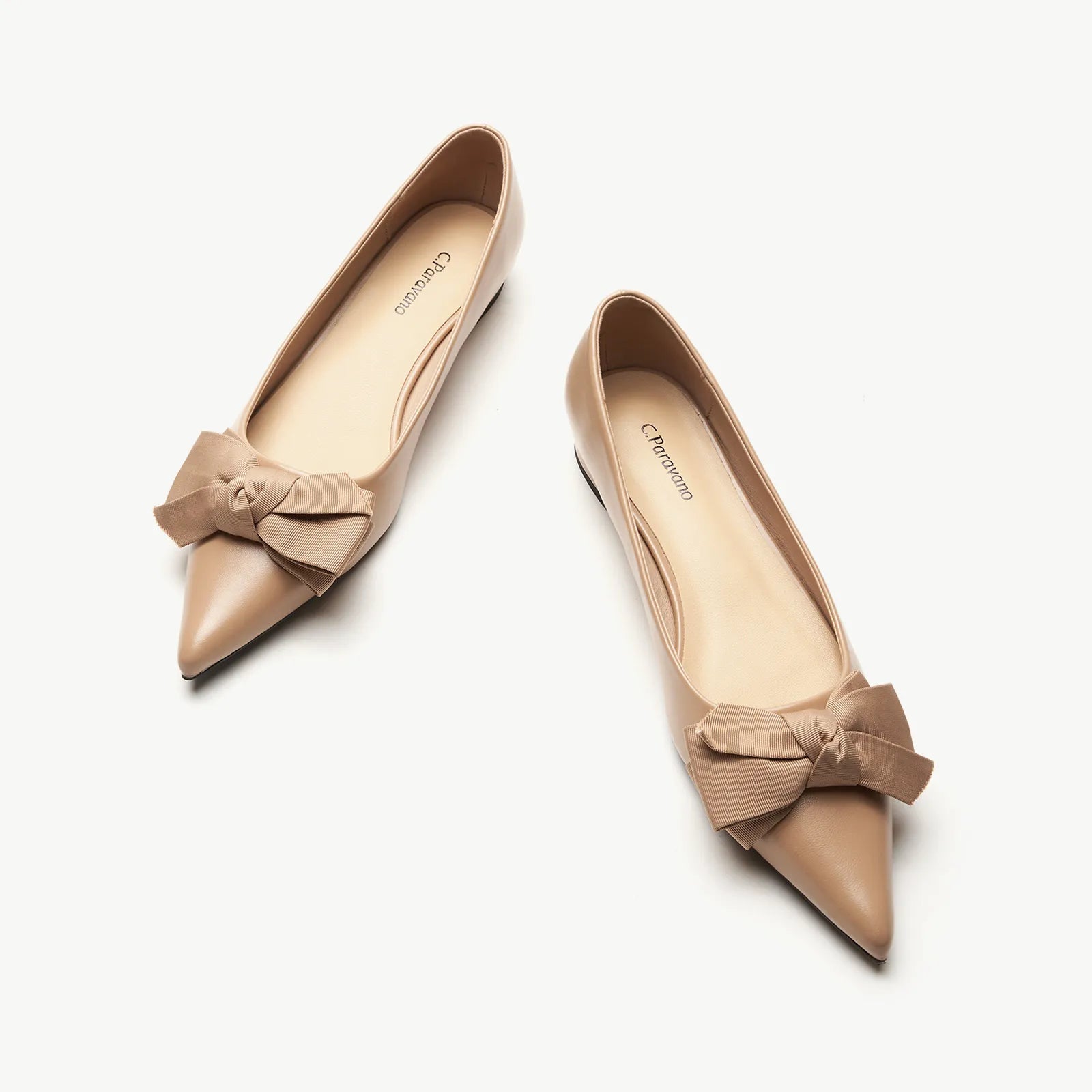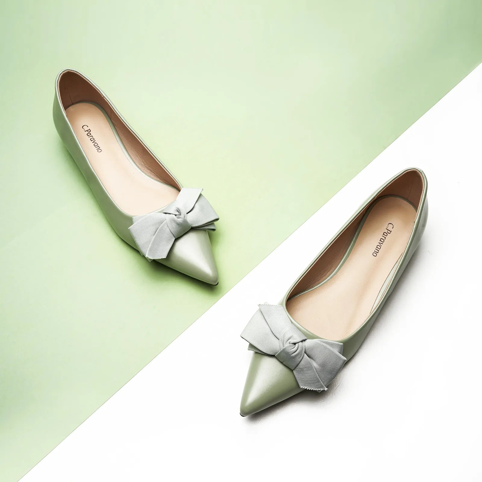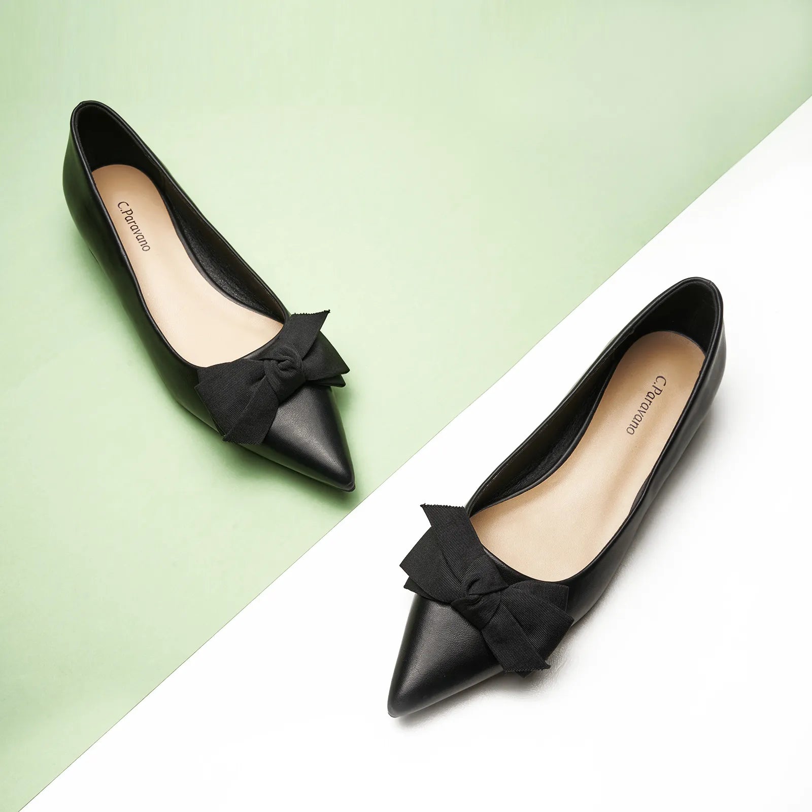 Grace your wardrobe with these matte pointed-toe flats. Fitting leather construction enhances the fit, and a grippy sole adorned with iconic prints ensure non-slip and wear resistance. Offset by a large cloth bow at the vamp, these flats capture attention with every step, striking the perfect balance between casual and elegant style.